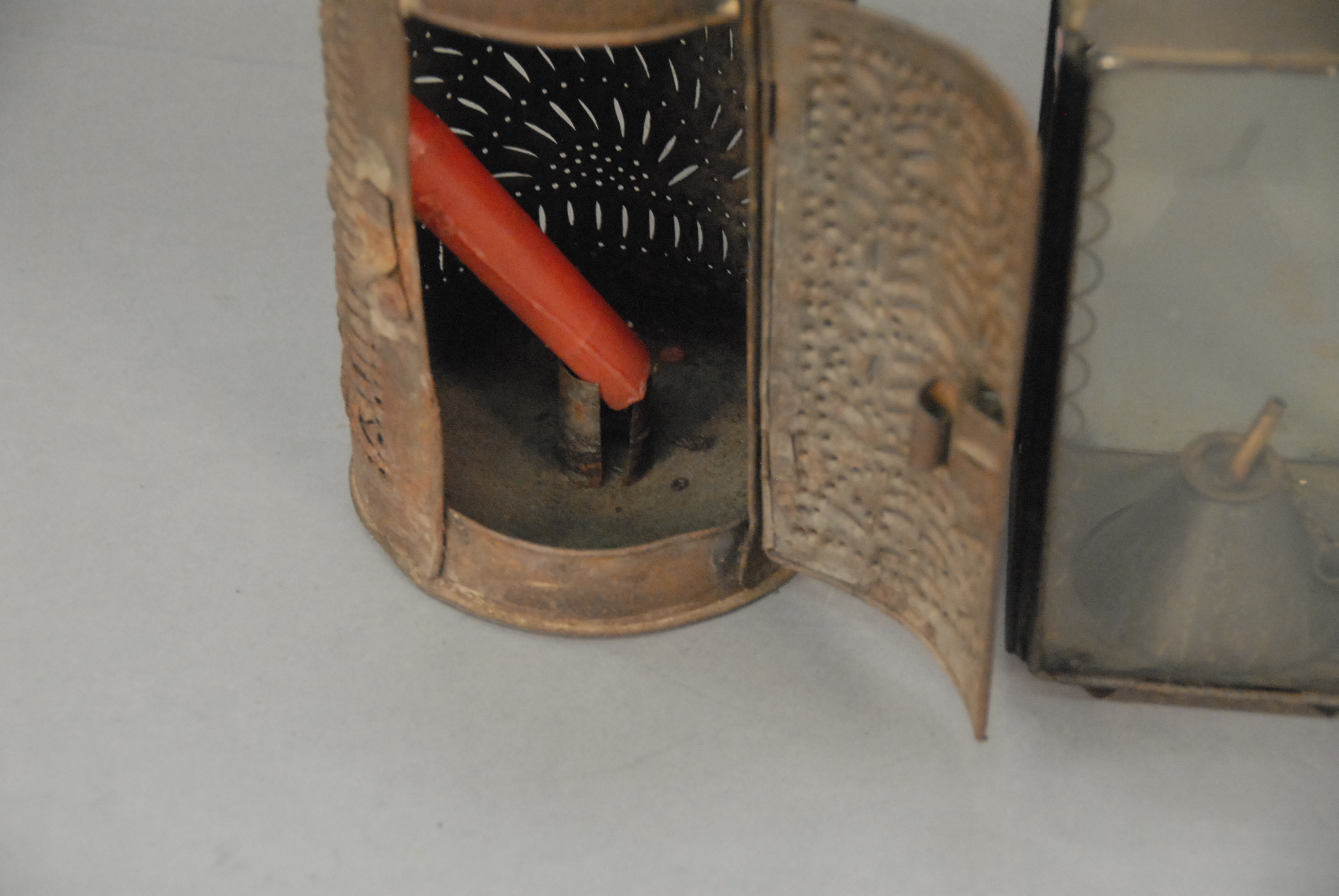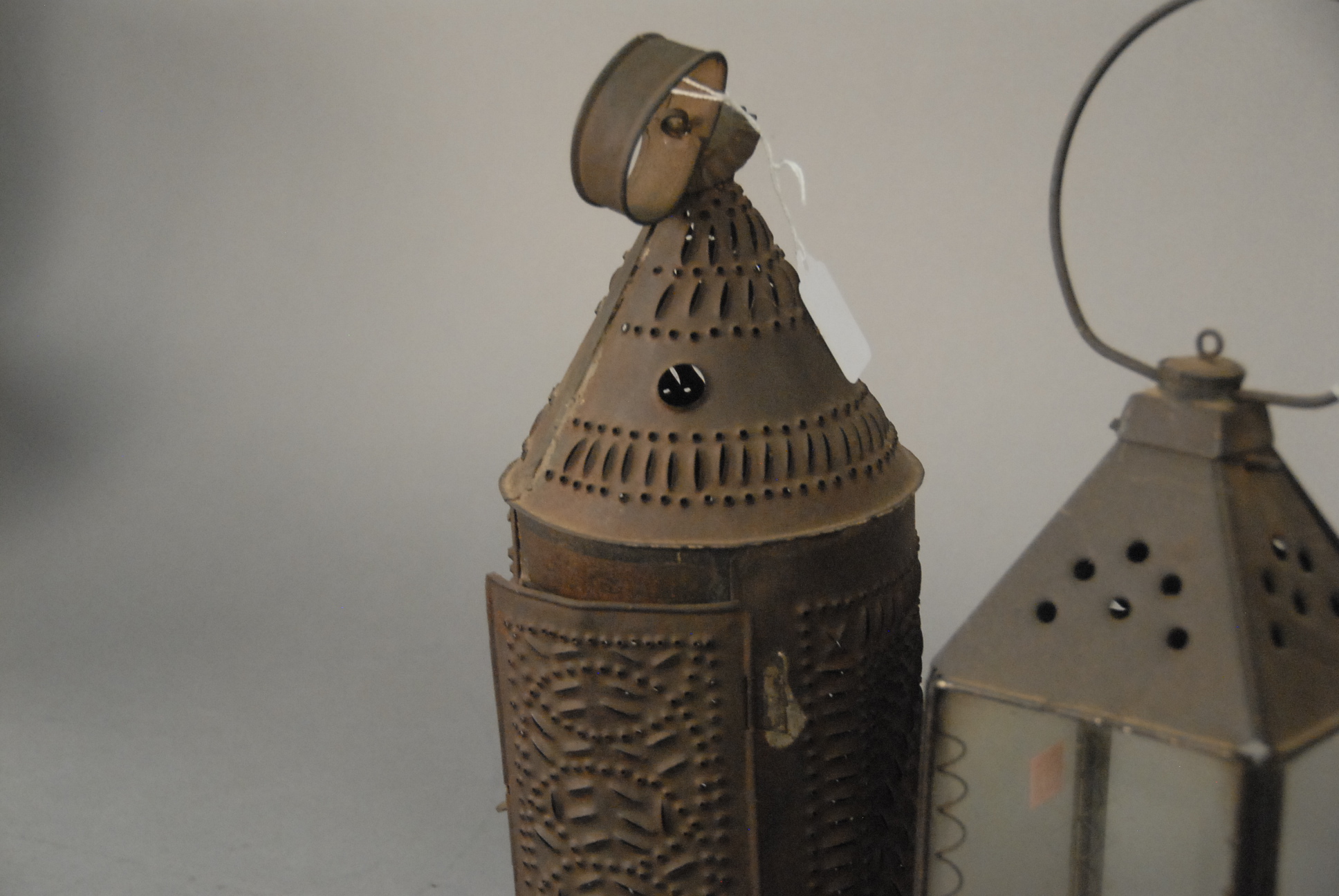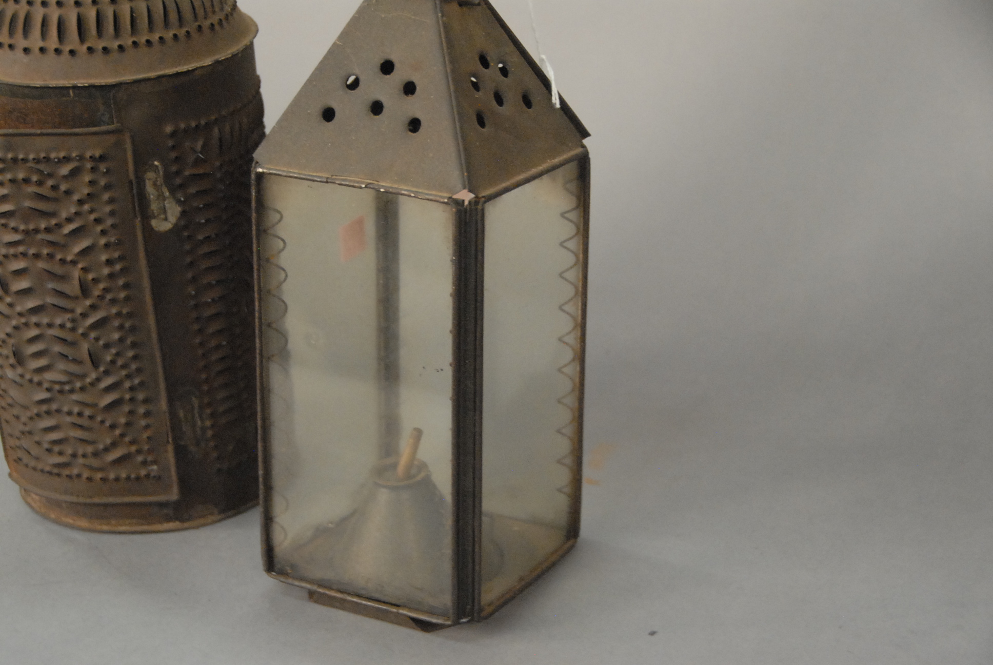 Two early lanterns including one pierced tin lantern and one tin and glass lantern with oil lamp in base. ht. 11 in. & ht. 13 in. Provenance: Property from the Estate of Elizabeth and Edward Wallace of The Tracy House in Meriden, Connecticut.