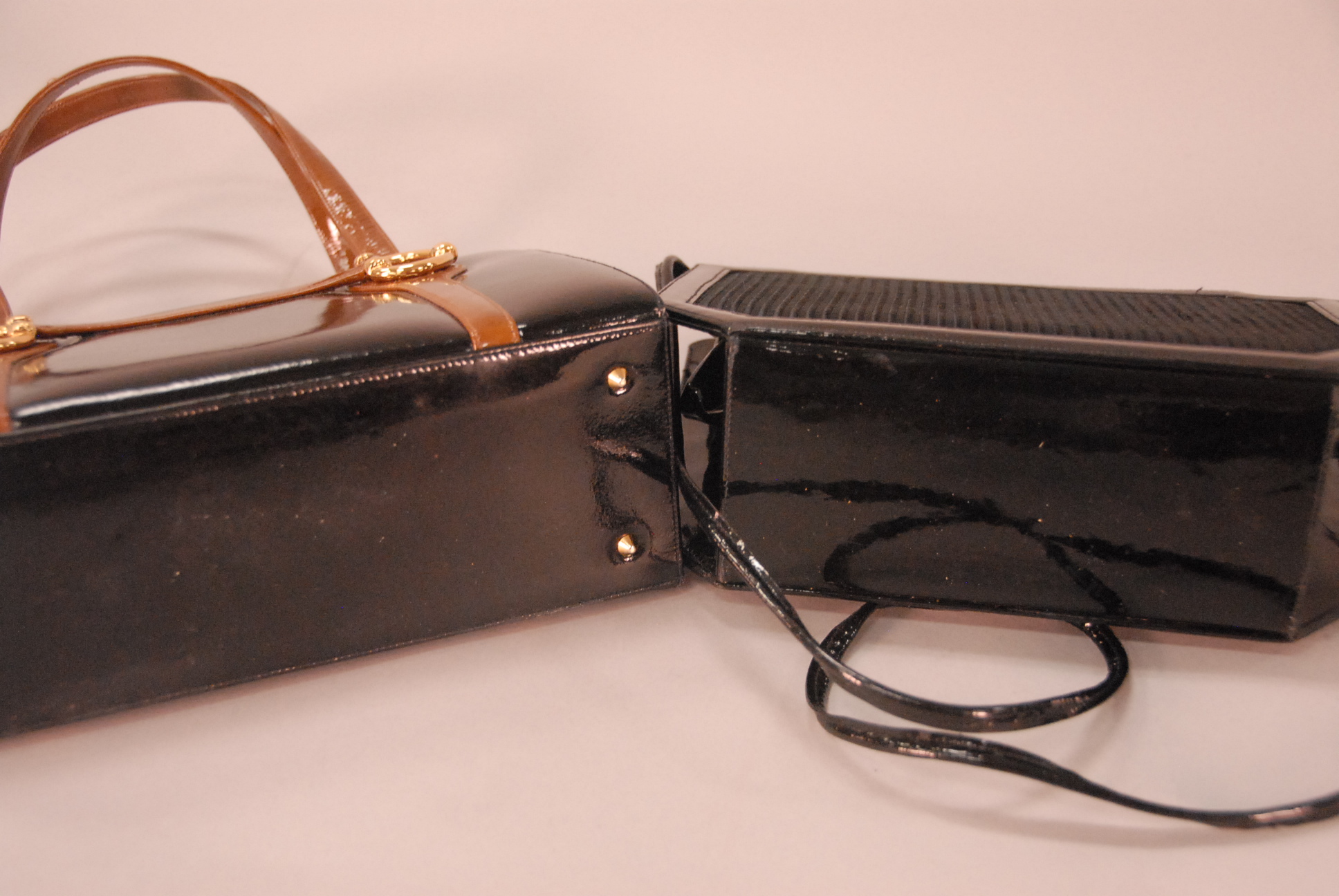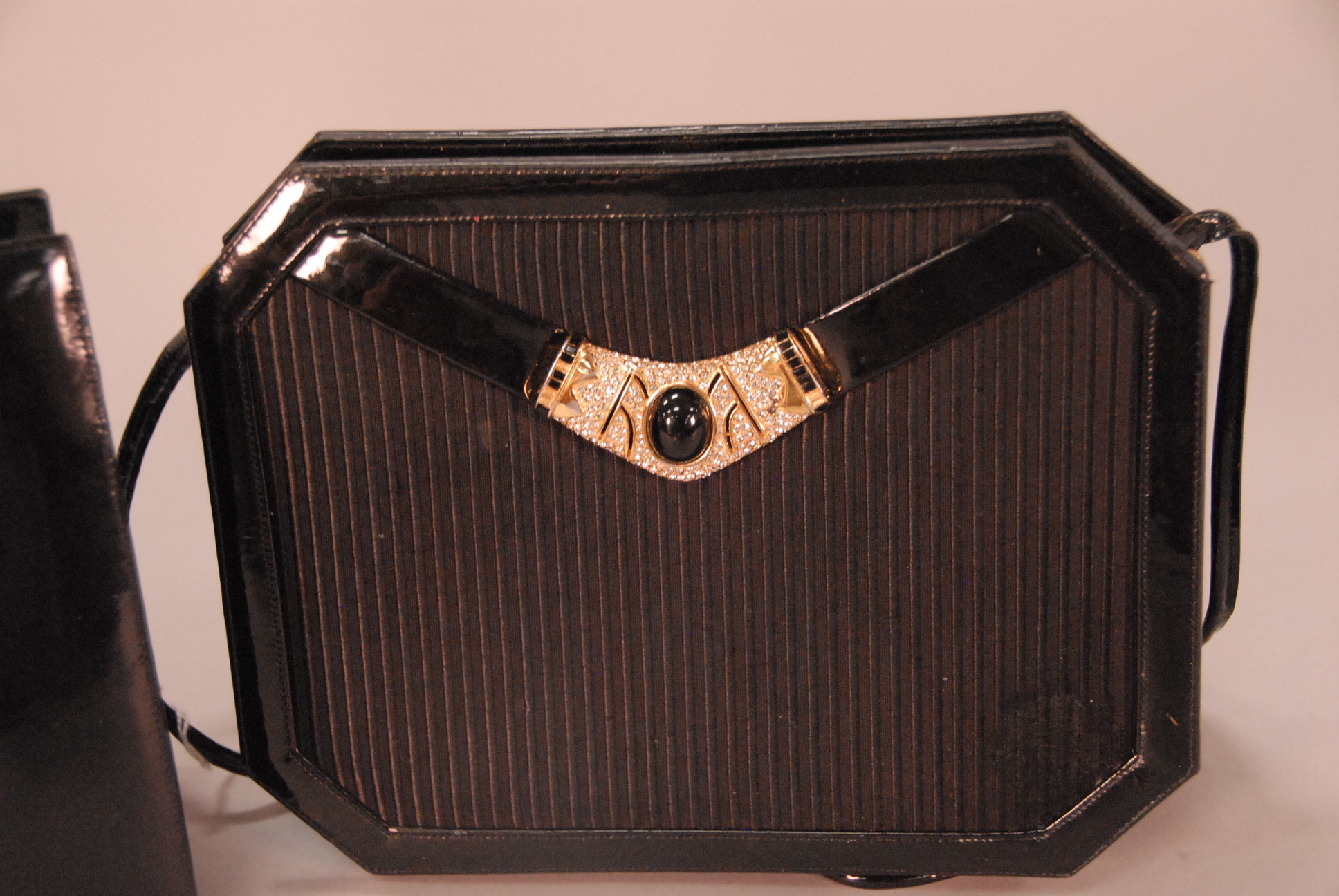 Lot 57: Two Martin Van Schaak purses, one with black and brown leather 7 1/2 x 9 1/2 and the other black satin and leather 7 x 9.