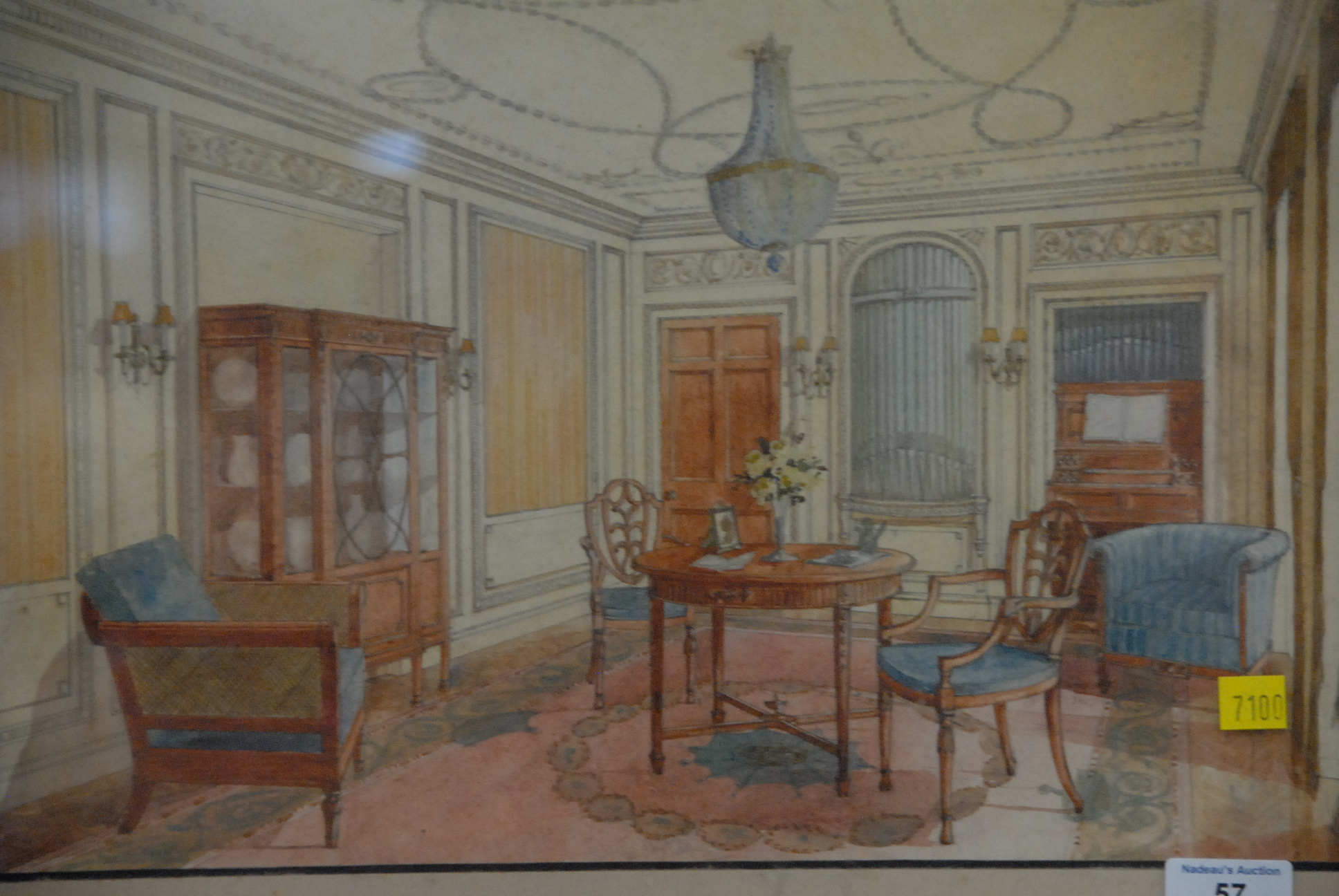 Lot 57: Two piece lot to include watercolor Victorian interior room unsigned 11 1/2 x 16 1/2 and watercolor of woman standing unsigned 11…