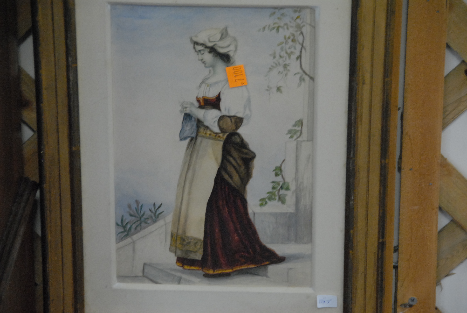 Two piece lot to include watercolor Victorian interior room unsigned 11 1/2 x 16 1/2 and watercolor of woman standing unsigned 11 x 7