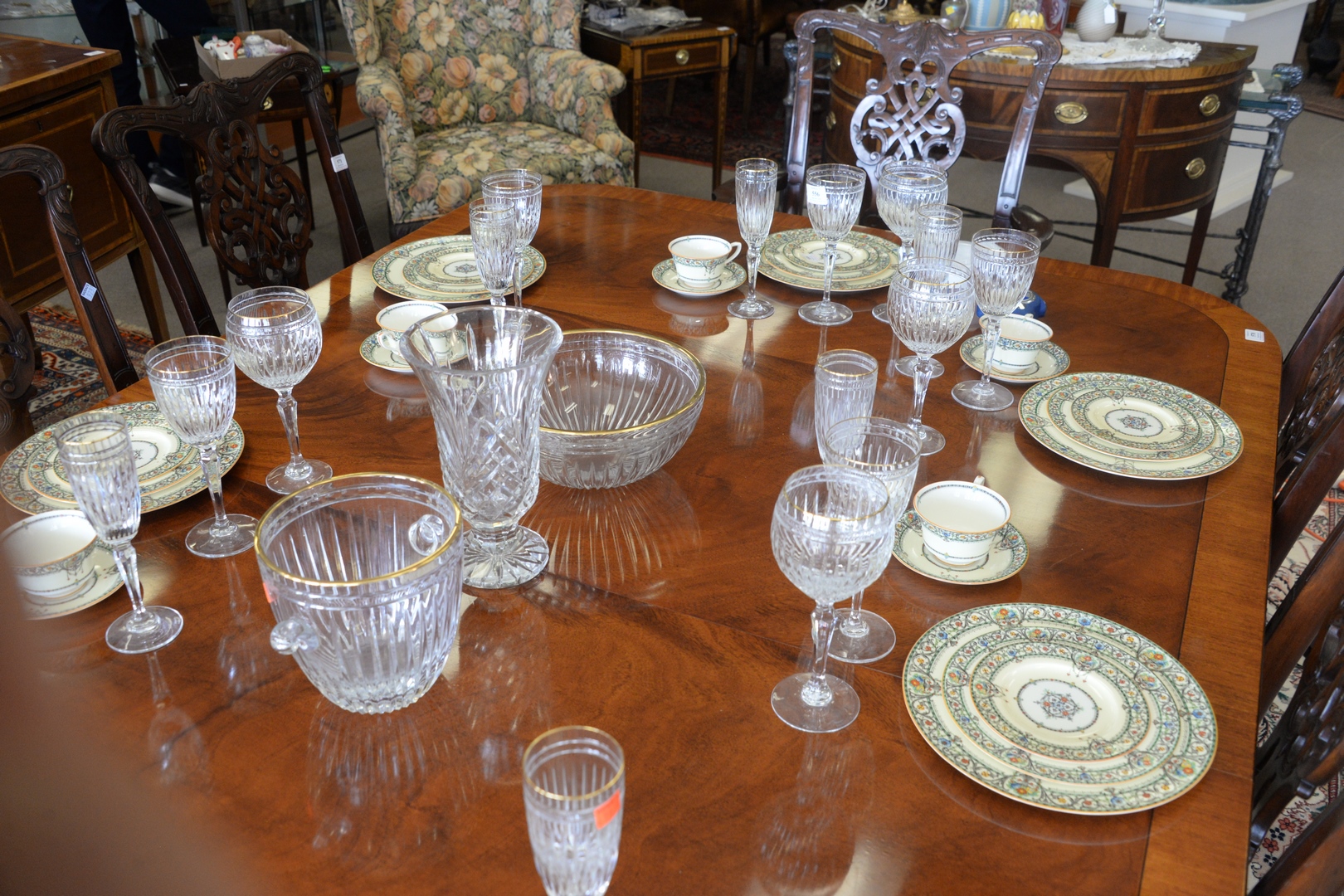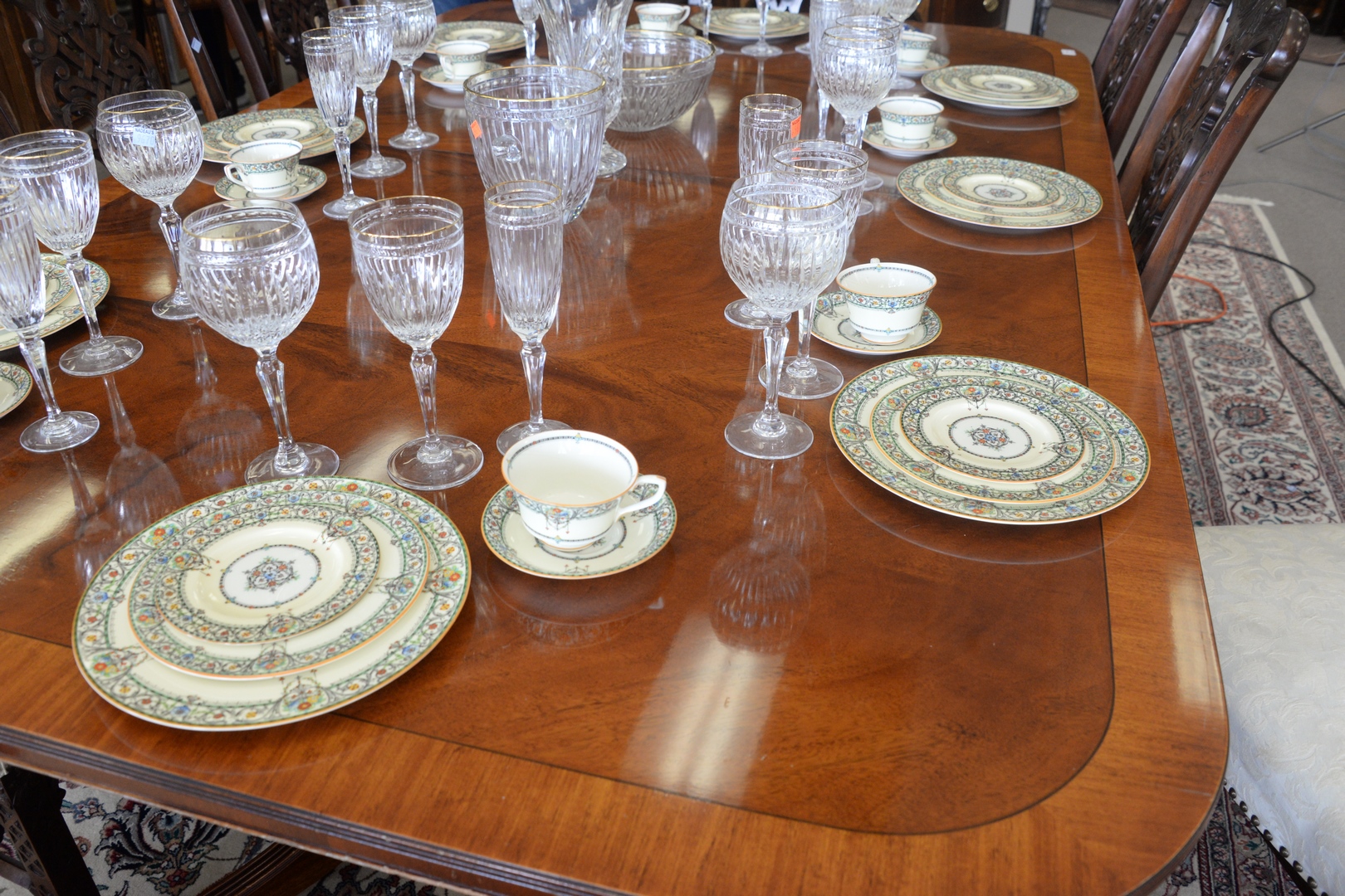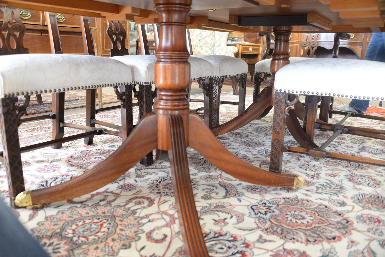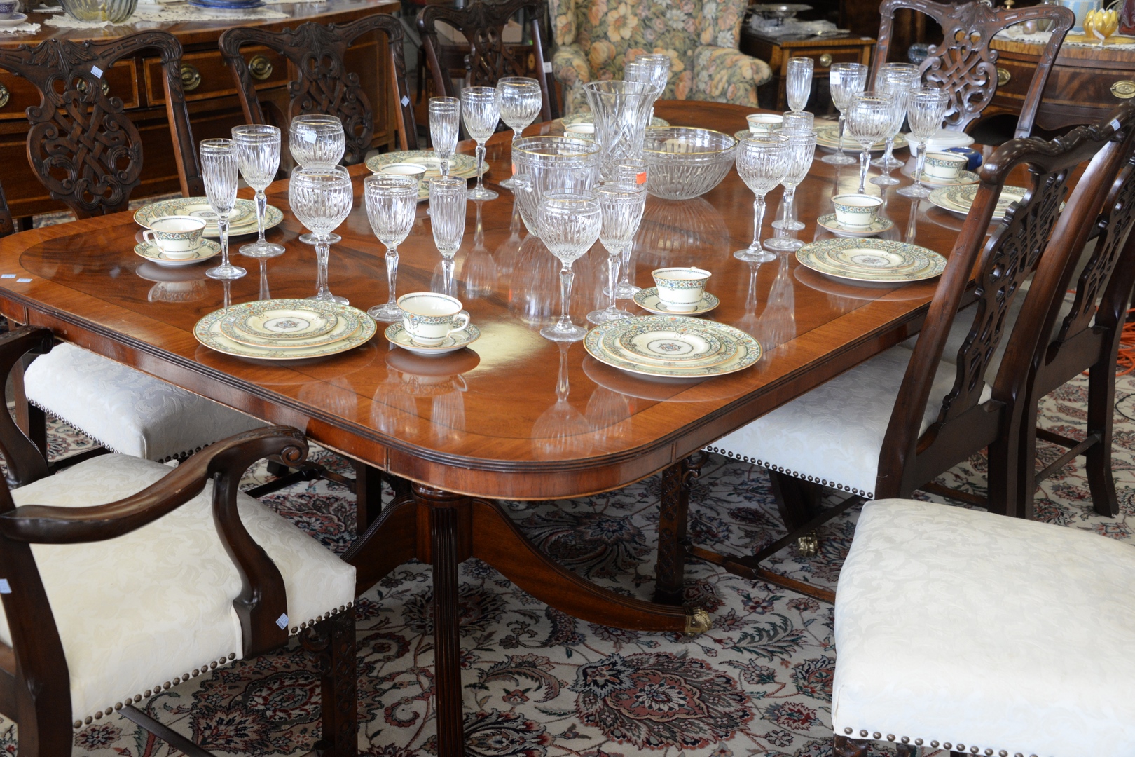 Lot 570: Custom Mahogany Dining Table with double pedestal base and banded inlaid top along with two leaves leaves 22 inches each table heigh…
