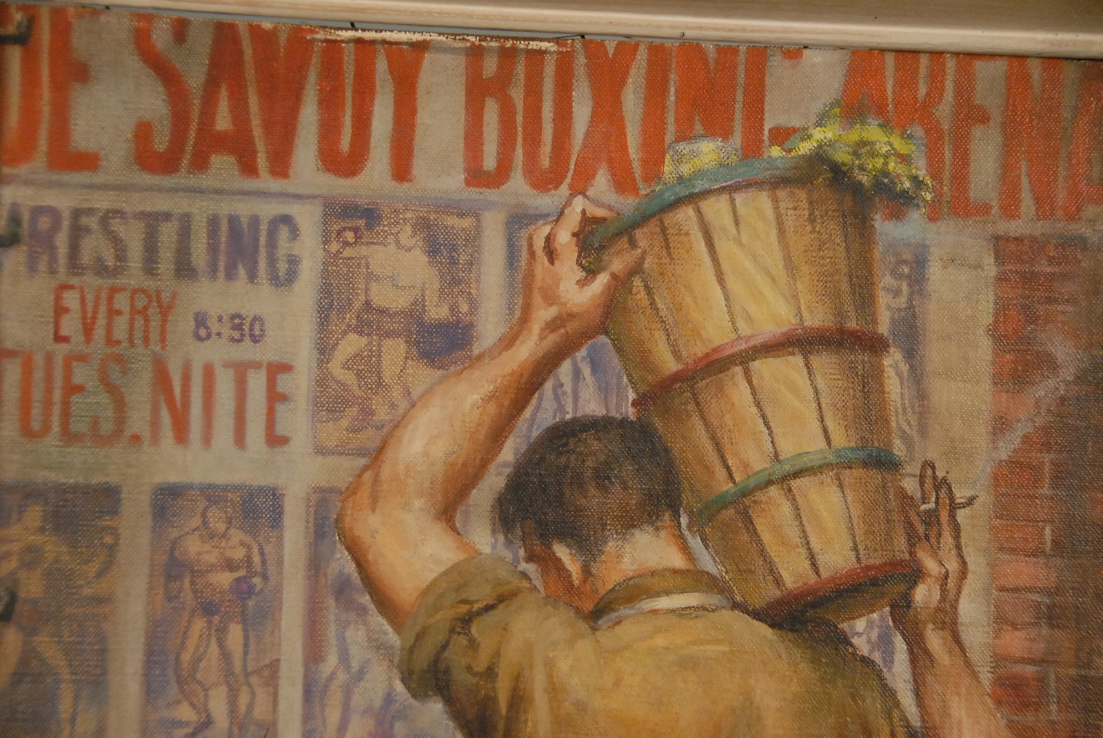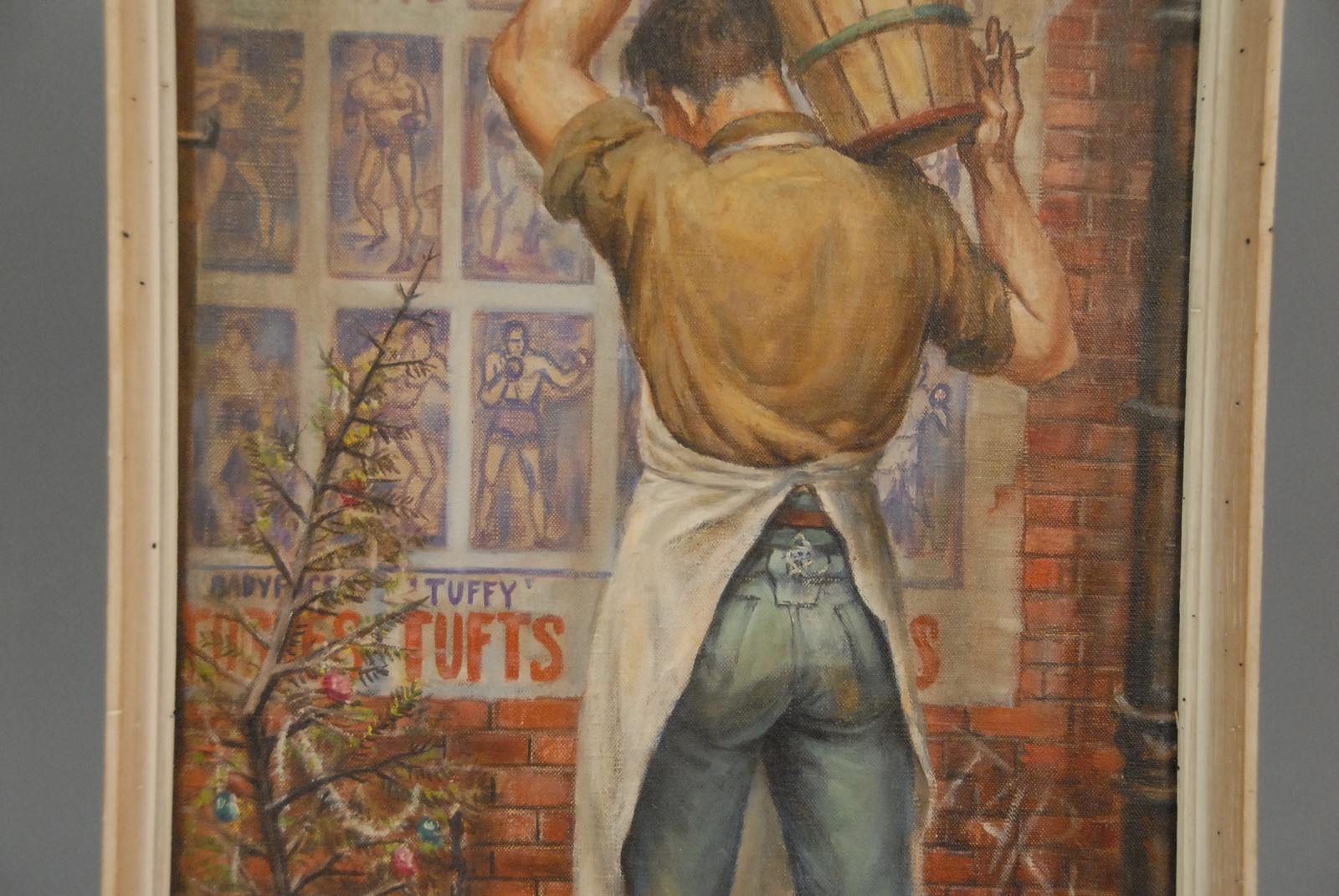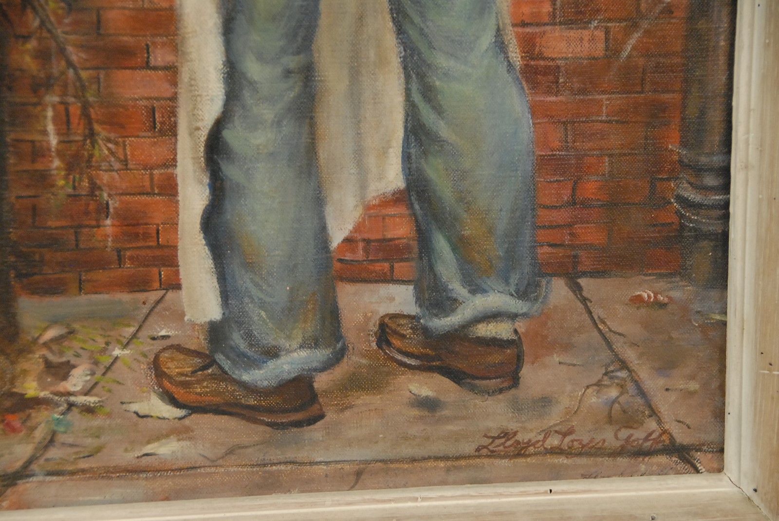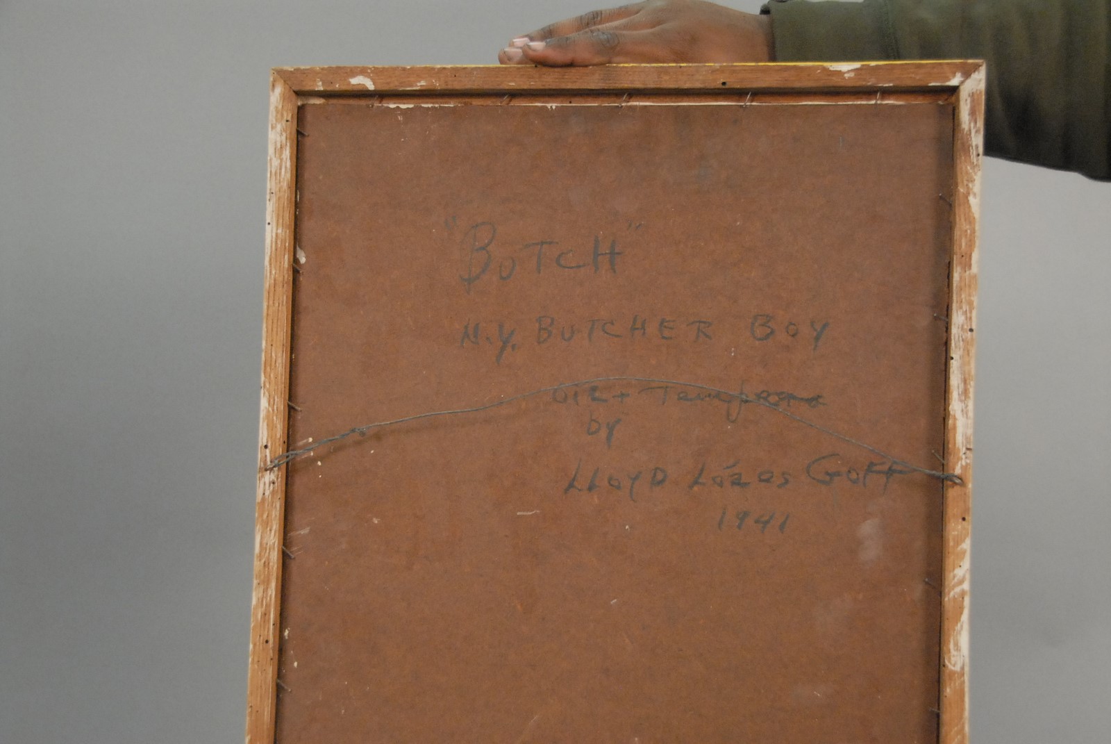Lot 570: Lloyd Lozes Goff 1918-1982 BUTCH N.Y. Butcher Boy oil on masonite signed lower right Lloyd Lozes Goff signed, titled, and dated on verso Butch N.Y. Butcher Boy oil by Lloyd Lozes Goff 27 1/2 x 15 1/2 Provenance: Property from The Estate