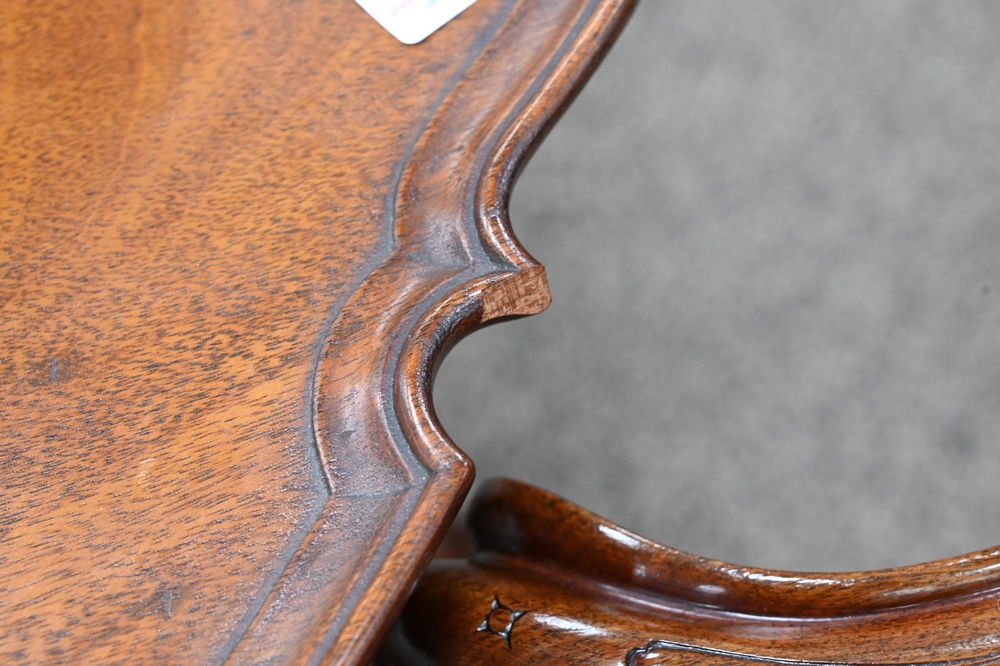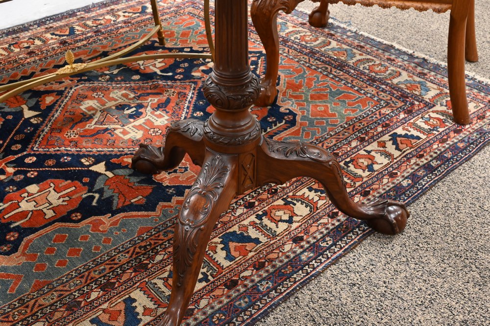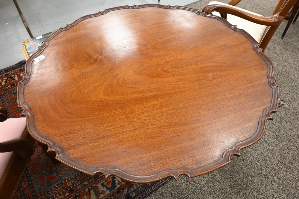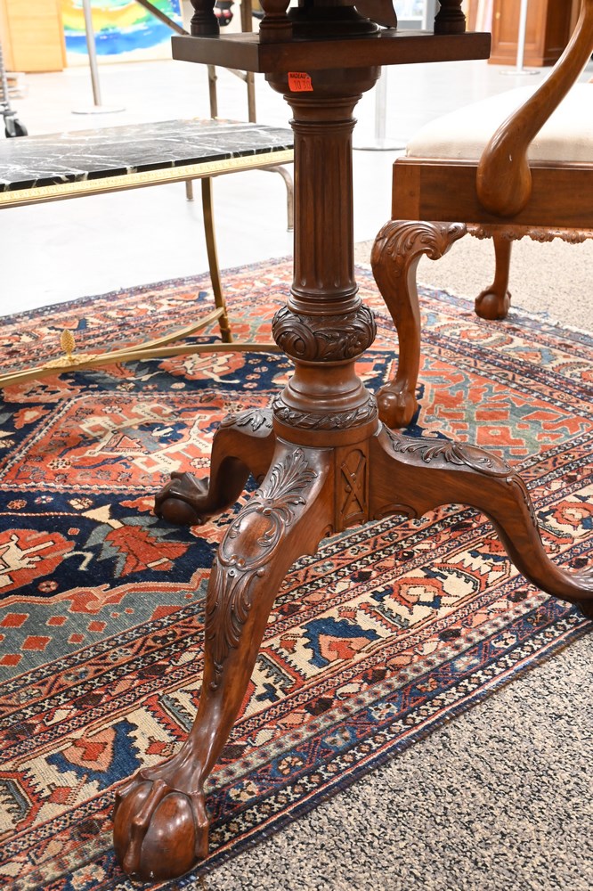 Lot 570: Margolis Custom Mahogany Chippendale Style Tea Table, having pie crust edge, all set on birdcage with carved and fluted shaft on car…