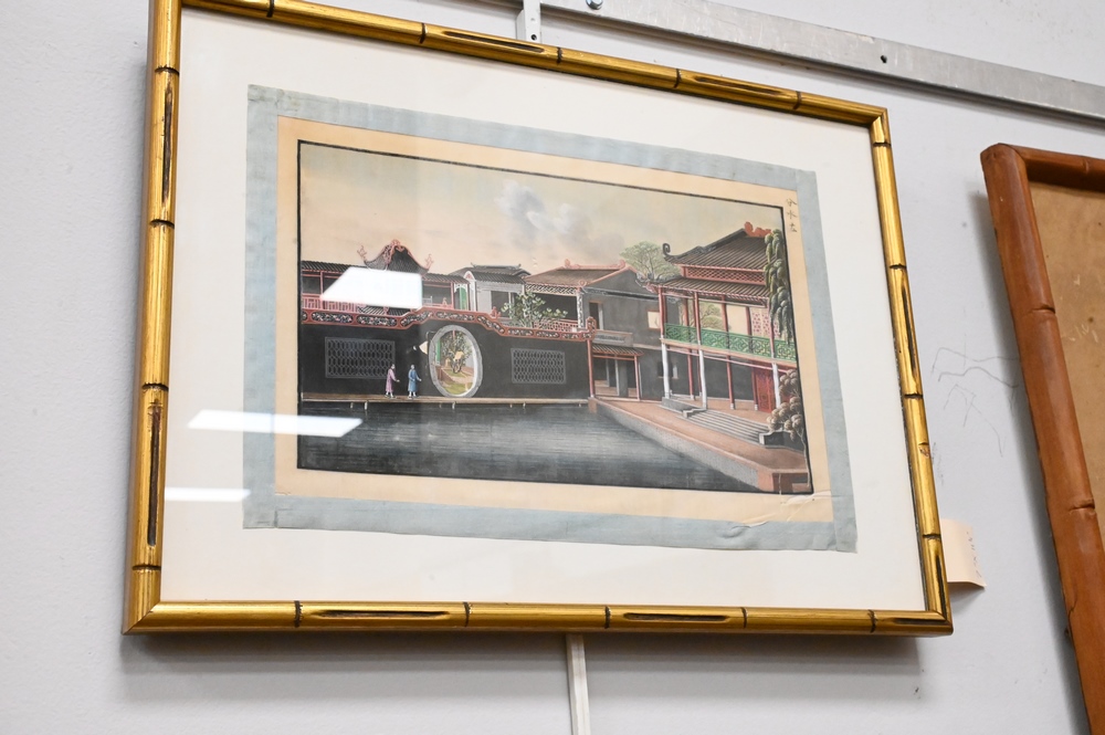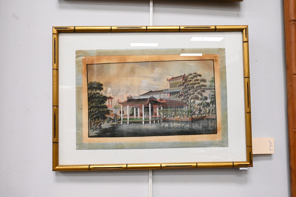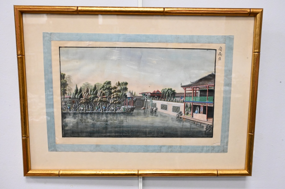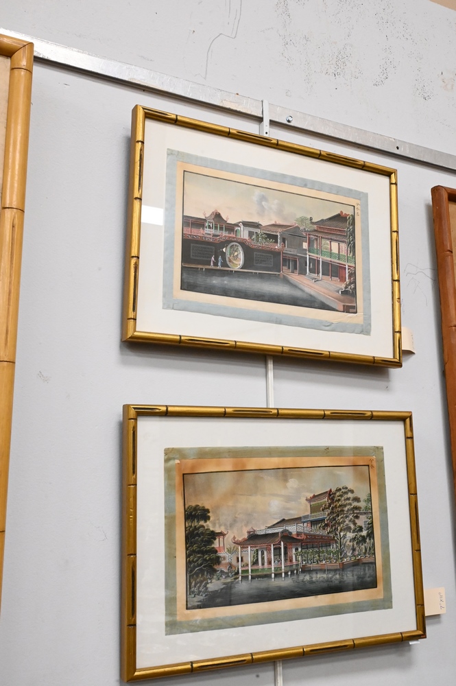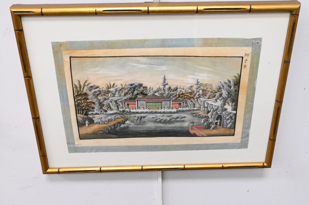 Lot 570: Set of Four Chinese Paintings, finely painted on tissue paper, courtyard and mountainous landscape with figures, signed to right corner, 7″ x 11 1/2″.