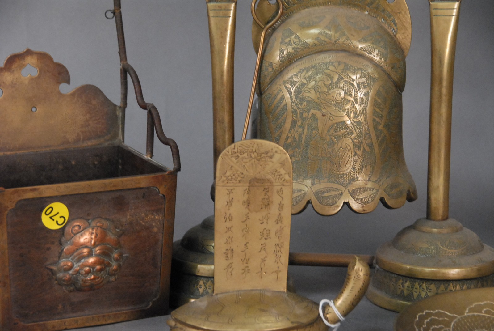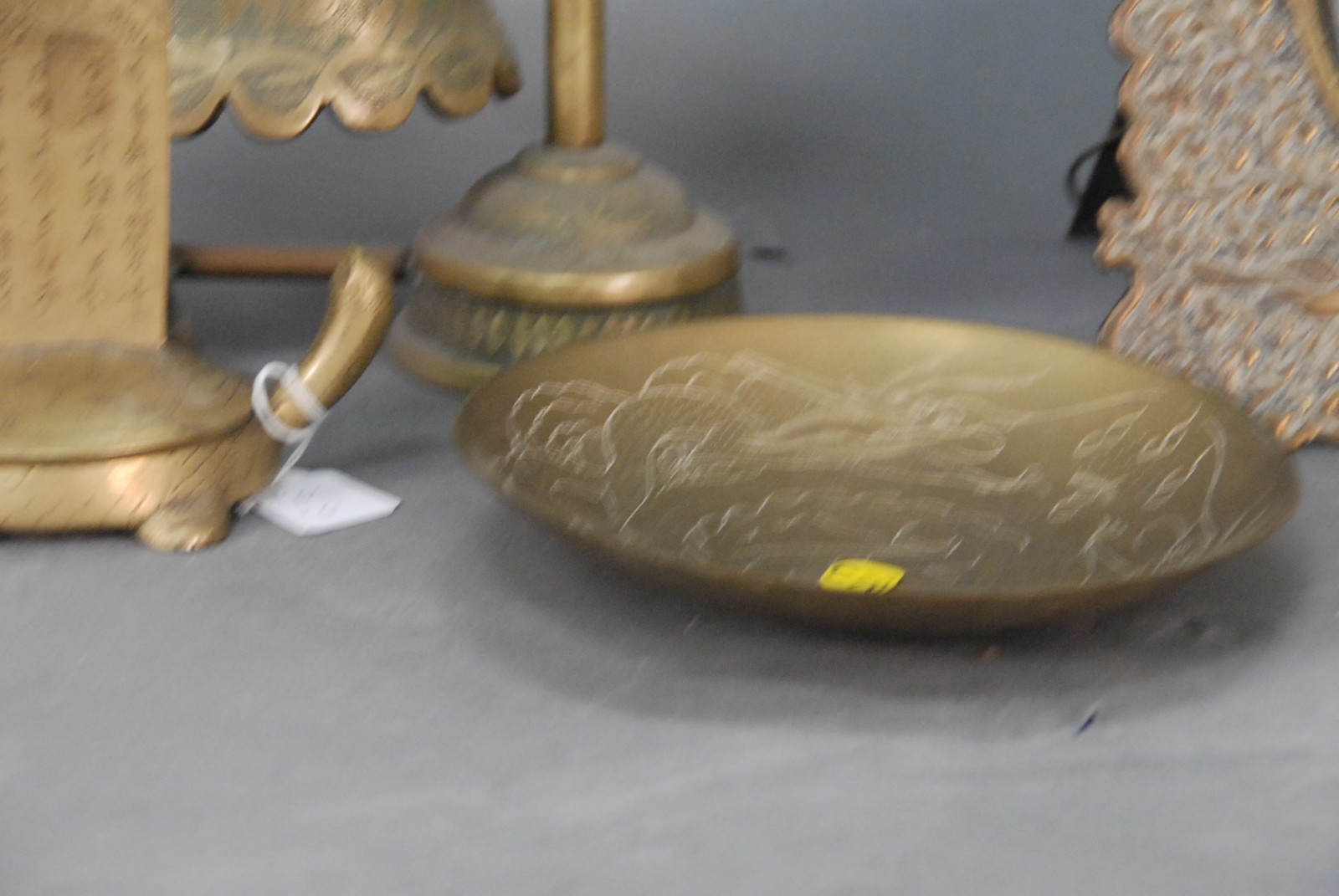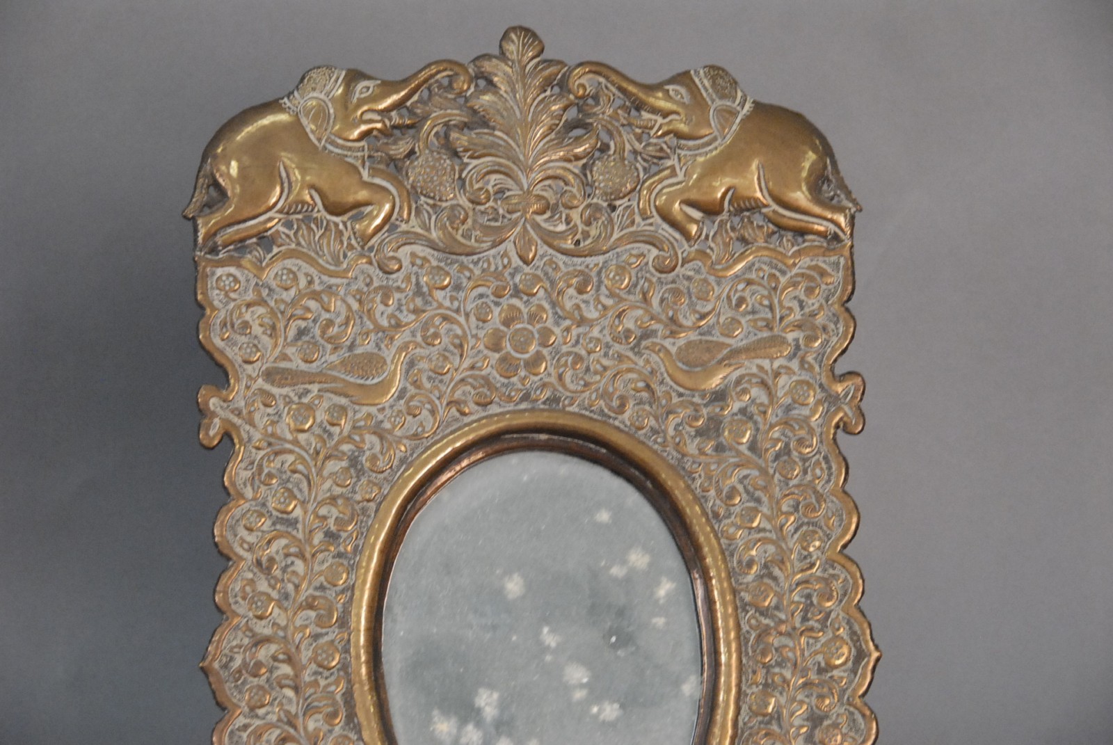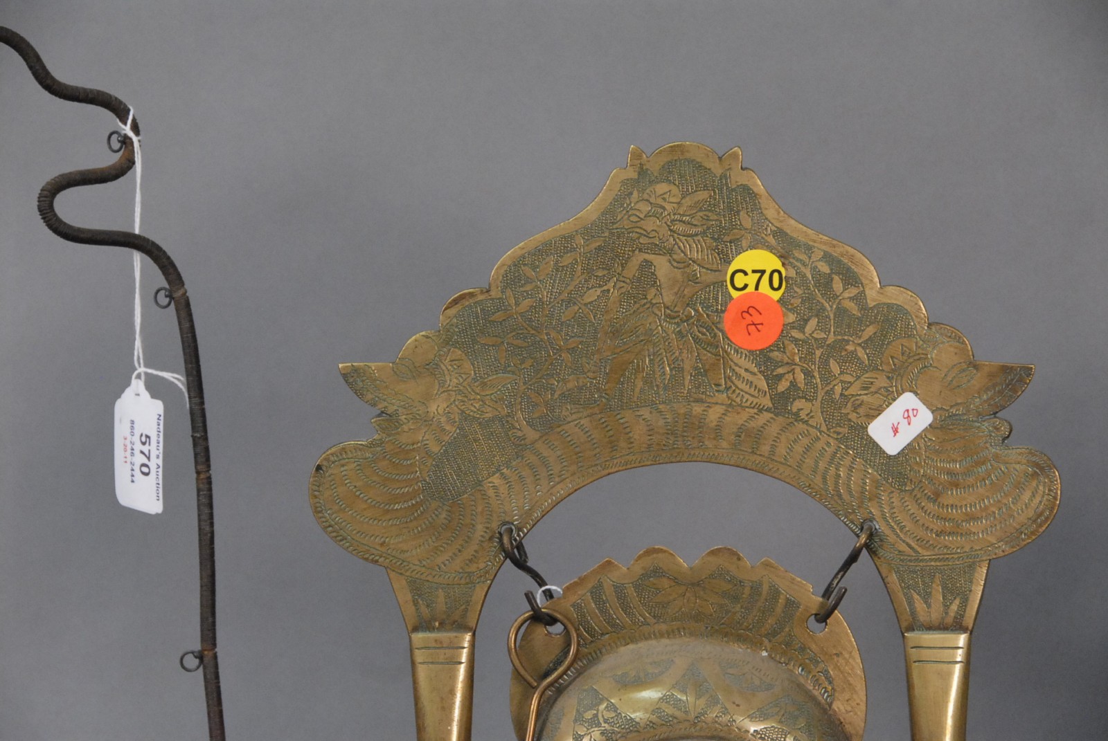 Southeast Asian brass gong, stand and striker and an Indian brass framed mirror, along with a brass vase, brass dish, Oriental brass book end, and a brass and wood basket.