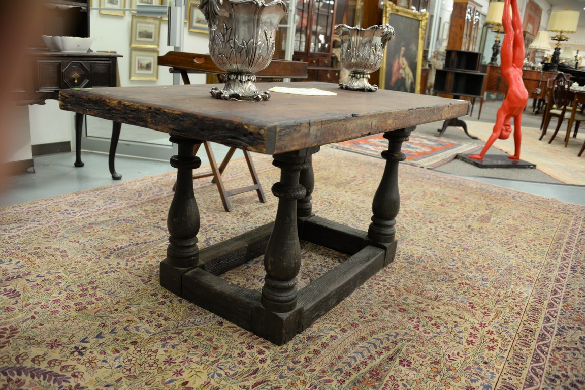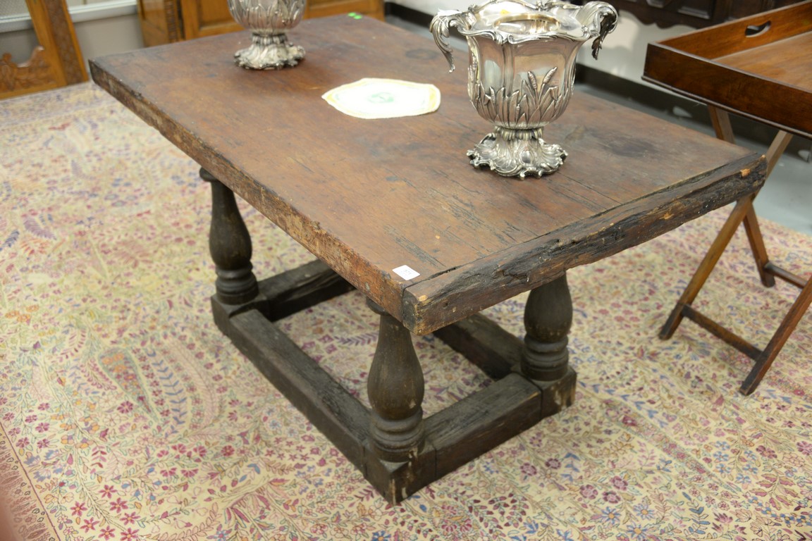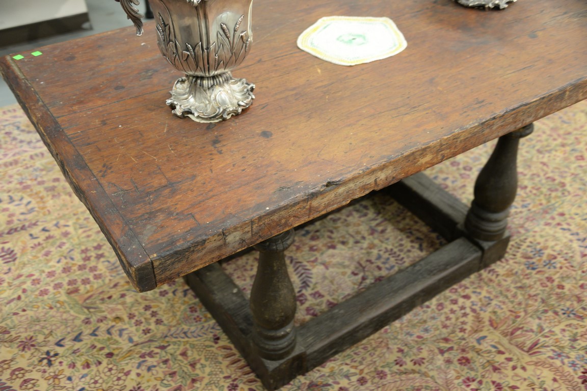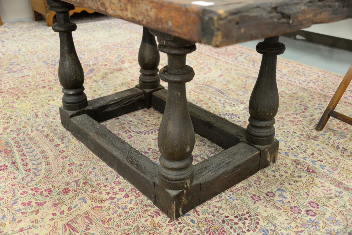 Lot 571: Early table having a slab top of one board on a base with turned legs and box stretchers, probably Spanish 16th-17th century restor…