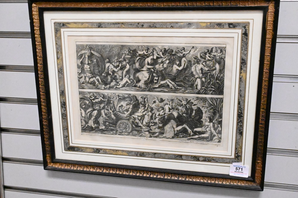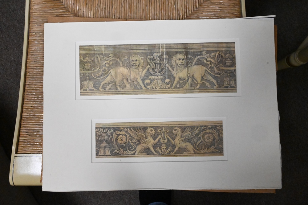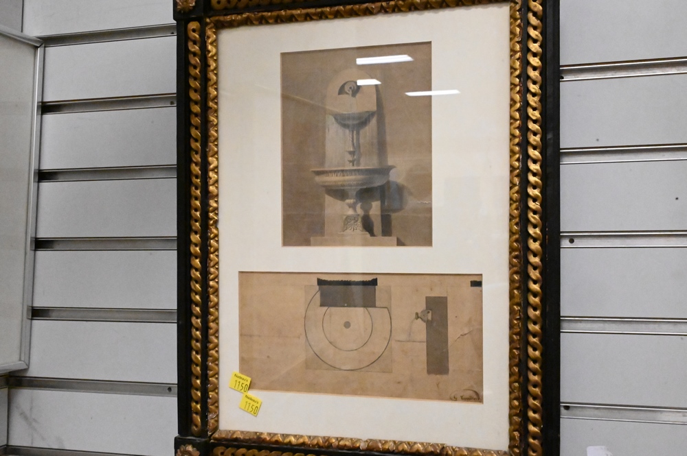 Lot 571: Five Piece Lot, to include a three piece framed art group, consisting of Neptune and Amphitrite by Jean Le Pautre from Oeuvres d’Architecture, an architectural sketch and lithograph; an early grey wash drawing of lions and winged griffins; 10″ x 13″; along with two autograph albums, 1870’s Chappaqua, NY and Ohio. Provenance: Estate of Wallace Bradway, New Haven, CT.