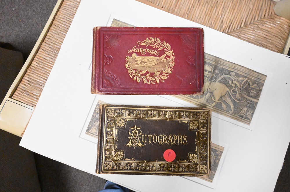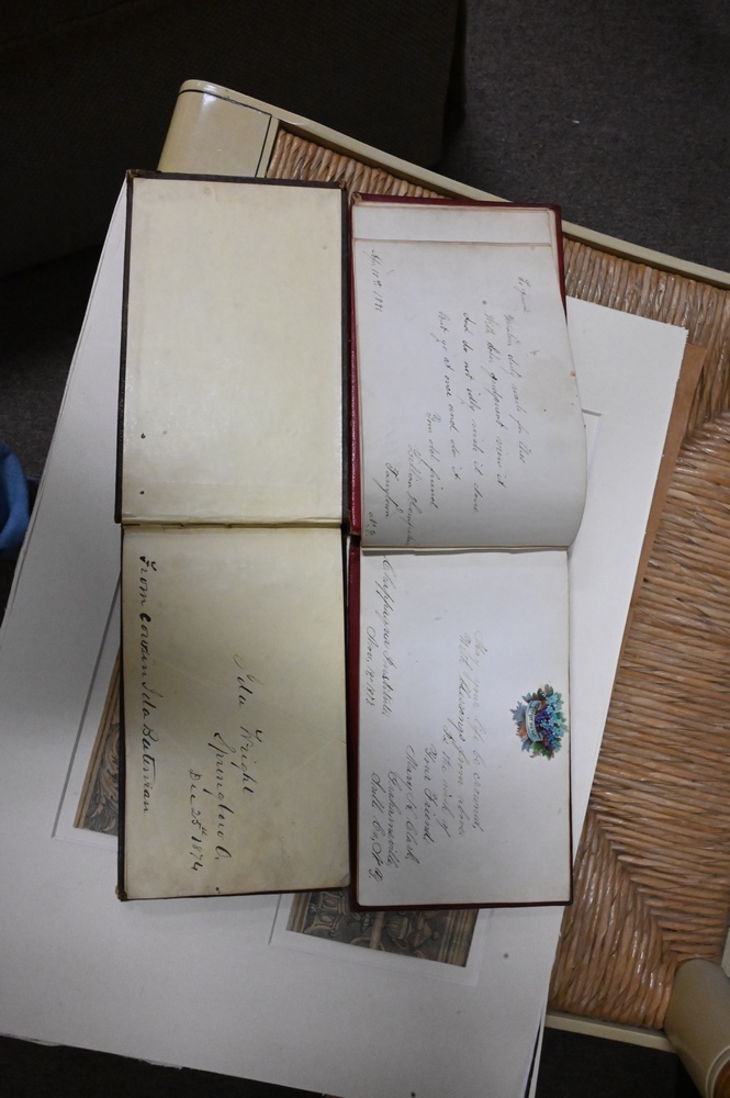 Five Piece Lot, to include a three piece framed art group, consisting of Neptune and Amphitrite by Jean Le Pautre from Oeuvres d’Architecture, an architectural sketch and lithograph; an early grey wash drawing of lions and winged griffins; 10″ x 13″; along with two autograph albums, 1870’s Chappaqua, NY and Ohio. Provenance: Estate of Wallace Bradway, New Haven, CT.