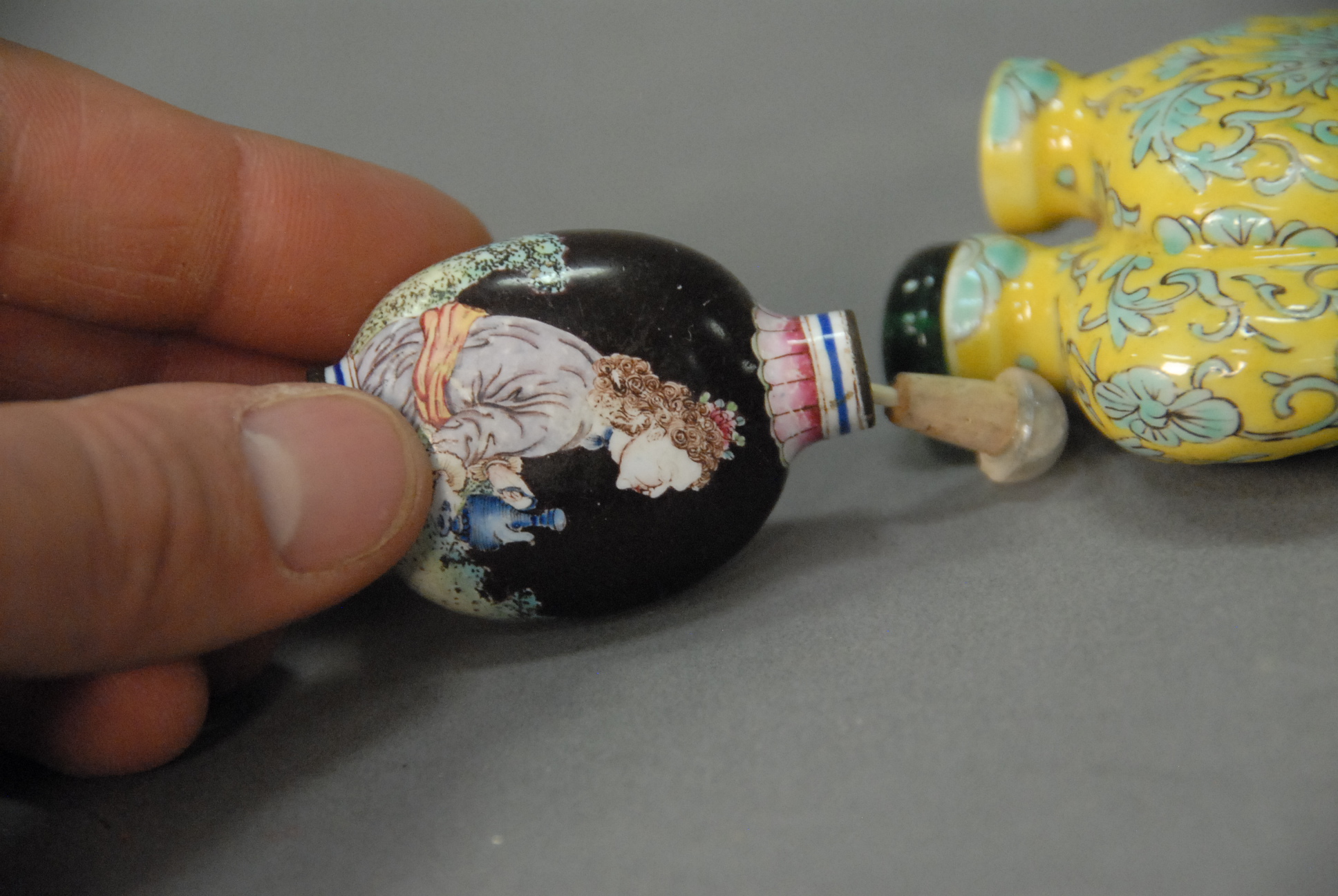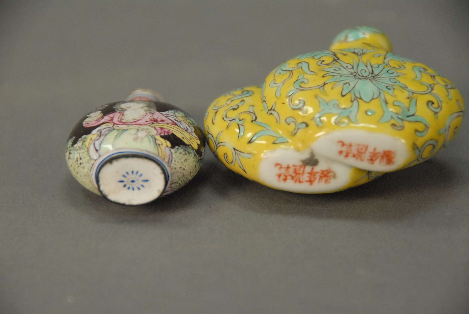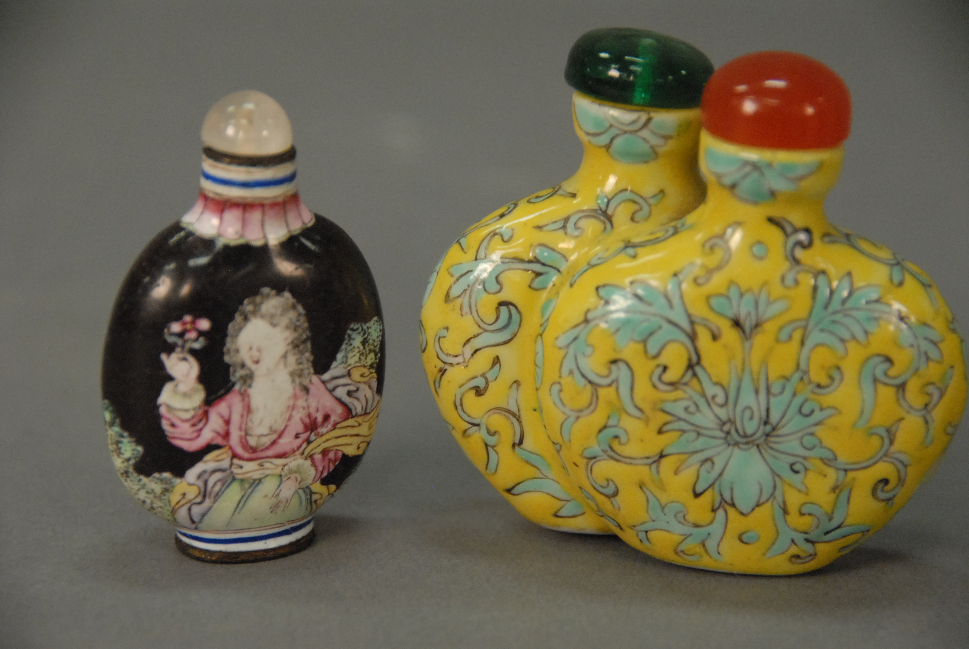 Lot 571: Four snuff bottles to include porcelain double snuff bottle with yellow ground and turquois lotus having four character mark on bottom ht. 2 1/4in., snuff bottle in the shape of corn ht. 3in., canton enameled metal snuff bottle with European girl wo