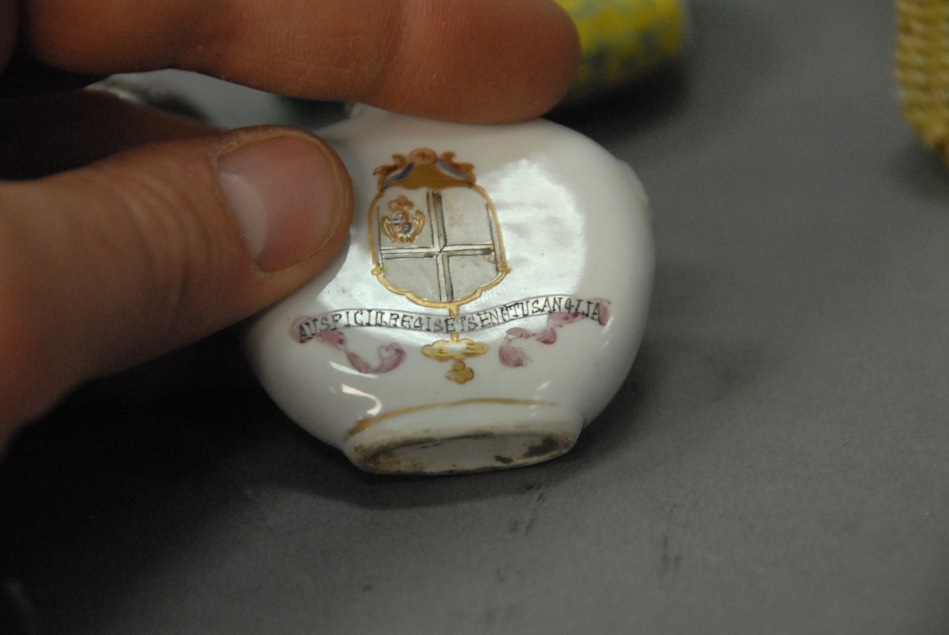 Four snuff bottles to include porcelain double snuff bottle with yellow ground and turquois lotus having four character mark on bottom ht. 2 1/4in., snuff bottle in the shape of corn ht. 3in., canton enameled metal snuff bottle with European girl worn ht. 2 1/8in., and porcelain snuff bottle with painted shield and lioness ht. 2 1/4in.