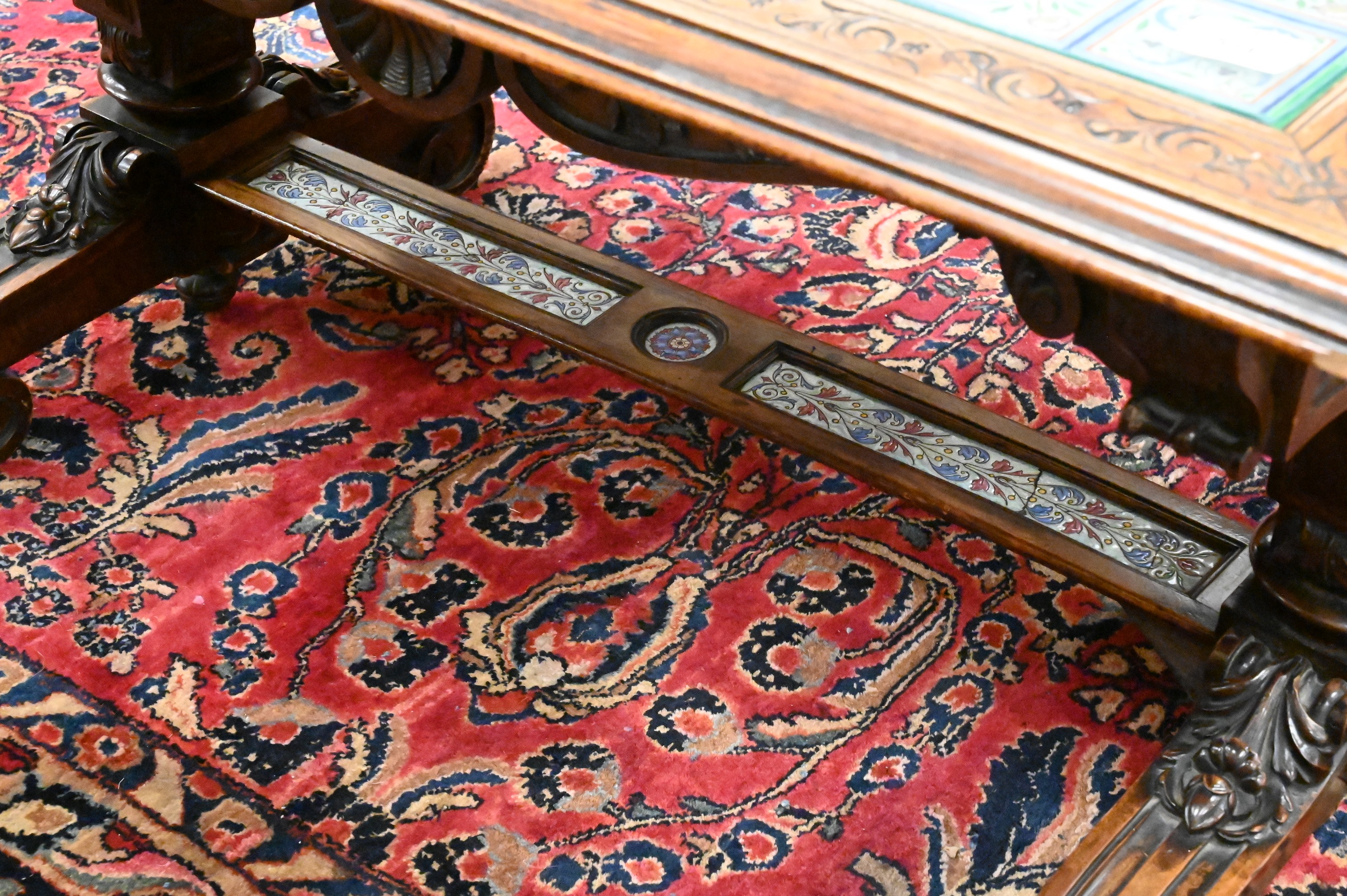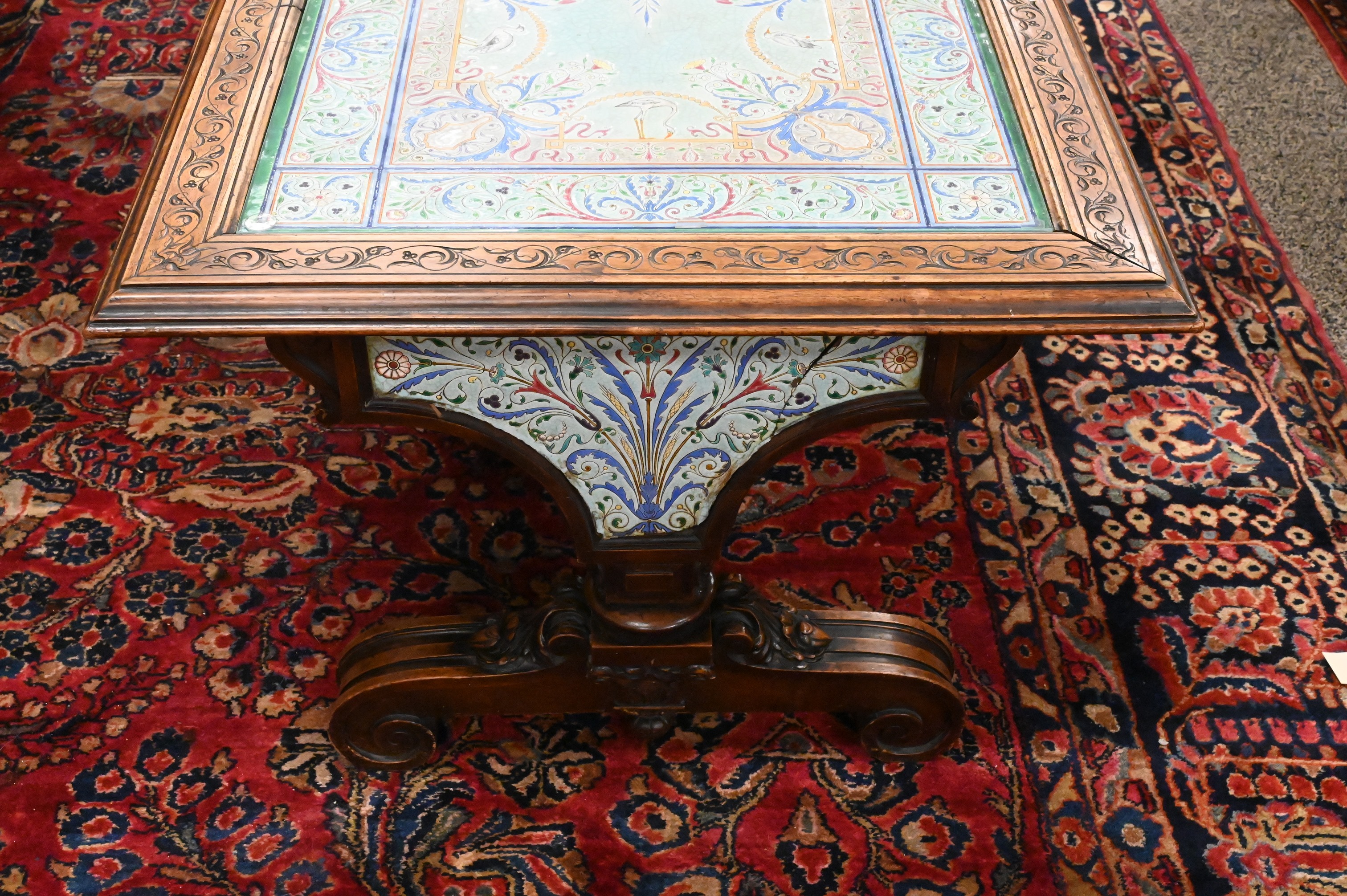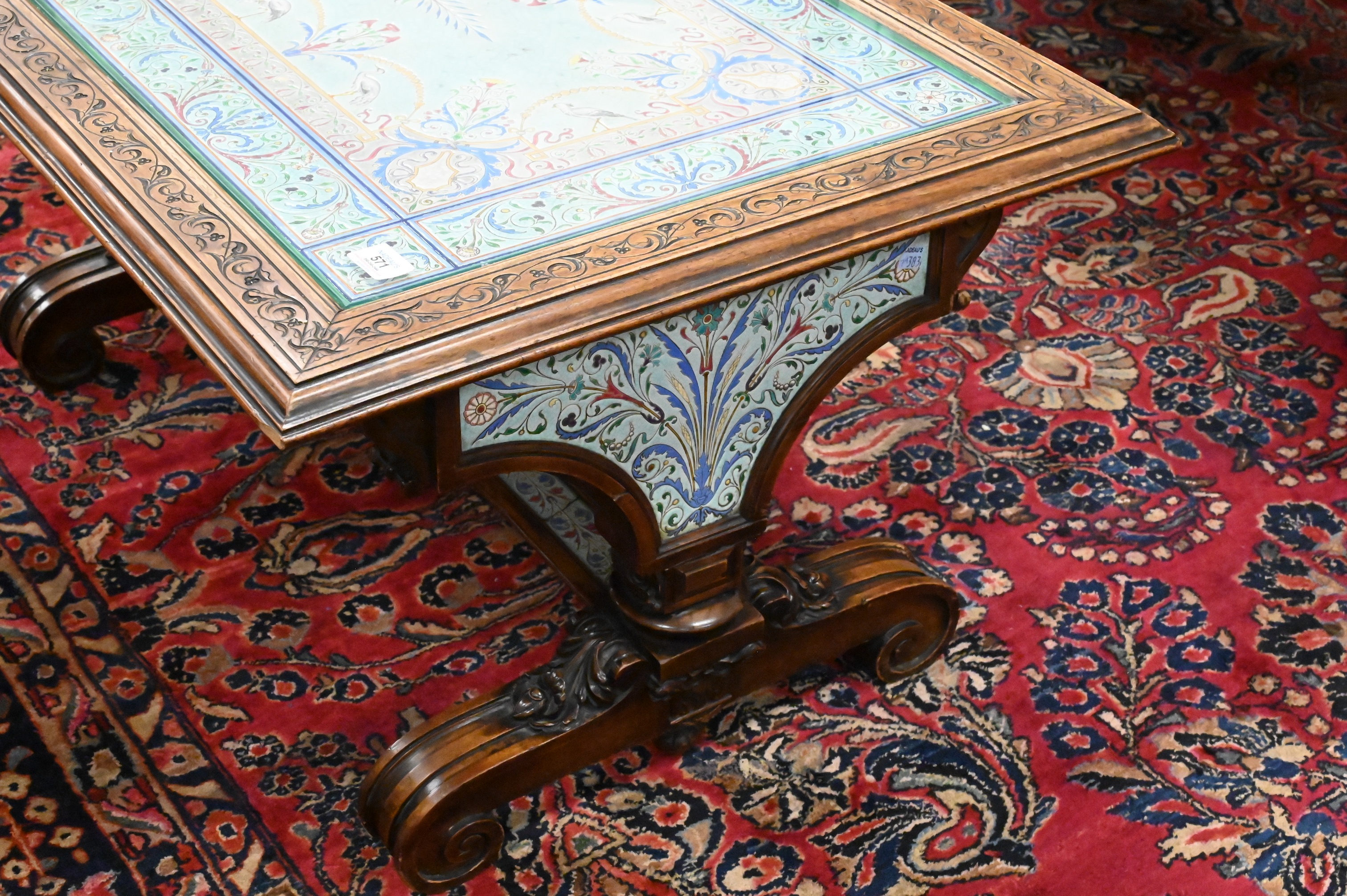 having walnut frame on trestle base, ends and stretcher inset with majolica panels