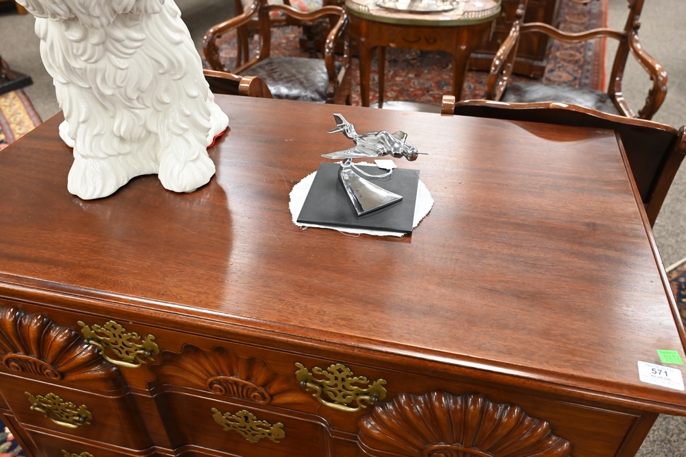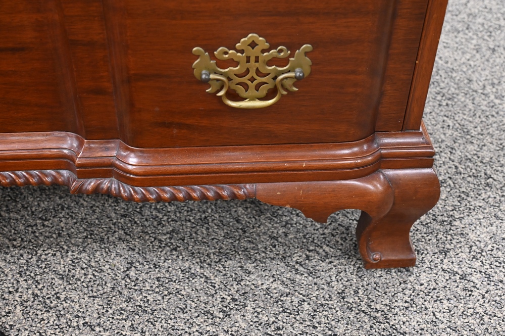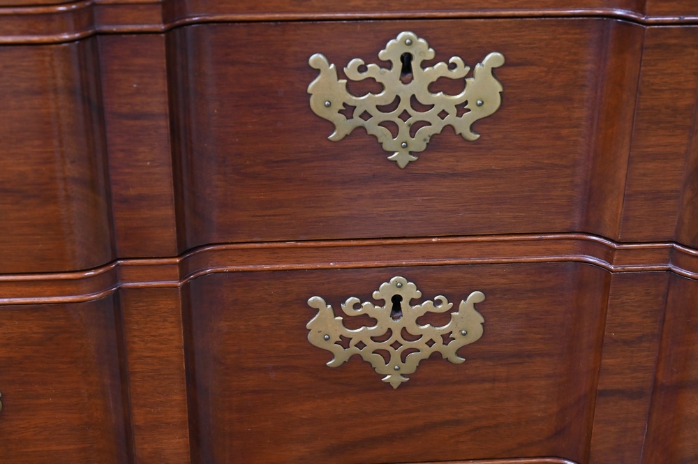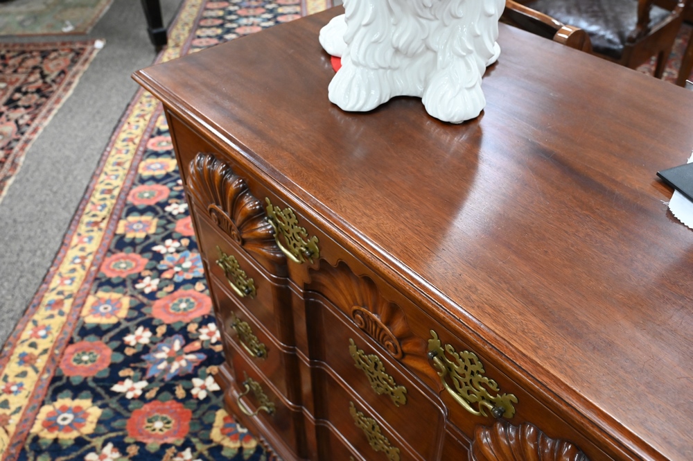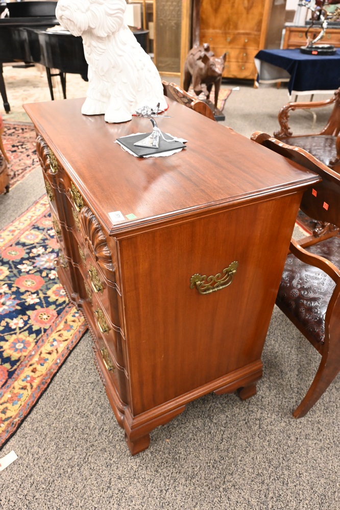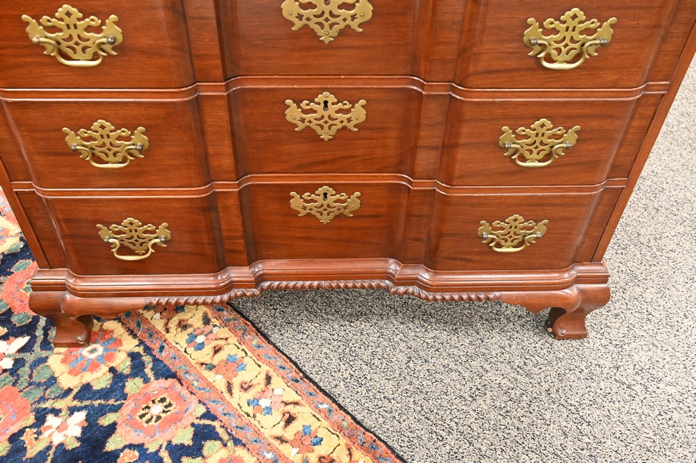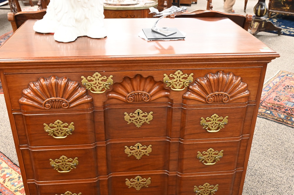 Lot 571: Margolis Custom Mahogany Newport Style Chest, having triple shell carved block front set on ogee feet, brass handles on sides, signe…