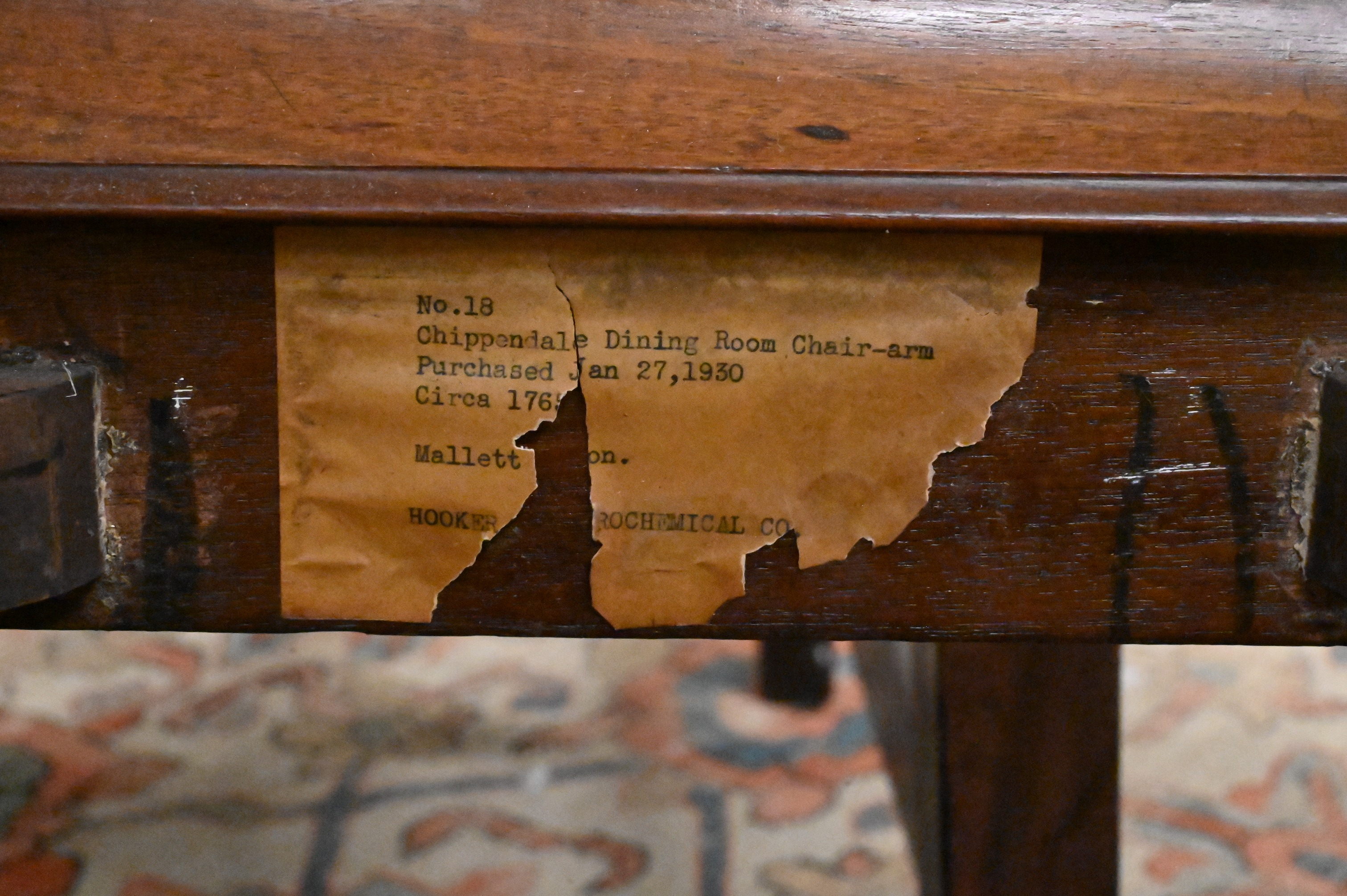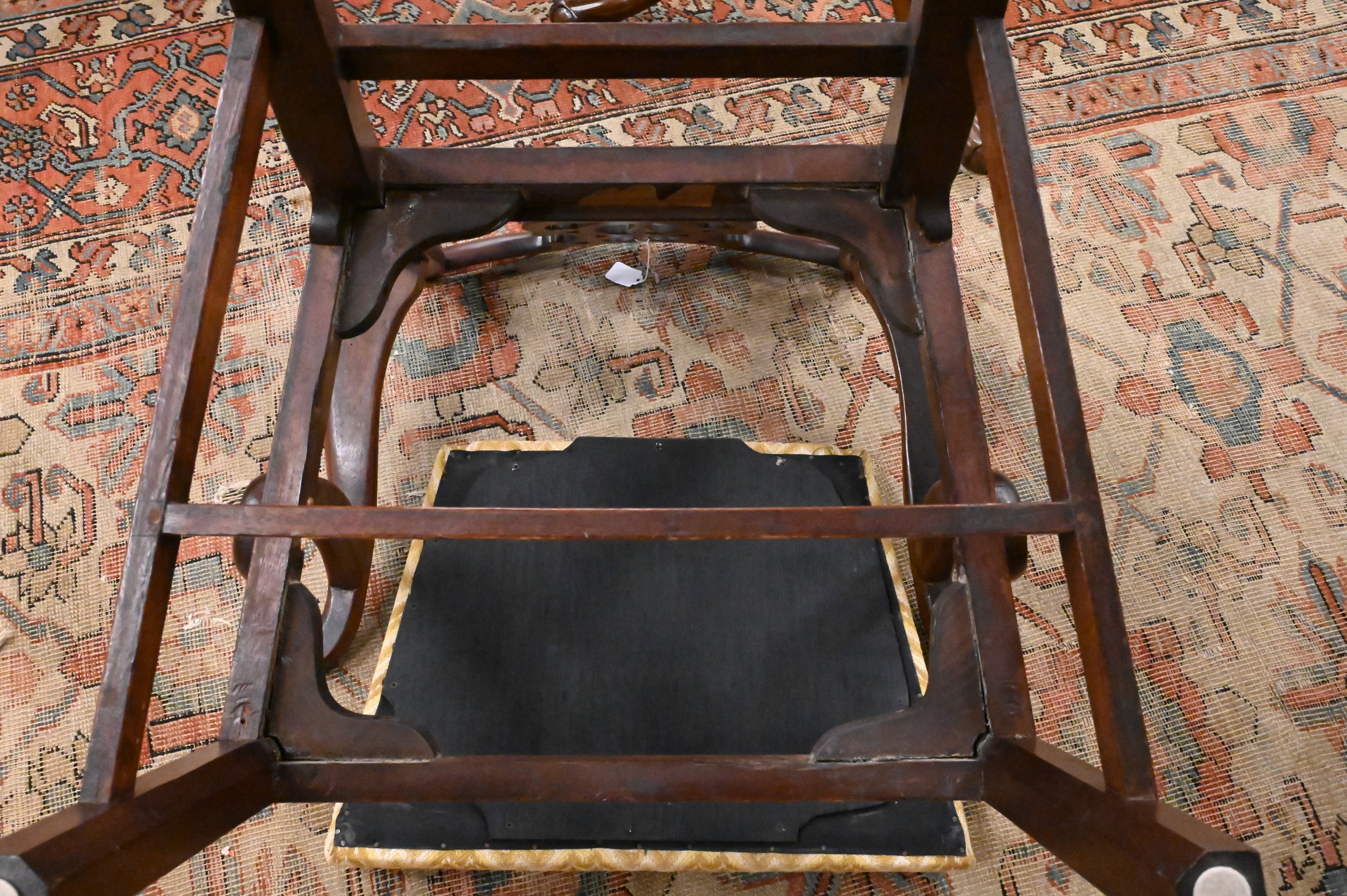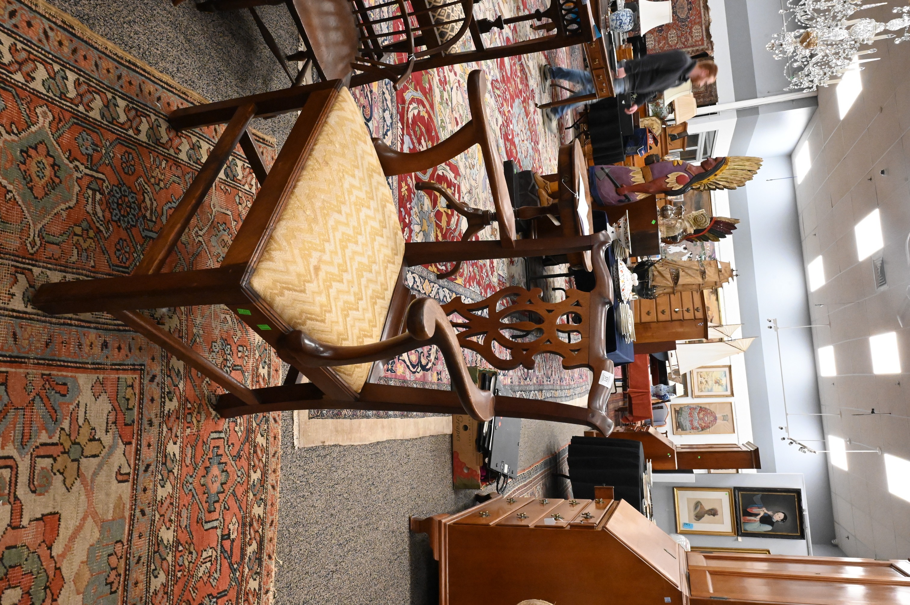 undulating top rail above a pierced splat and out-swept arms above a drop-in seat and plain apron on square legs joined by an H-form stretcher, one bearing paper label Mallet & CO., marked purchased 1950