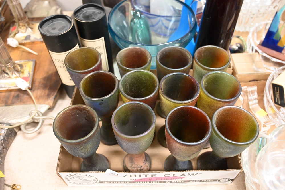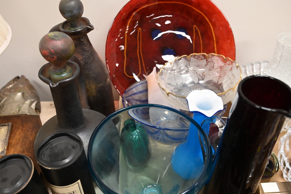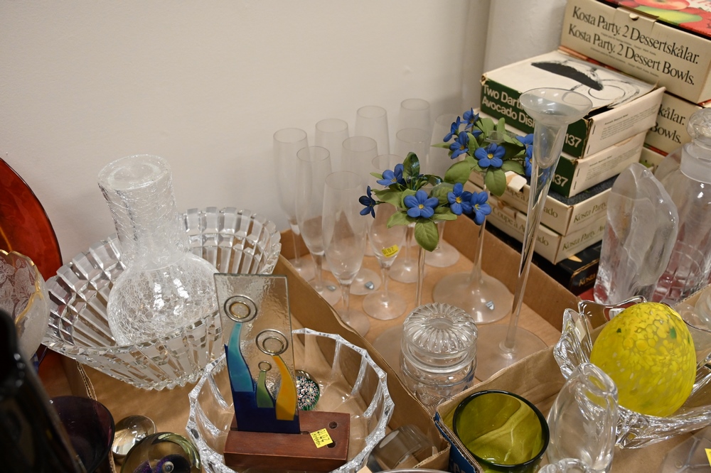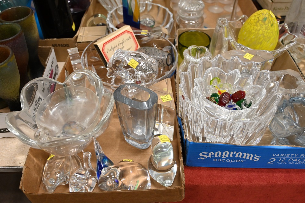 Lot 571: Six Boxes of Glass, to include Orrefors bowls, vases; Baccarat frog; Steuben snail; along with various other multi colored pieces.