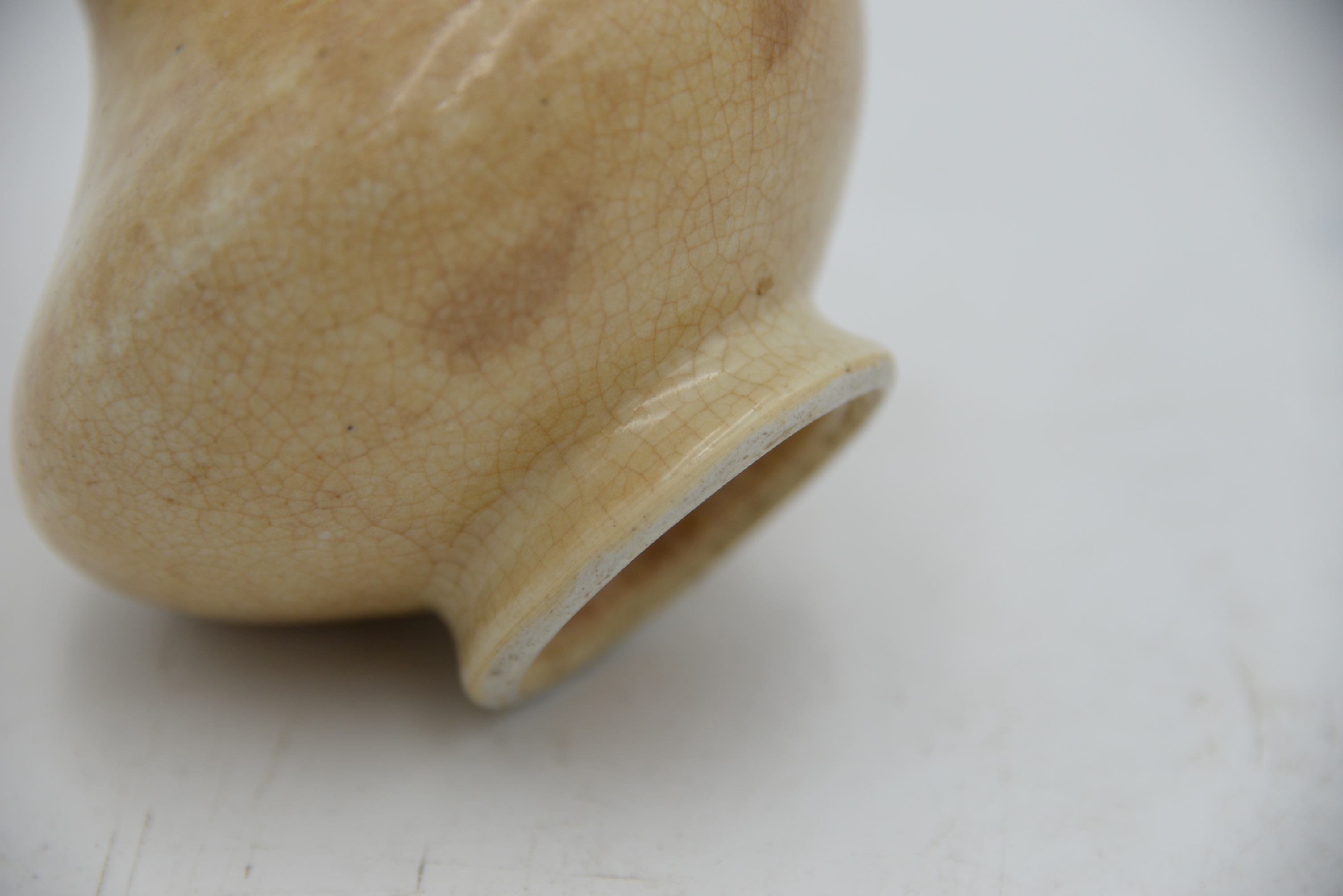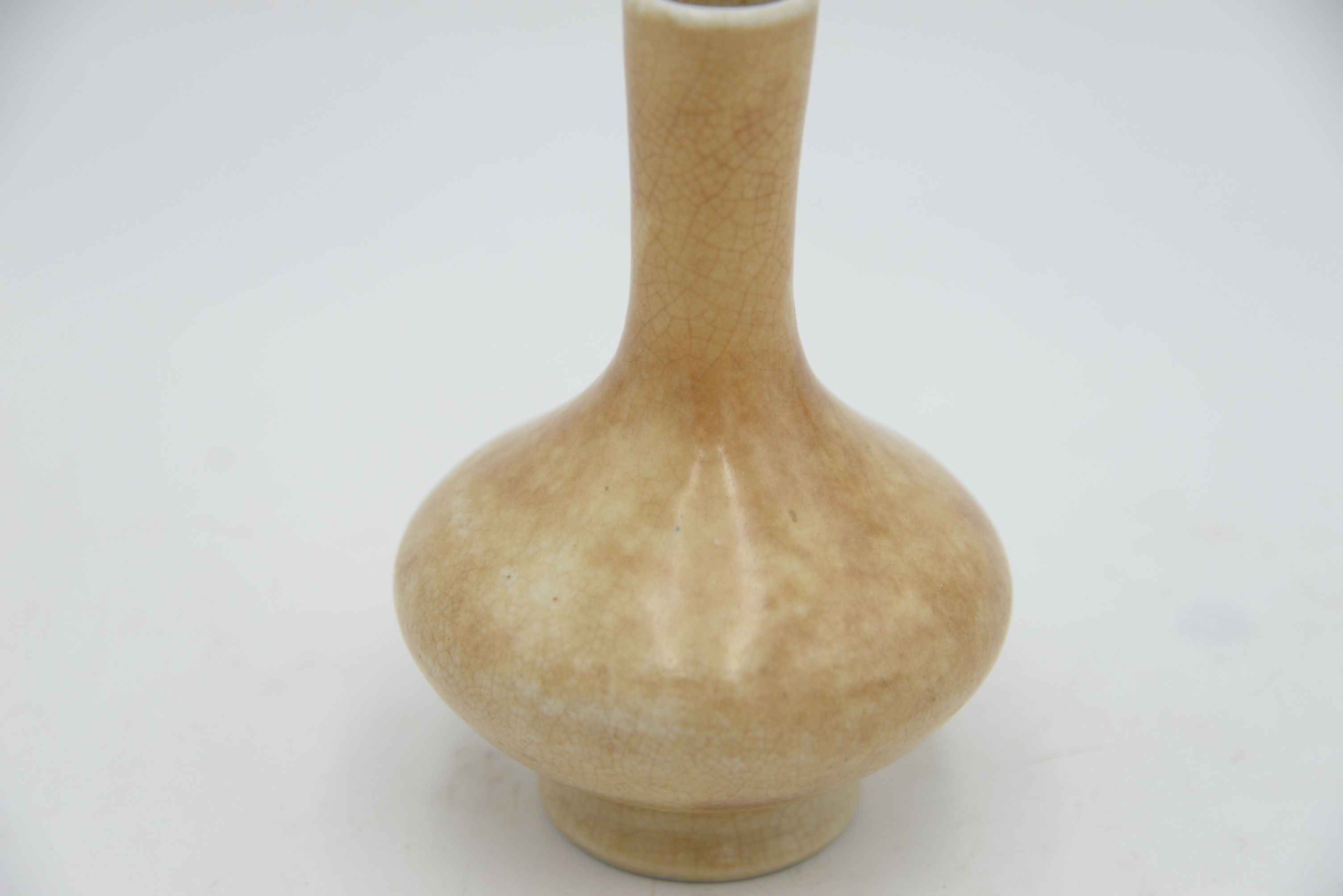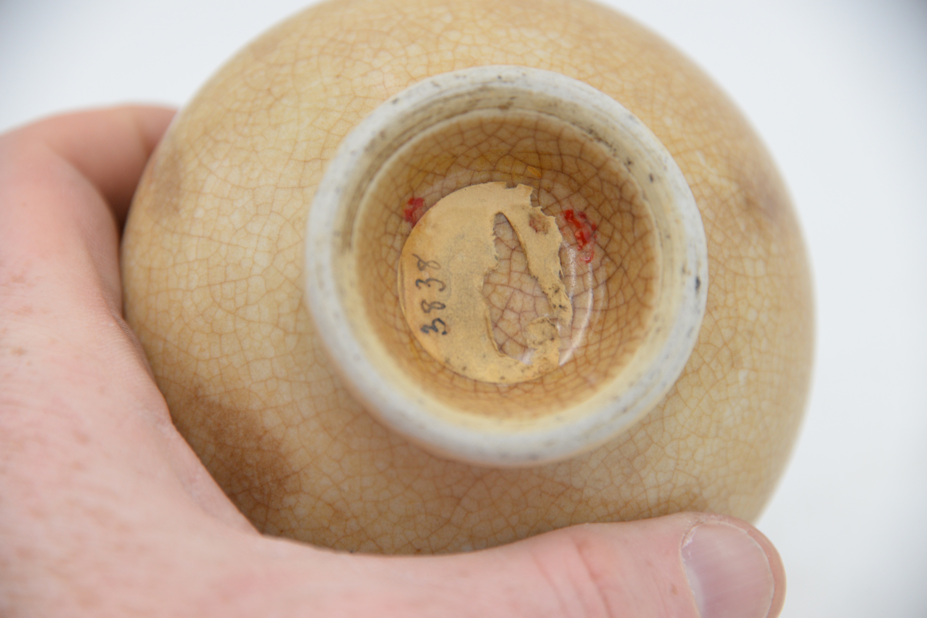 Crackle Glazed Body Vase, having squat globular body tapering to a narrow cylindrical neck, covered in a tanish glaze with russet crackle, base havig old paper label, marked 3838, possibly museum or inventory number, height 5 1/2 inches.