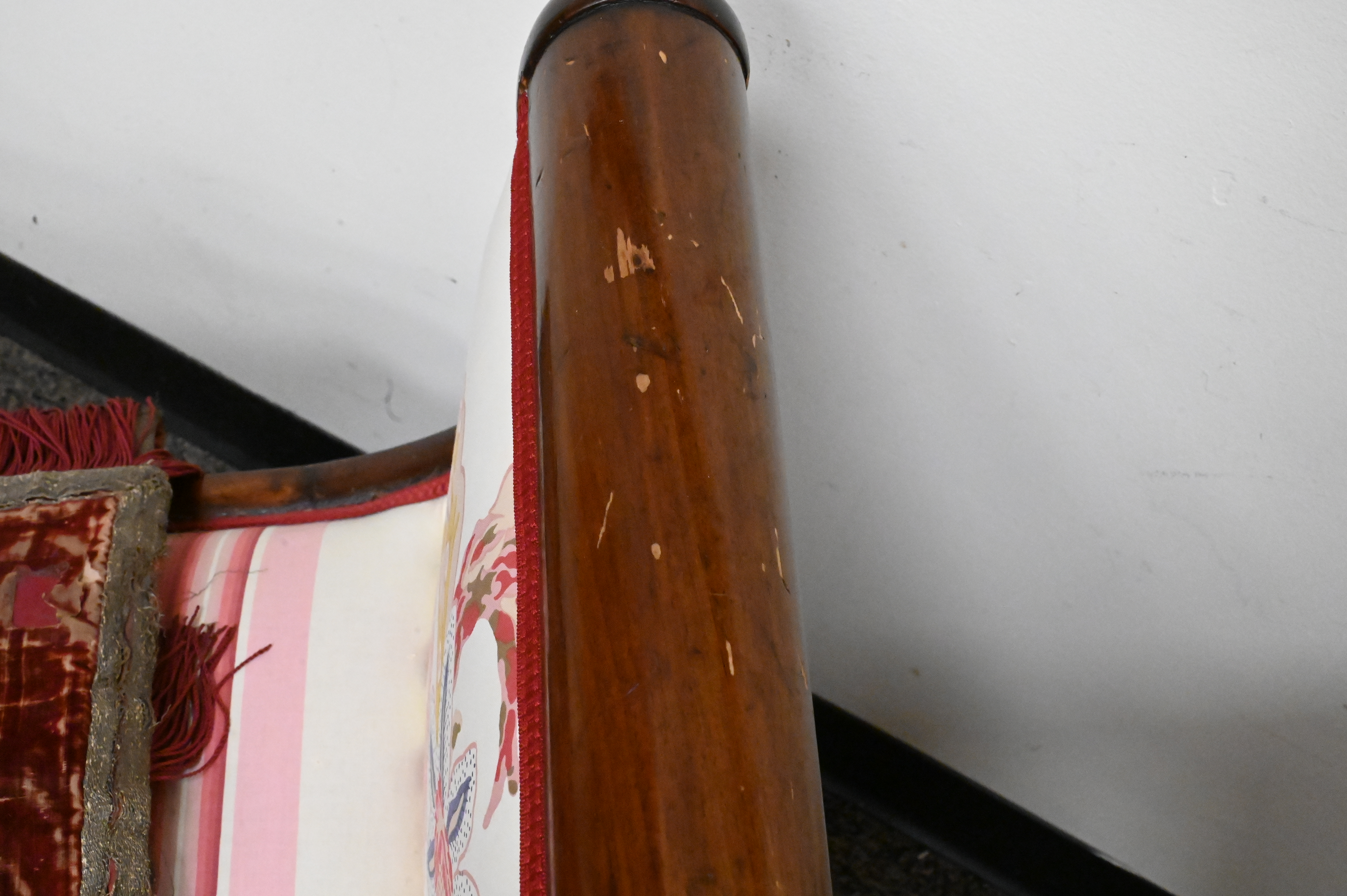 sleigh form, carved with swan necks on splayed legs having paw feet