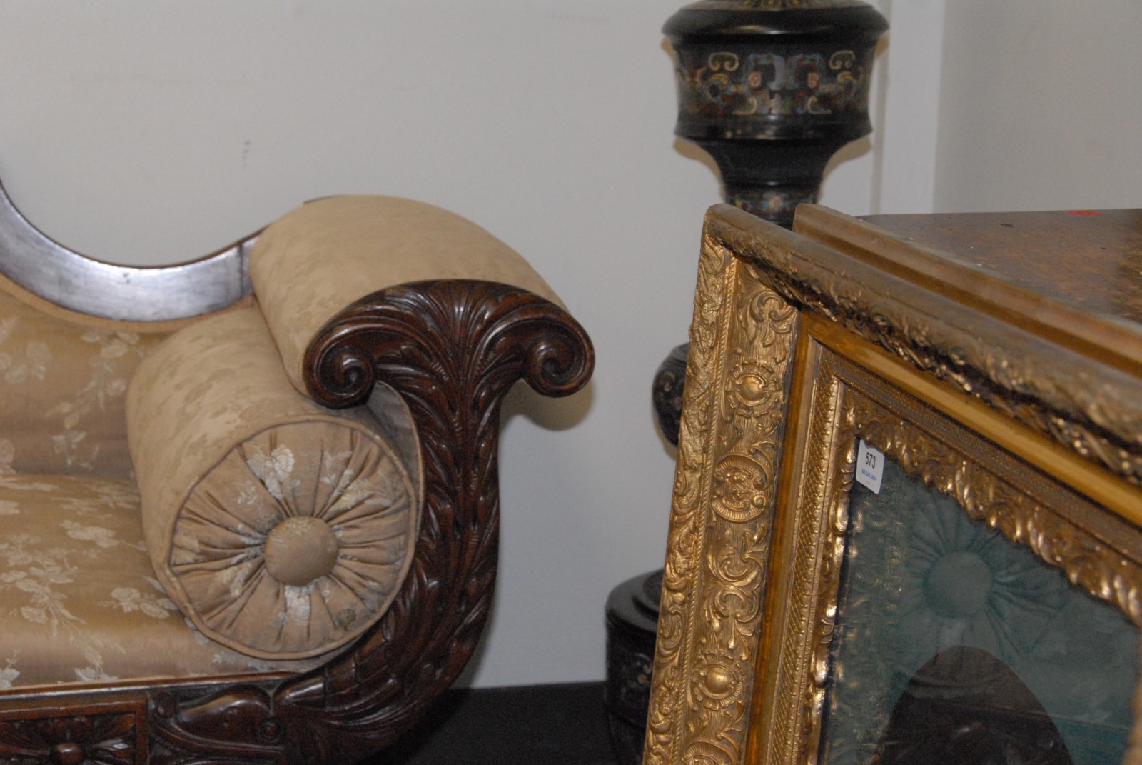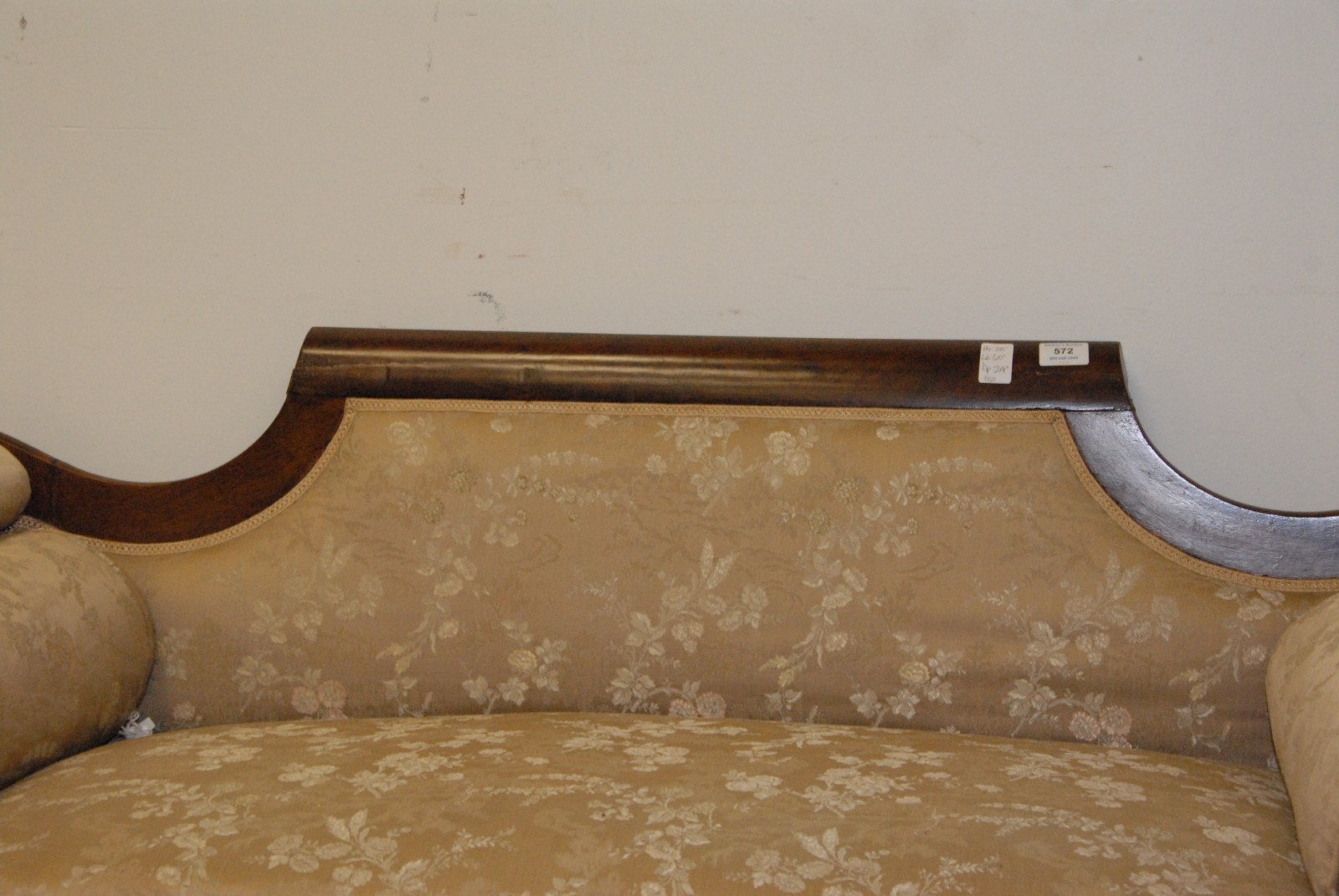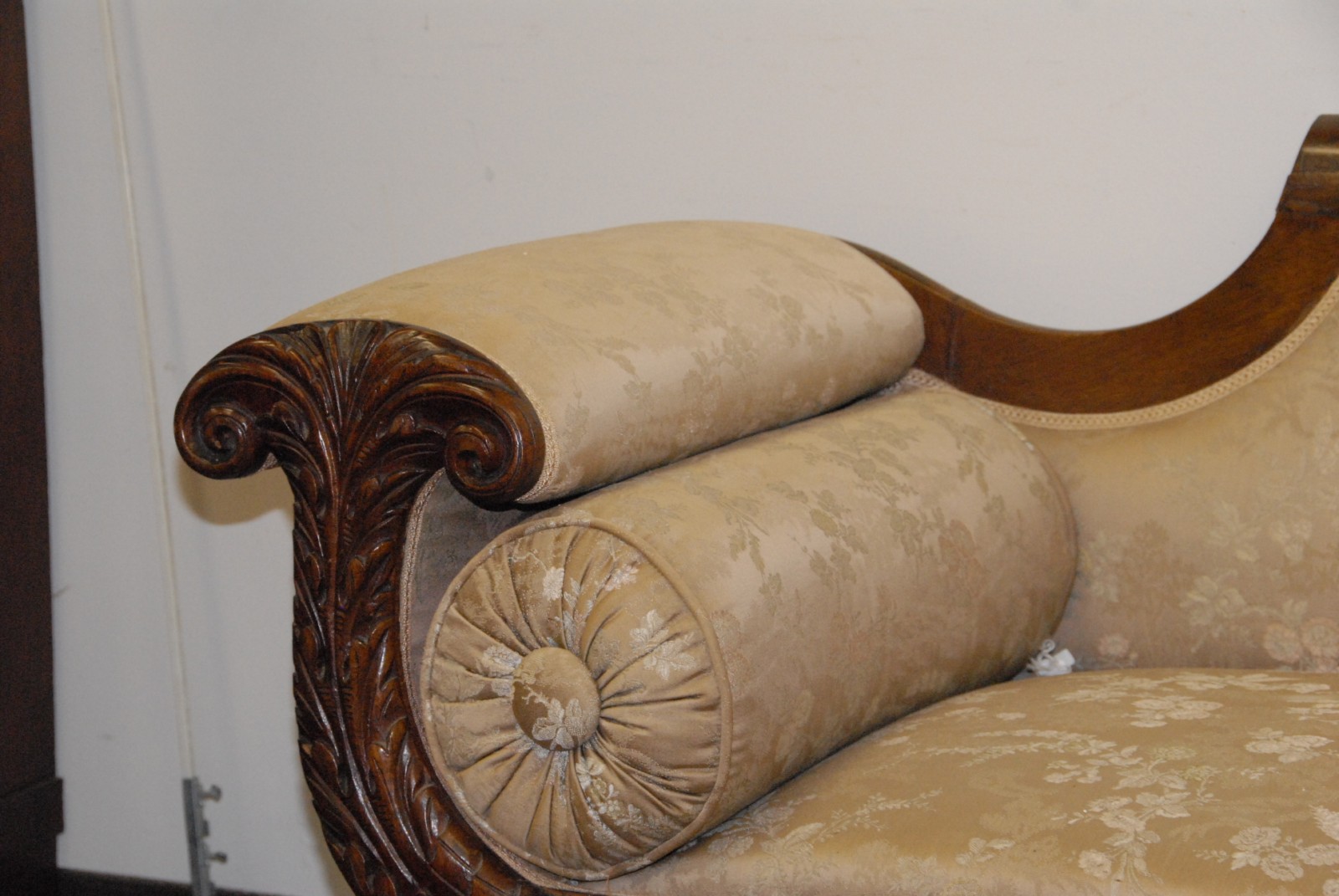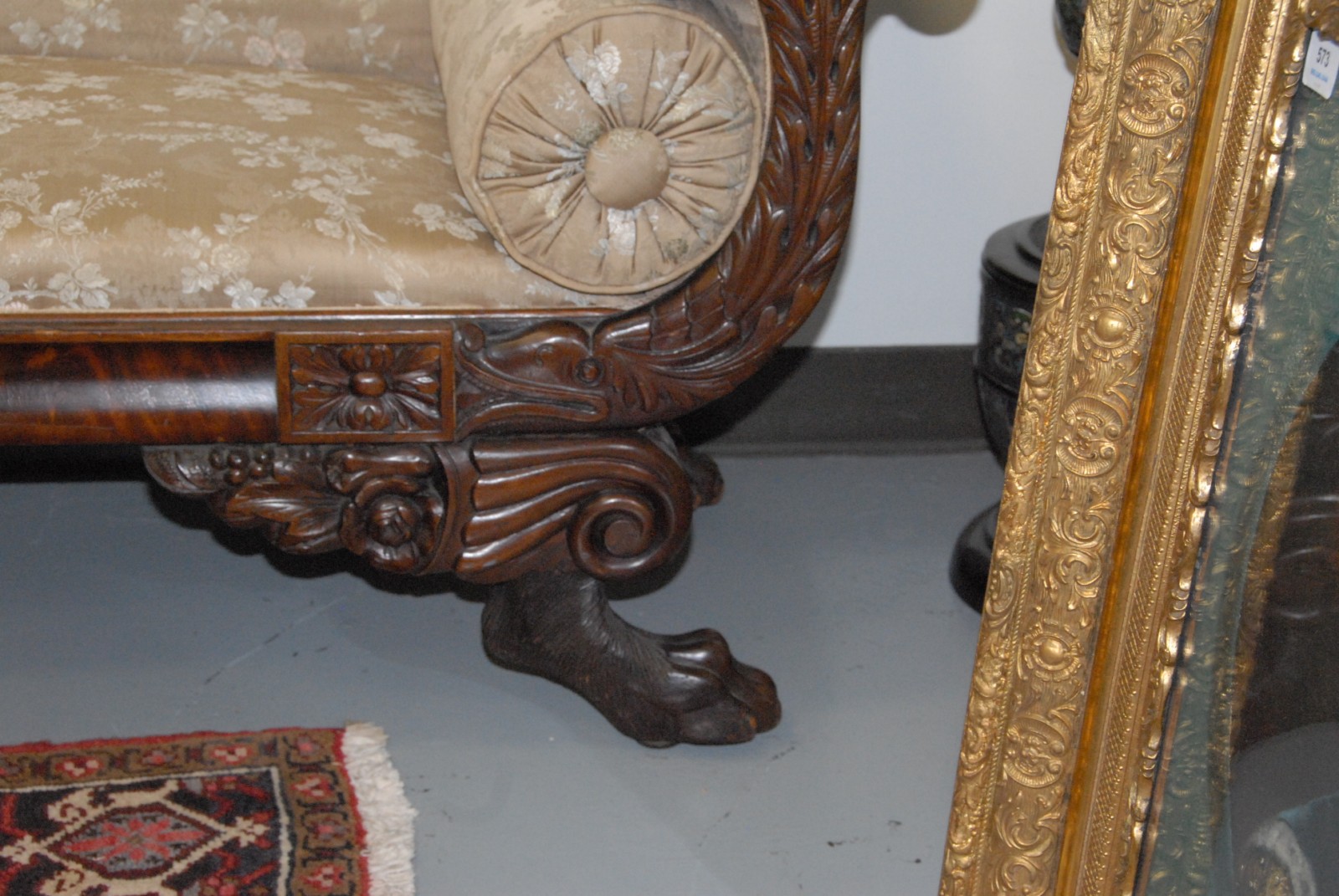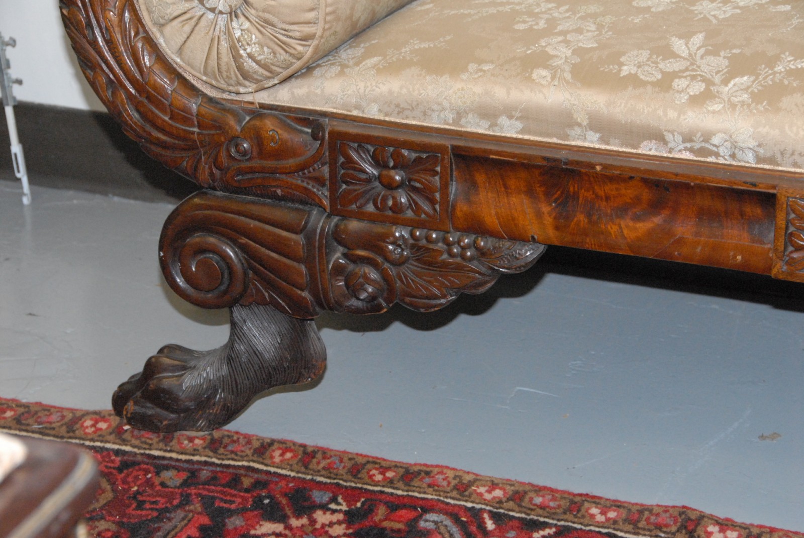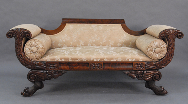 Federal diminutive mahogany loveseat with dolphin carved arm and carved paw feet, break in back.