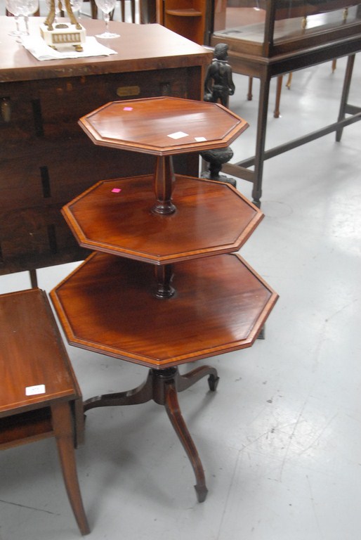 Fineberg mahogany three tier dumbwaiter / stand with satinwood inlaid edges and line inlaid legs, made by Fineberg, Hartford, CT. ht. 38in.