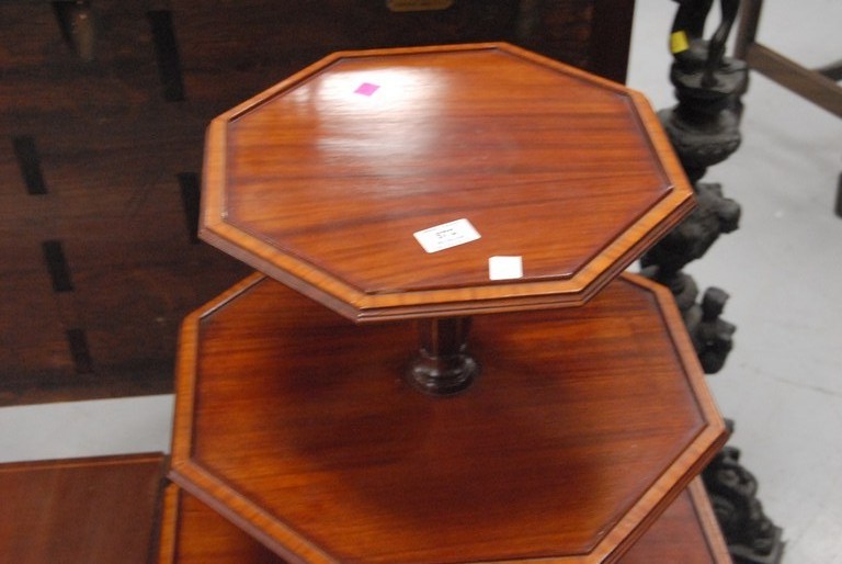 Lot 572: Fineberg mahogany three tier dumbwaiter / stand with satinwood inlaid edges and line inlaid legs, made by Fineberg, Hartford, CT. ht…