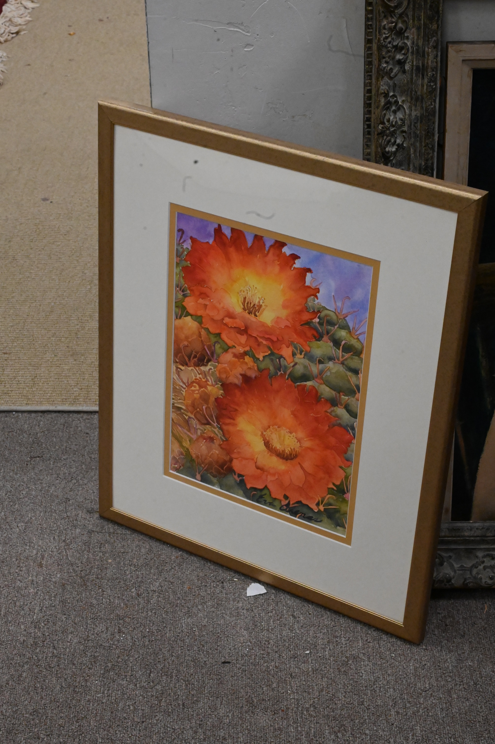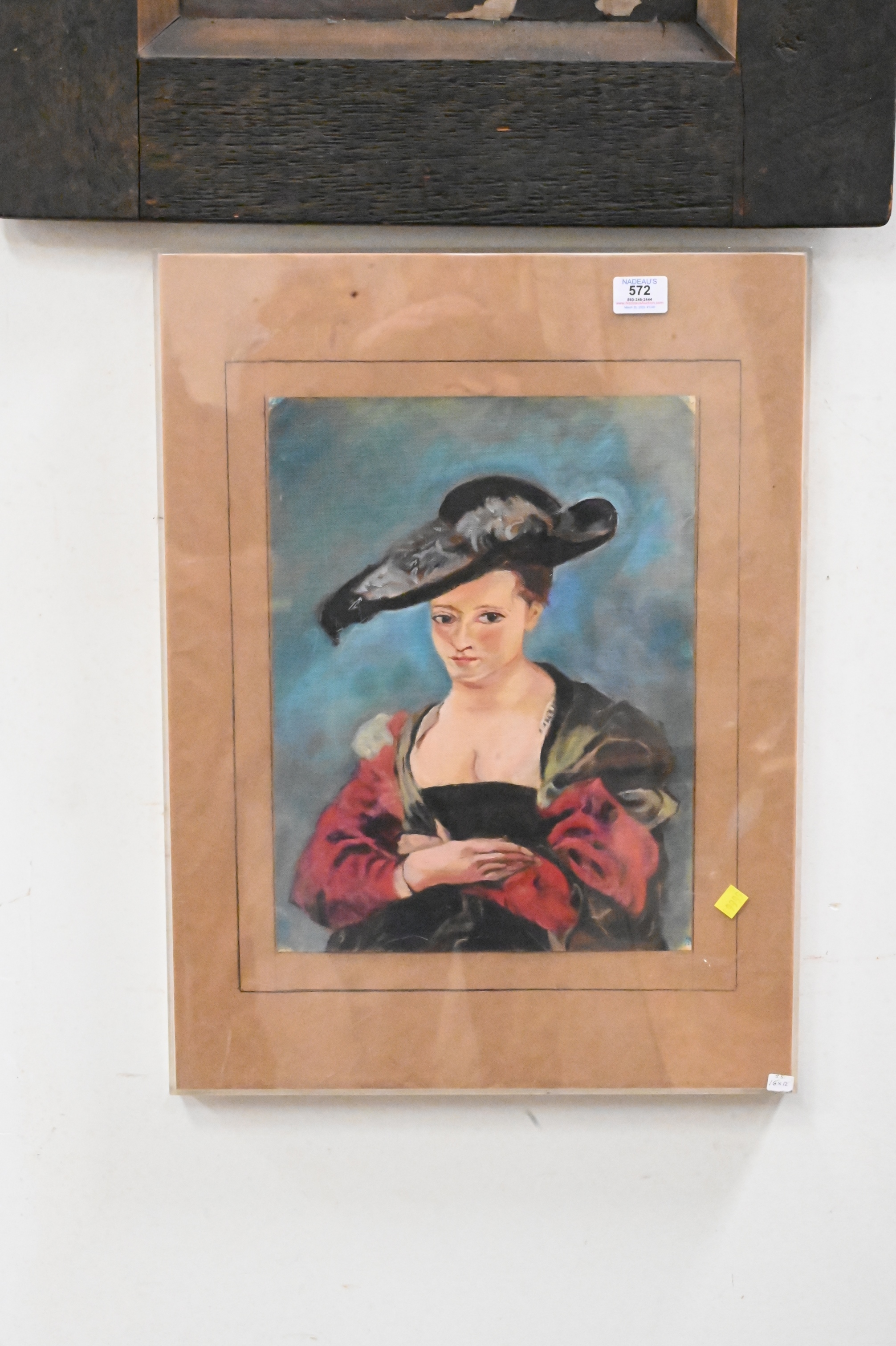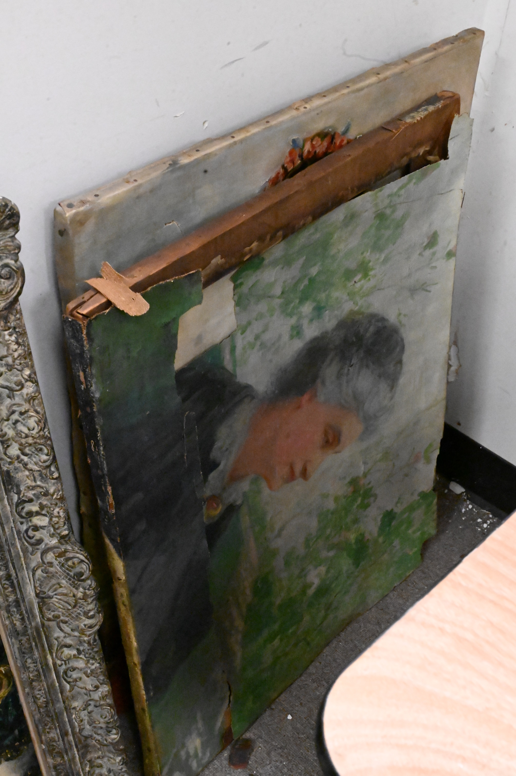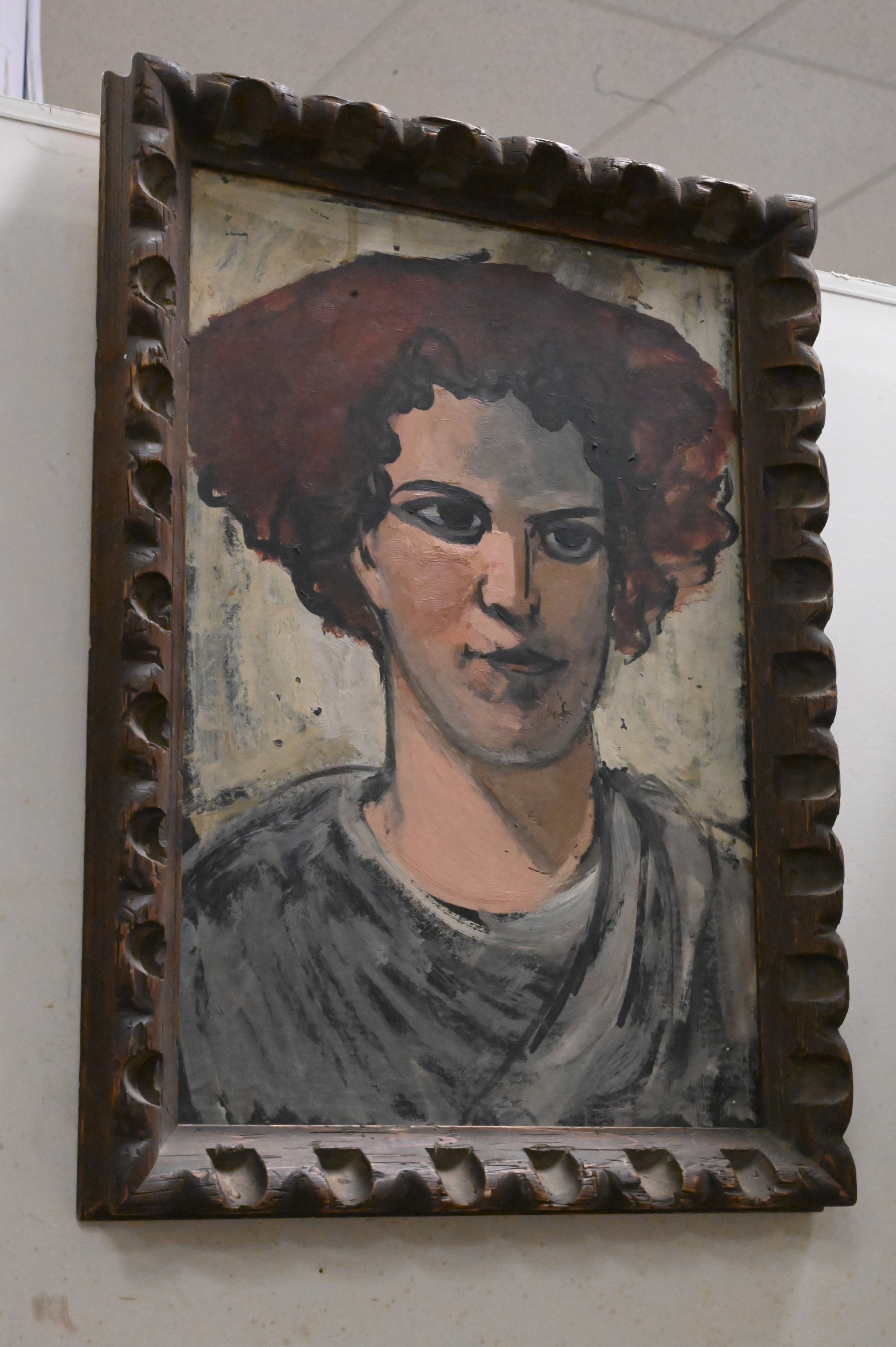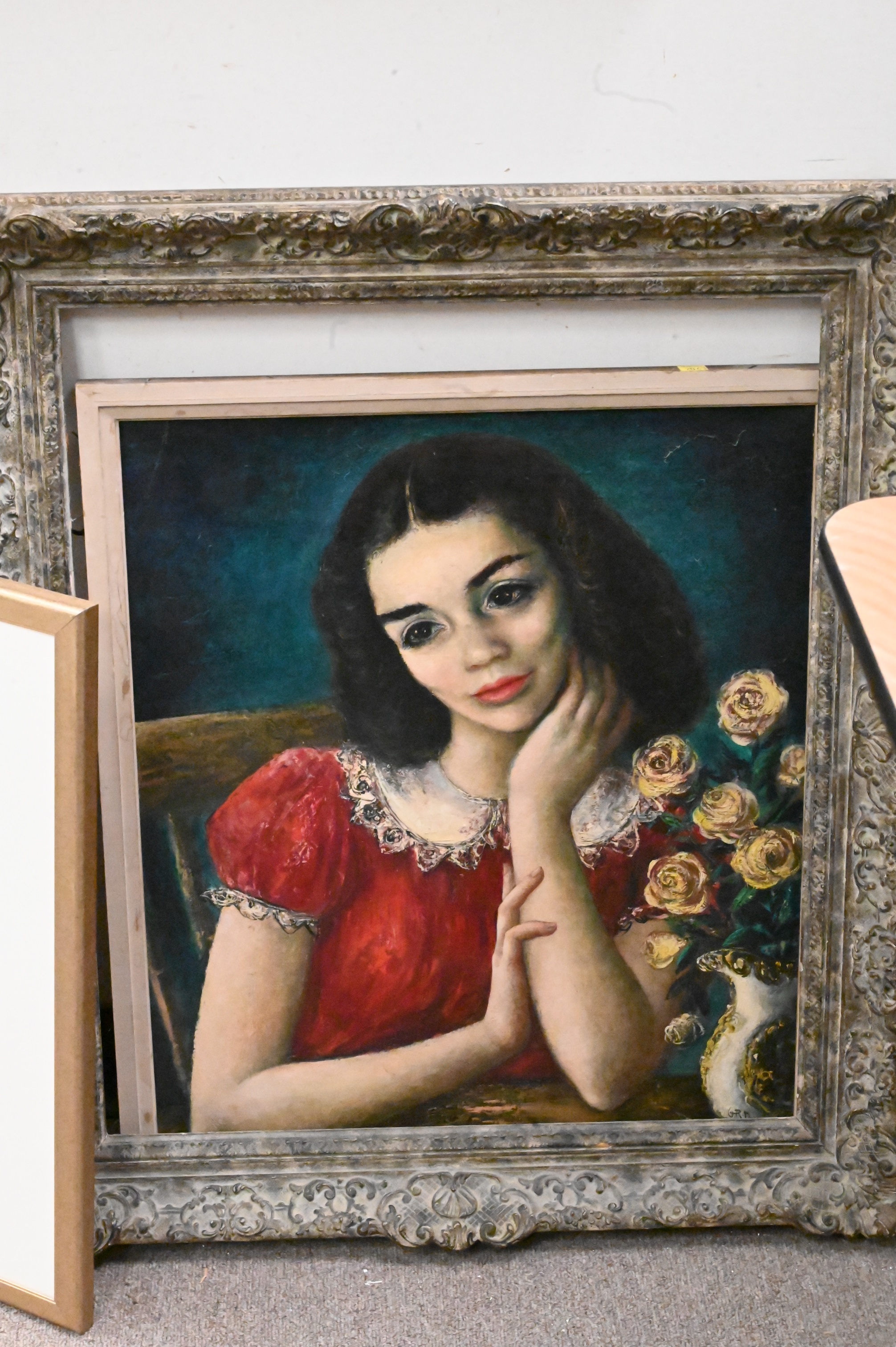 Grouping of Seven Portraits, to include Carol Deutch (b. 1935), European girl, oil on canvas; Mary Cowell, study of dog, watercolor on paper; portrait of a girl with flowers, oil on canvas, signed “G.R.D.”; a ripped oil on canvas of an older woman; portrait of a woman in a hat; abstract portrait, oil on board; along with mother holding baby, oil on canvas; largest 29″ x 23″.
