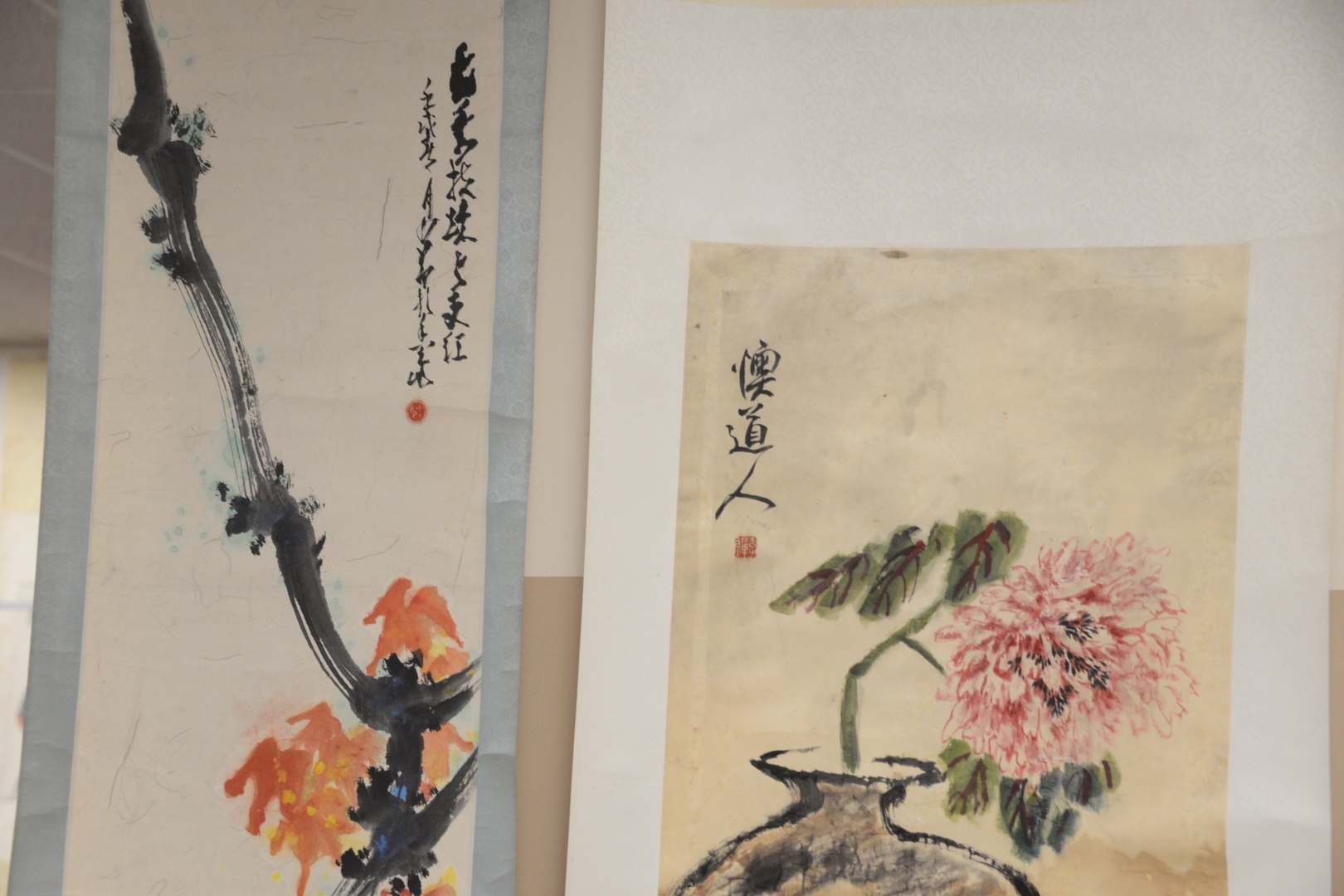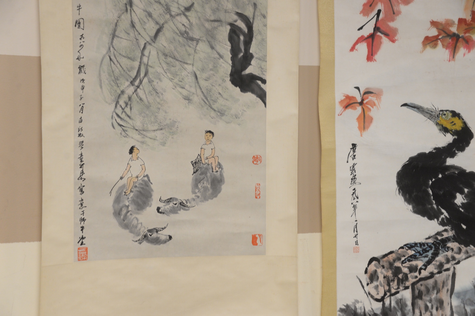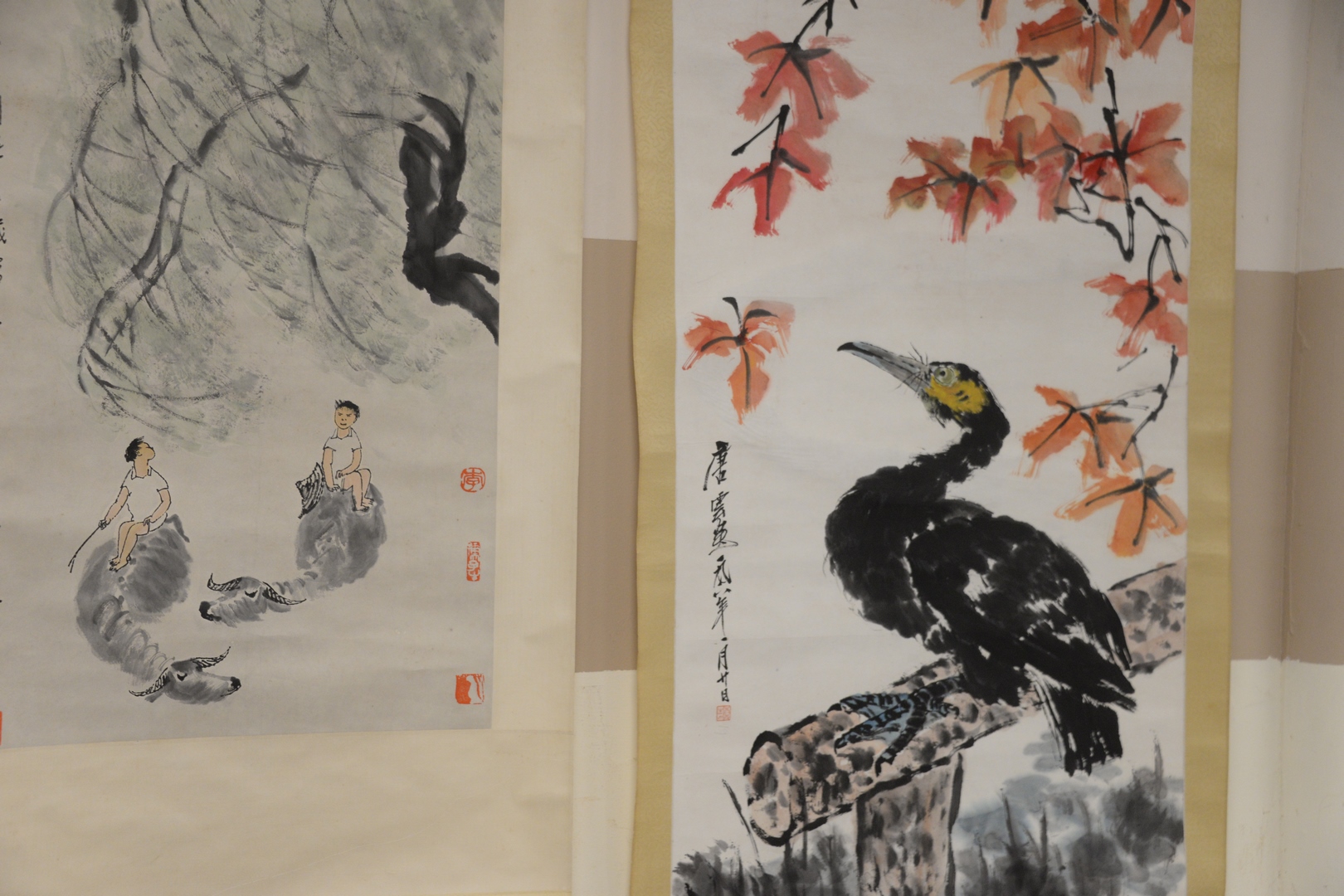 Four Oriental scrolls watercolor bird in branch 49 x 14, watercolor still life plant in pot 30 x 16, watercolor two boys on water buffalo 27 x 17, and watercolor duck on log under tree 53 x 22.