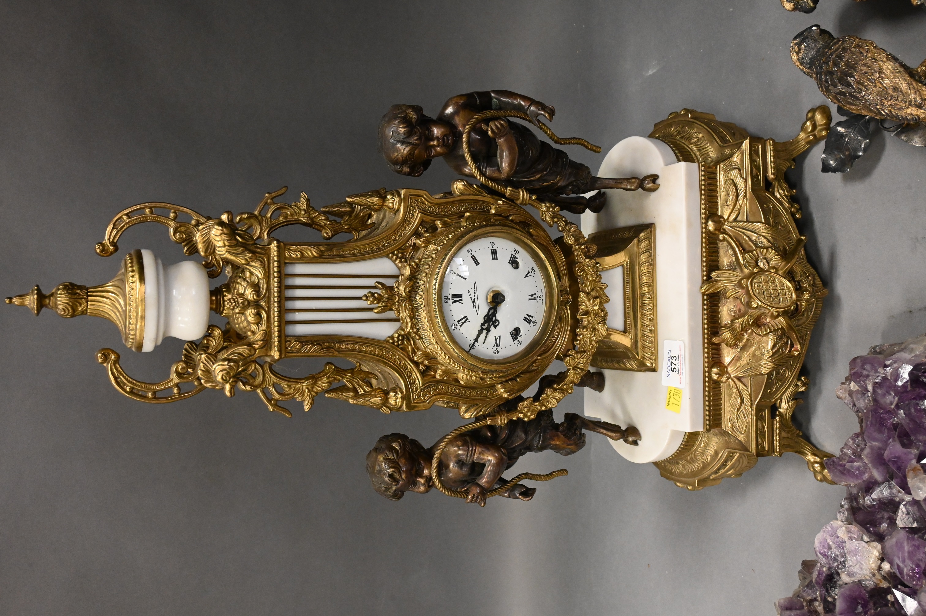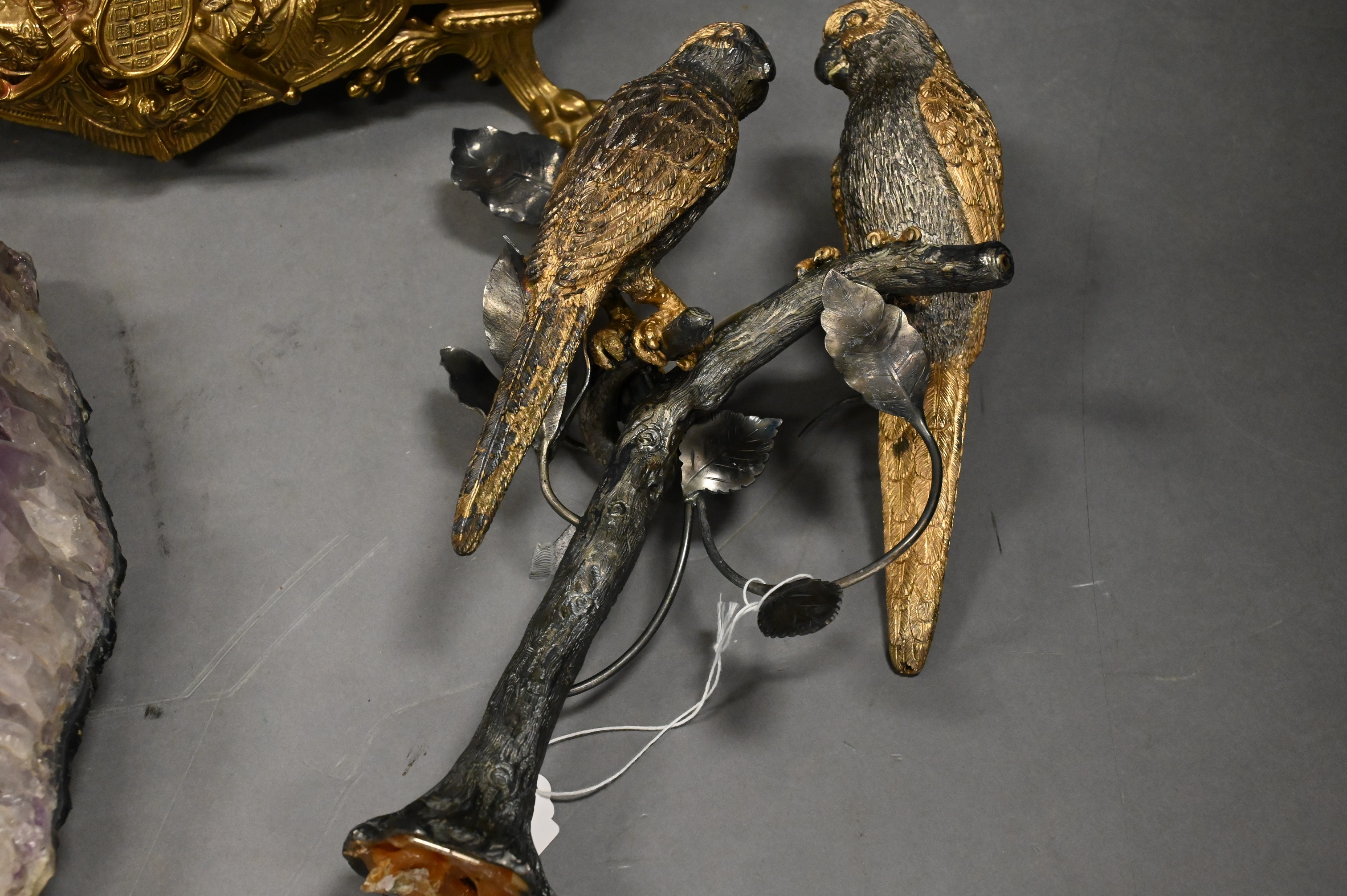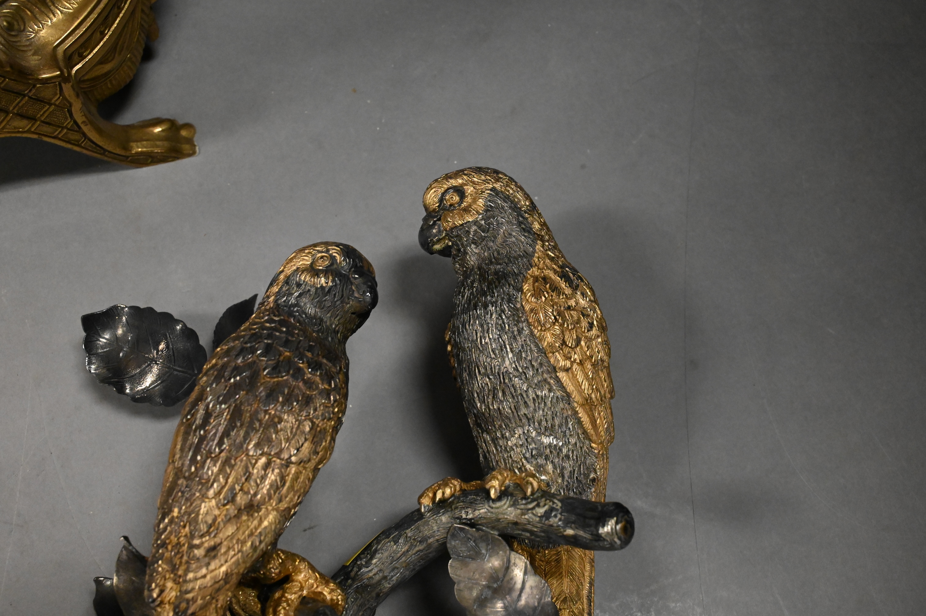 Lot 573: French Figural Brass Mantle Clock having Two Putti Figures and Purple Quartz with a Pair of Metal Parrots