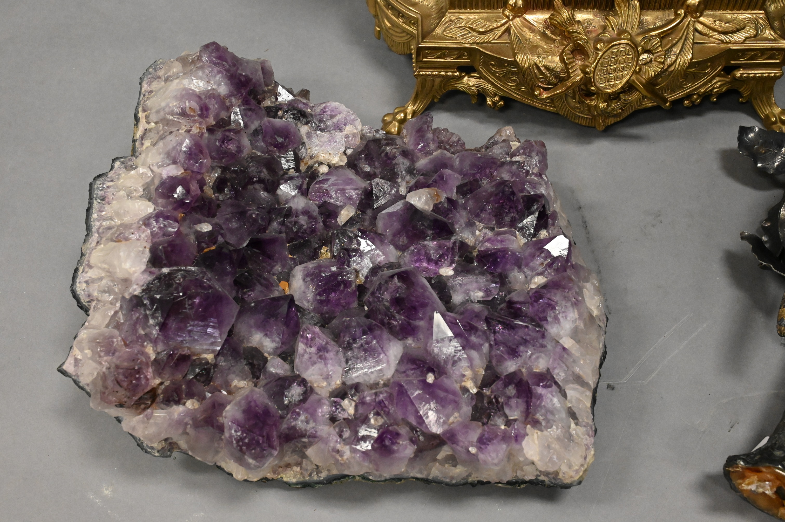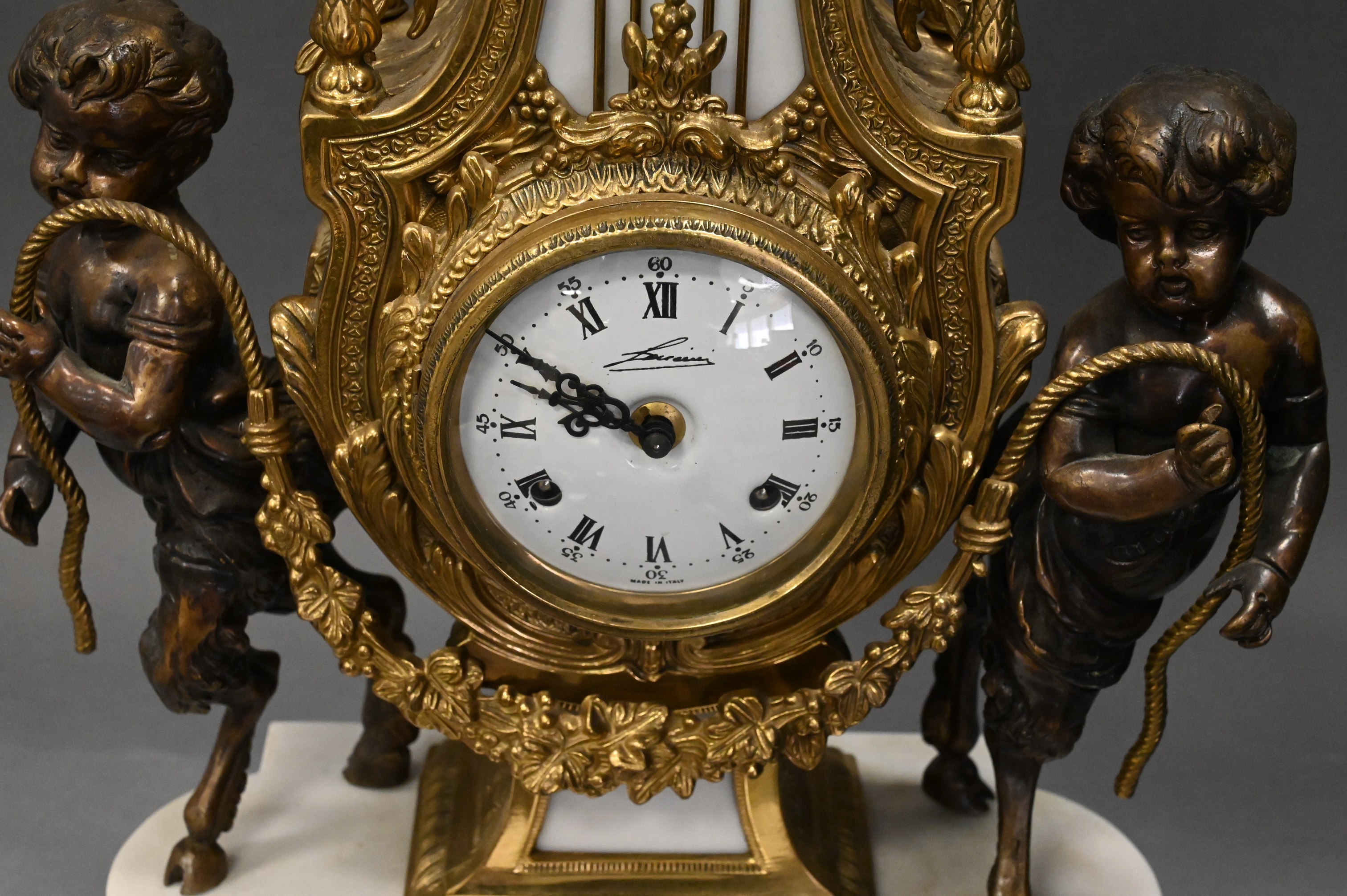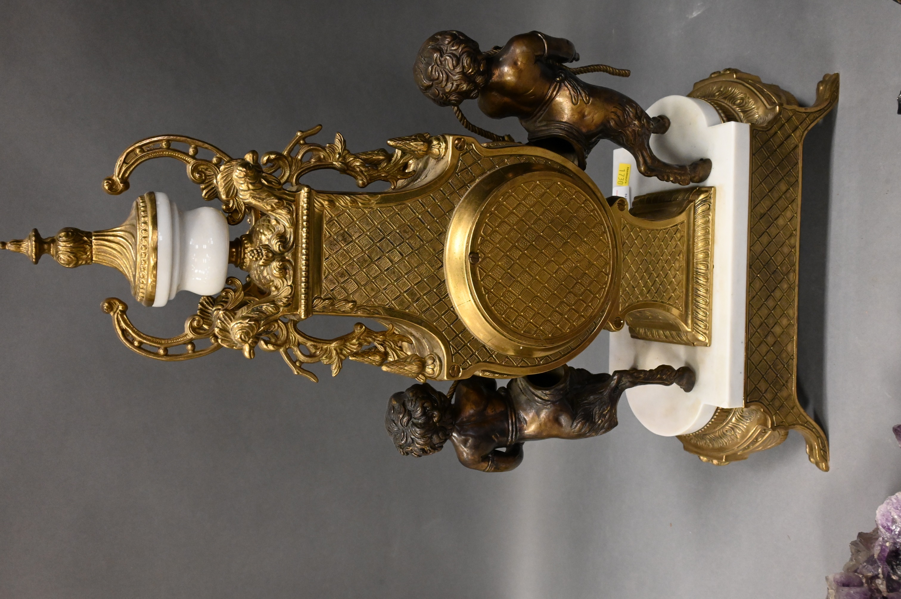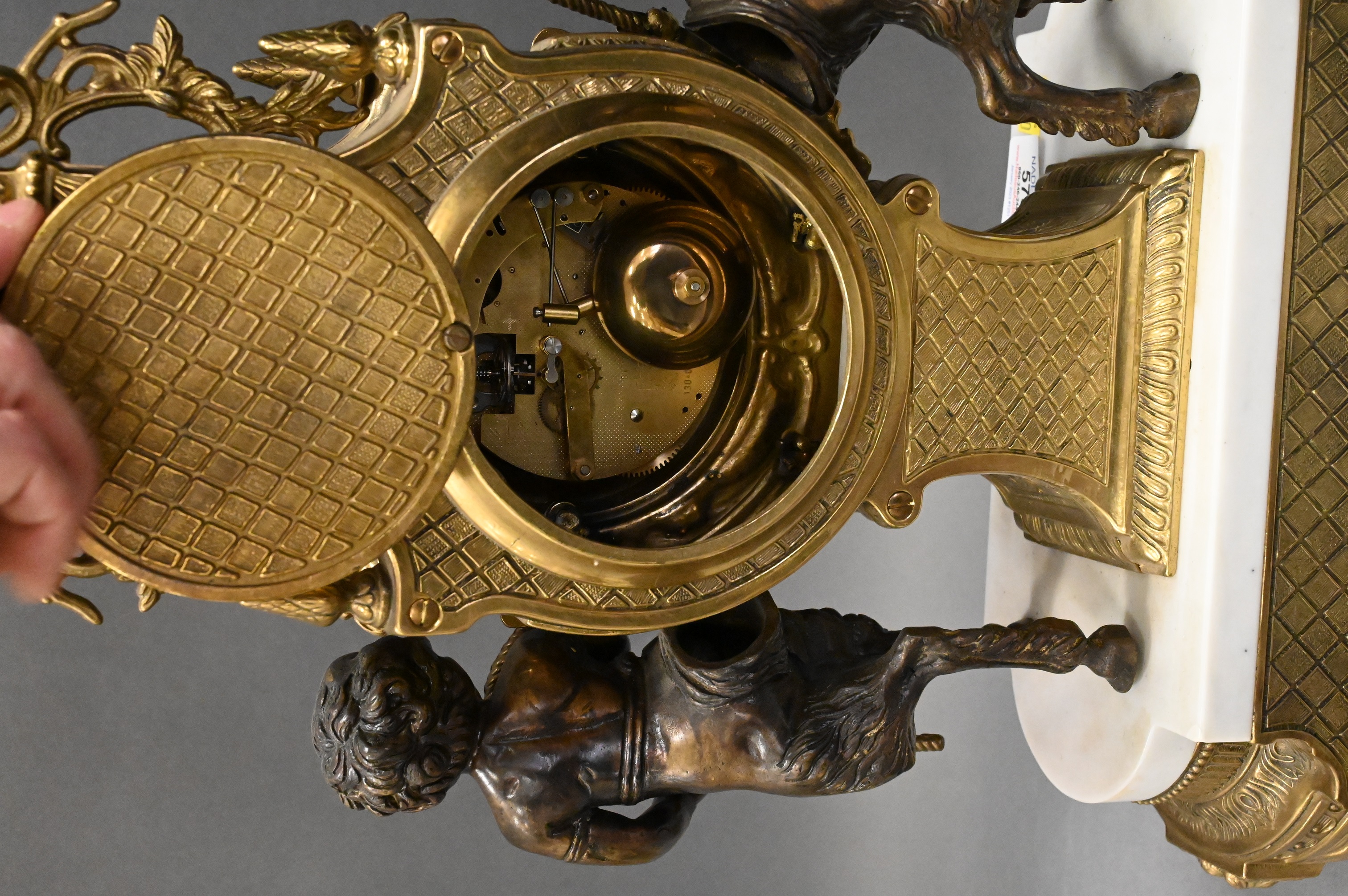 Lot 573: French Figural Brass Mantle Clock having Two Putti Figures and Purple Quartz with a Pair of Metal Parrots