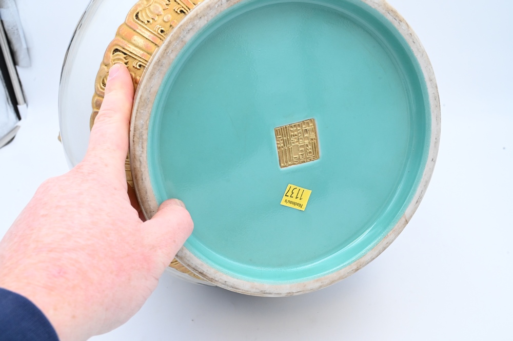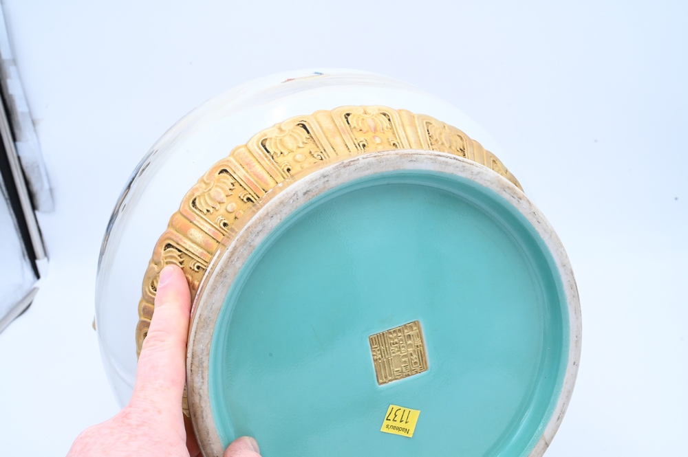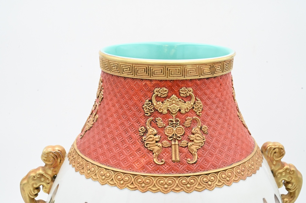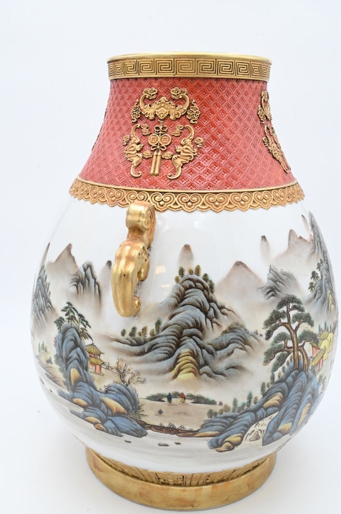 Lot 573: Large Chinese Porcelain Niutou Zun Vase, having painted landscape scene with gilt molded bats and gold handles, height 18 inches.