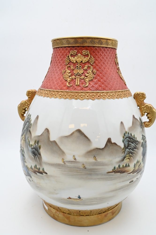 Large Chinese Porcelain Niutou Zun Vase, having painted landscape scene with gilt molded bats and gold handles, height 18 inches.