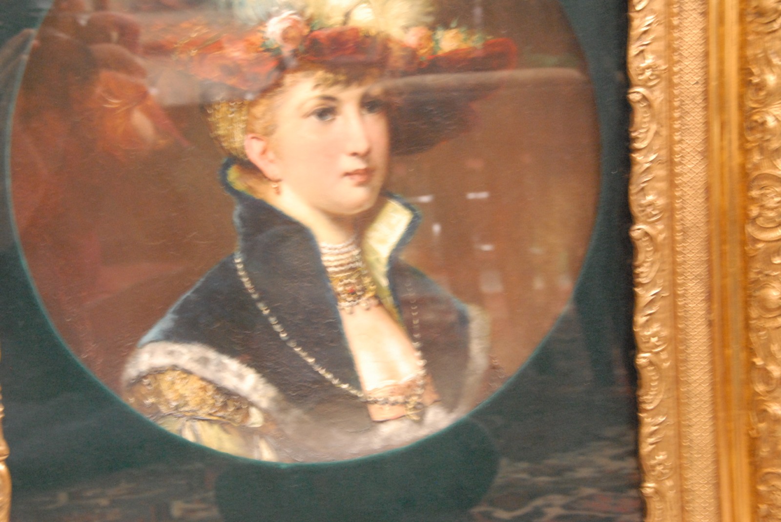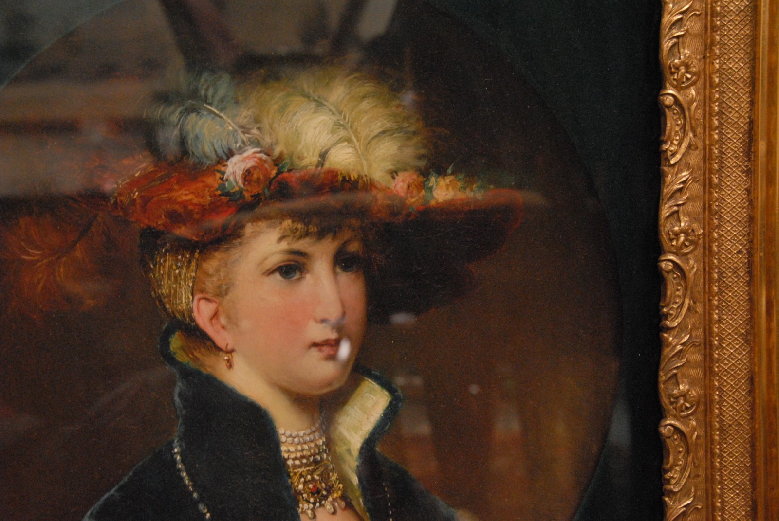 Painting on porcelain charger Victorian woman in a feathered hat in shadow box frame.