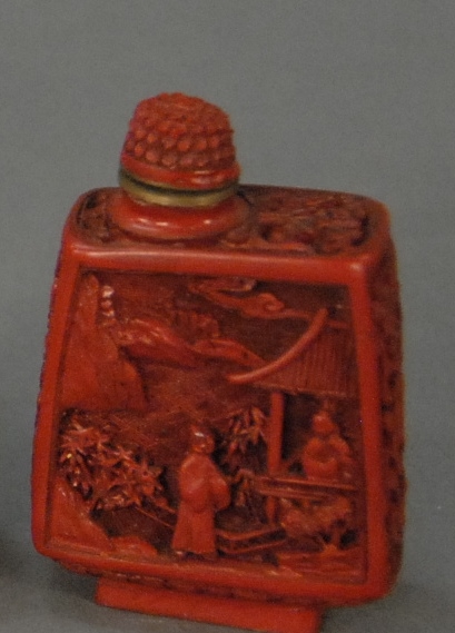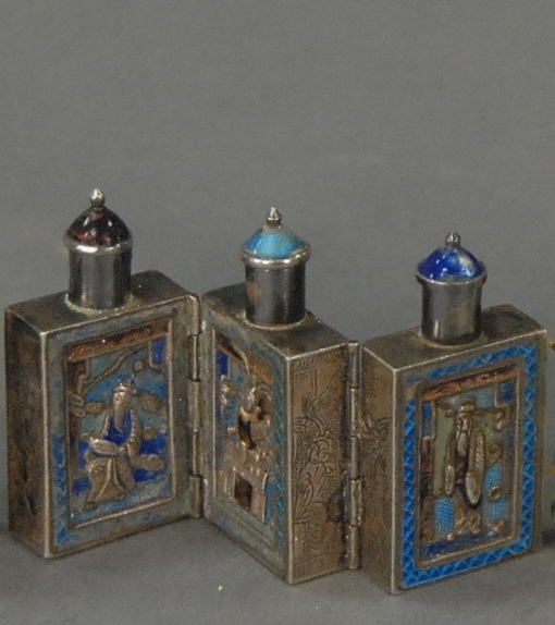 Lot 573: Two snuff bottles to include hinged metal enameled triple snuff bottle 19th century in the form of rectangular bottles with screen hinged to fold flat with Daoist immortal and reverse with inscription, and a cinnabar snuff bottle.