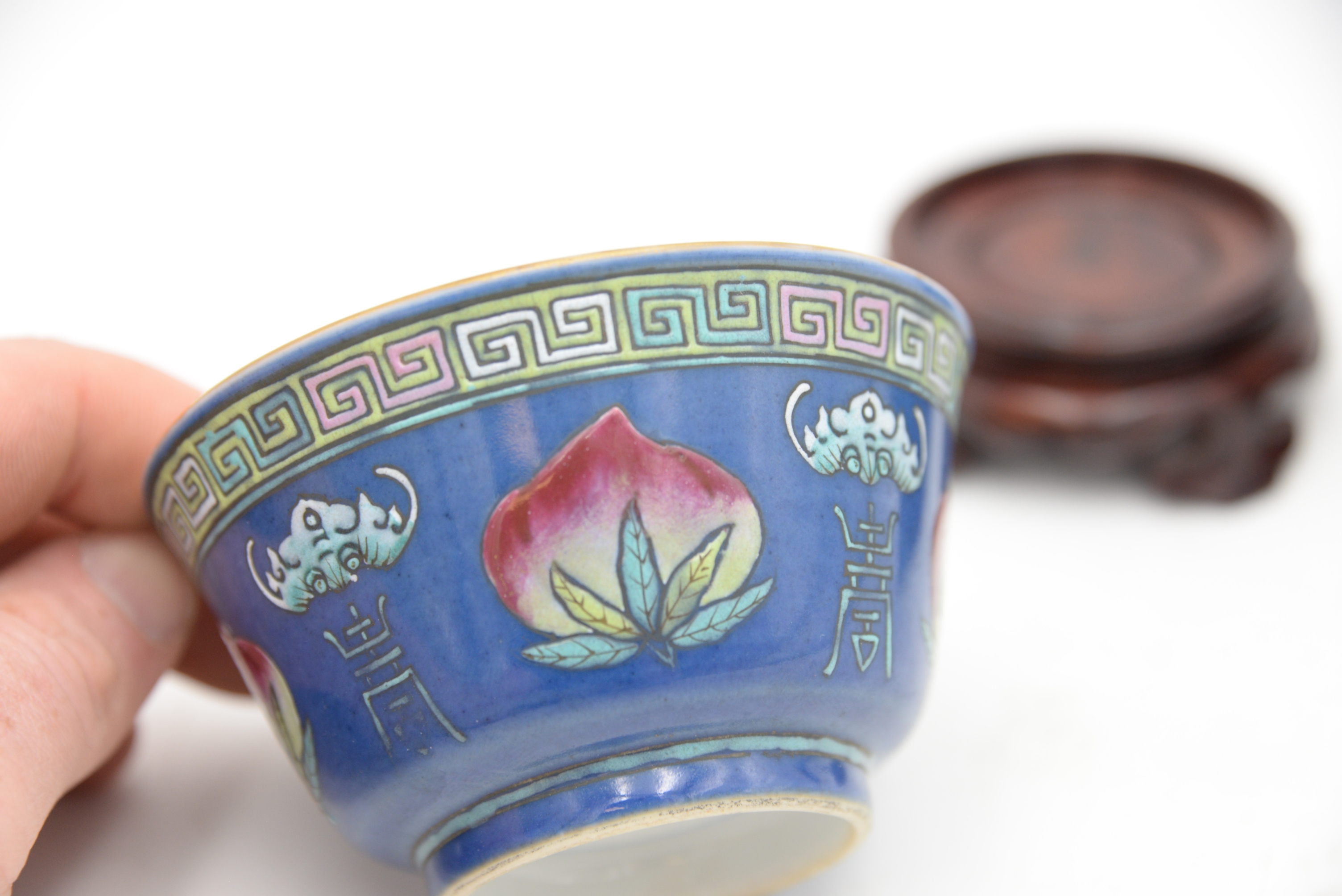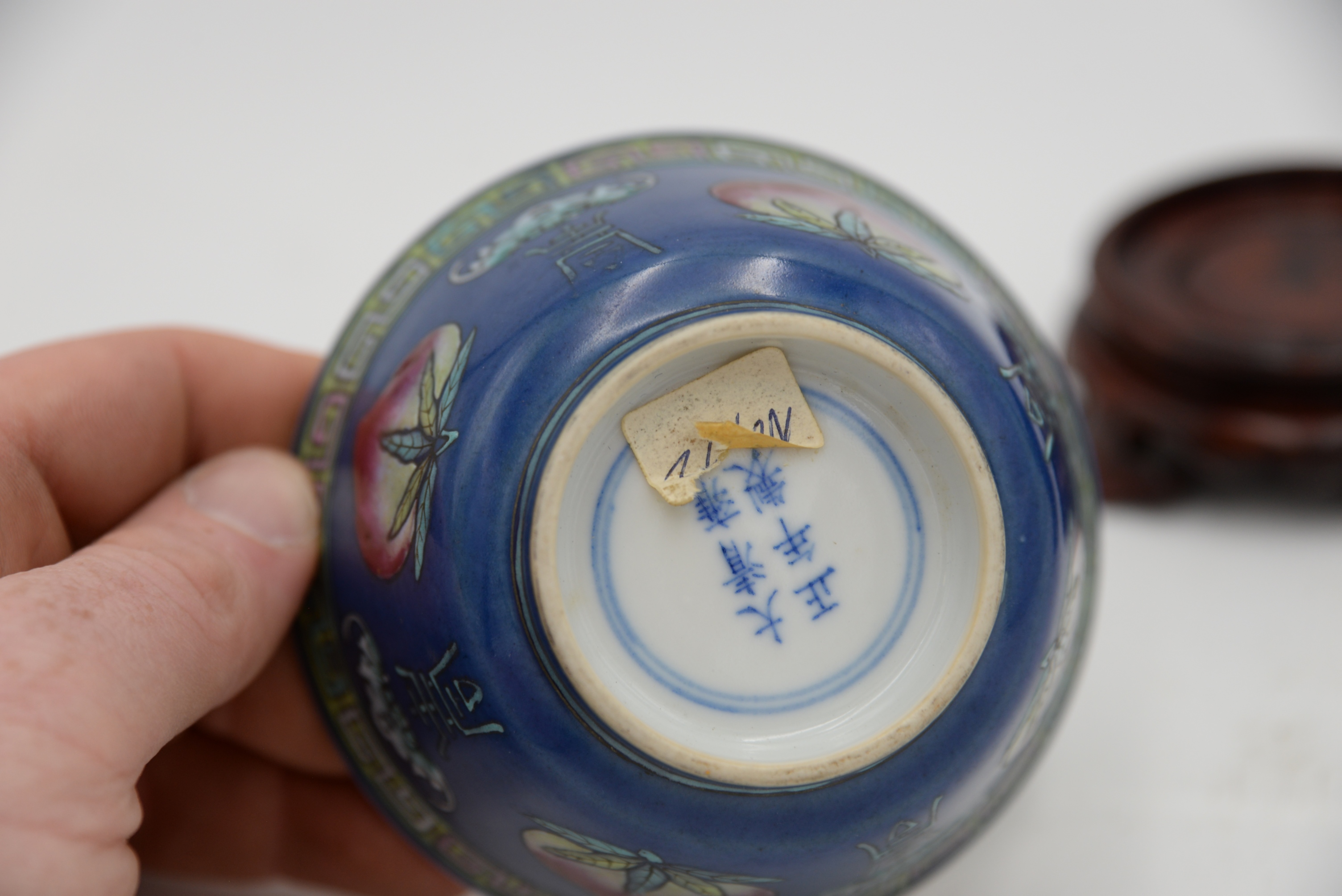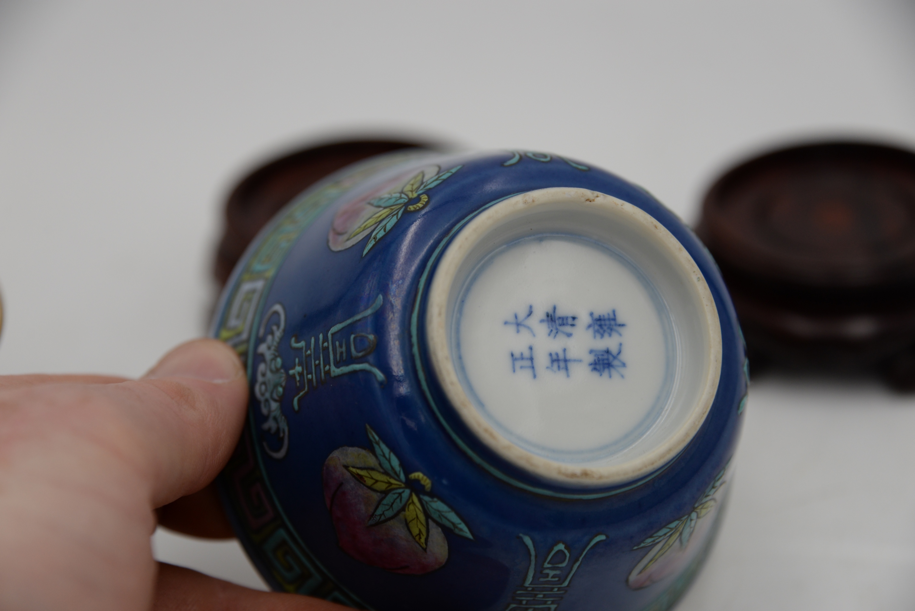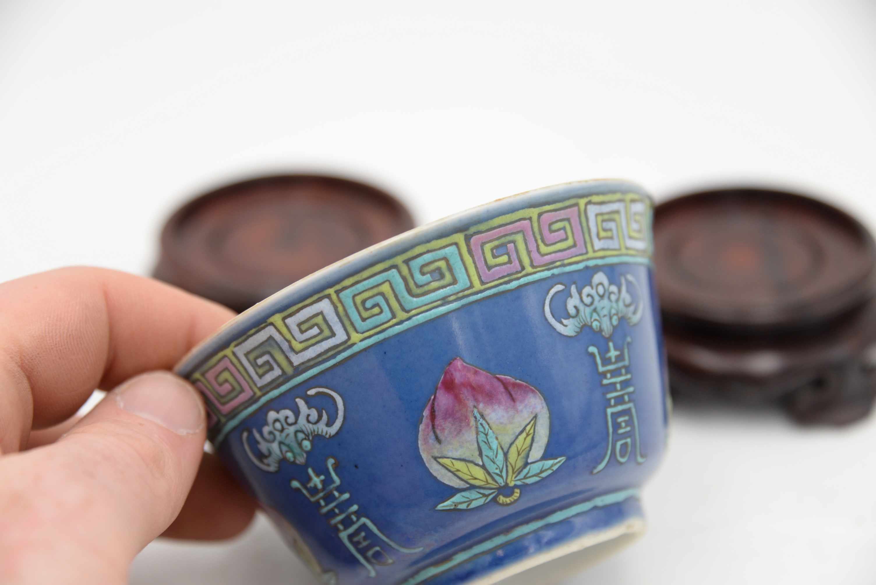 A Pair of Chinese Porcelain Bowls, 18th century having blue ground, enameled in colors with peaches alternating with bat’s above Shou characters on blue ground, six character marks within double circles in underglaze blue, on carved wood stands, height 2 1/4 inches, diameter 4 inches.