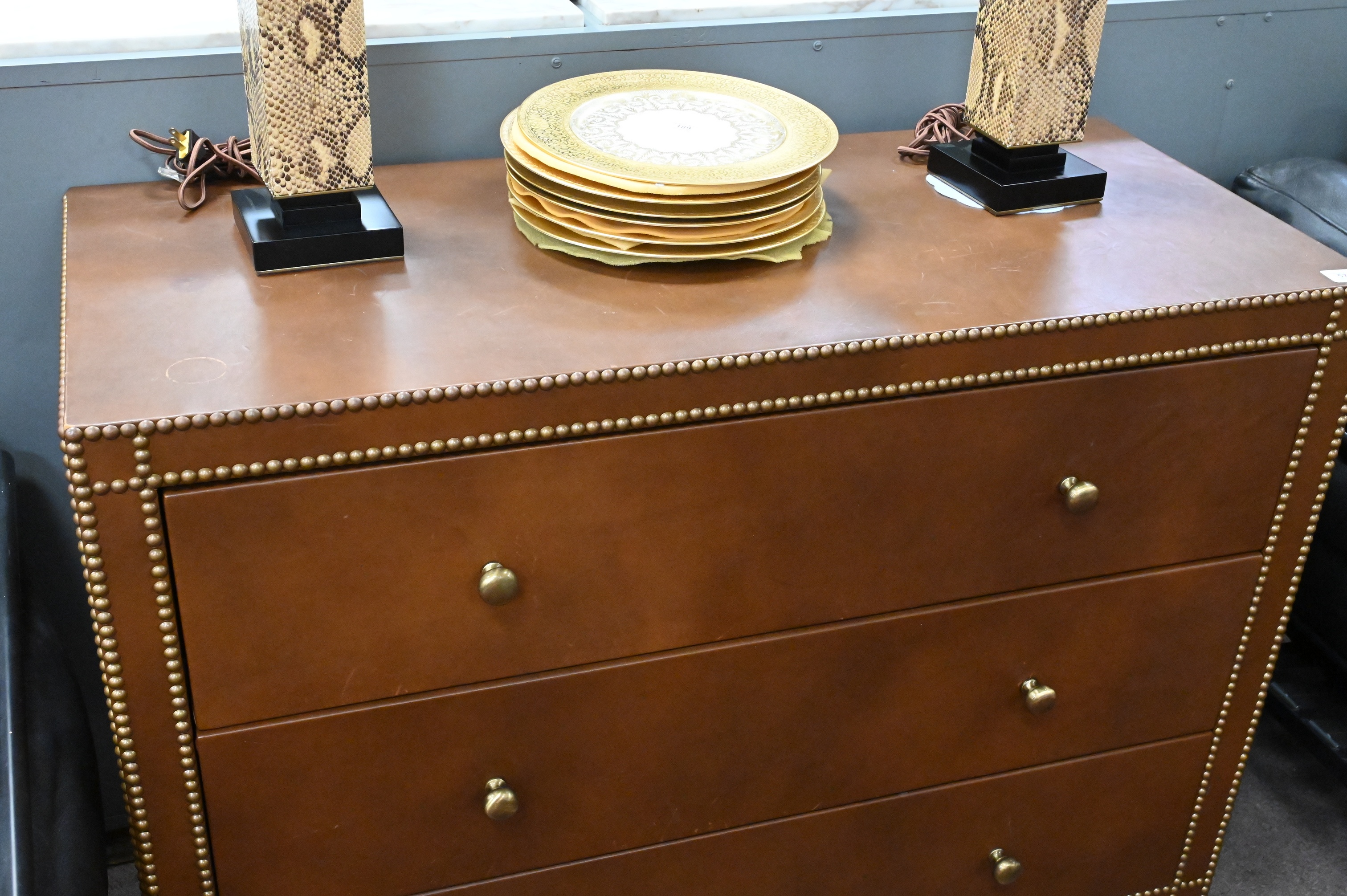 having nailhead finish and three drawers