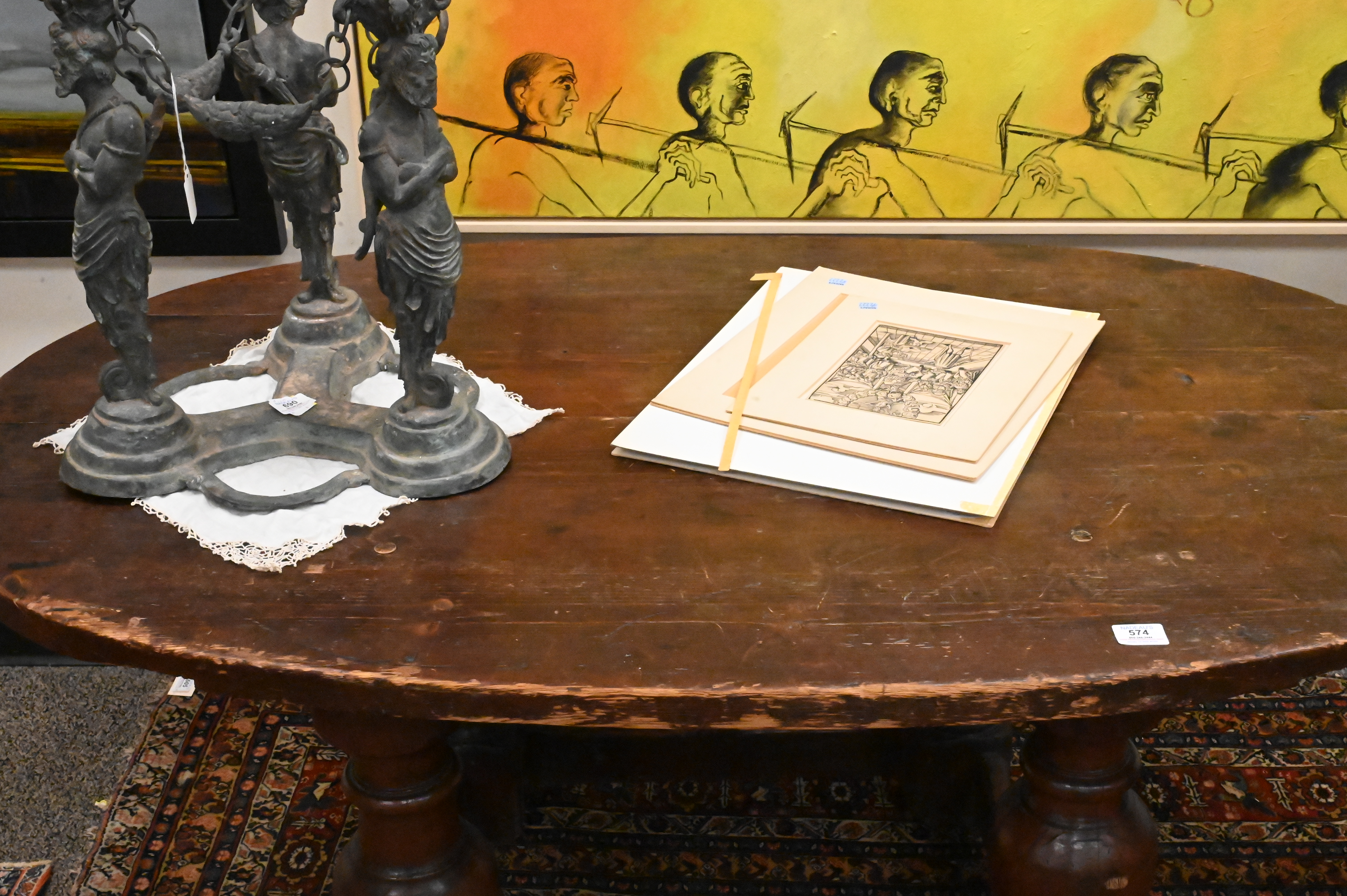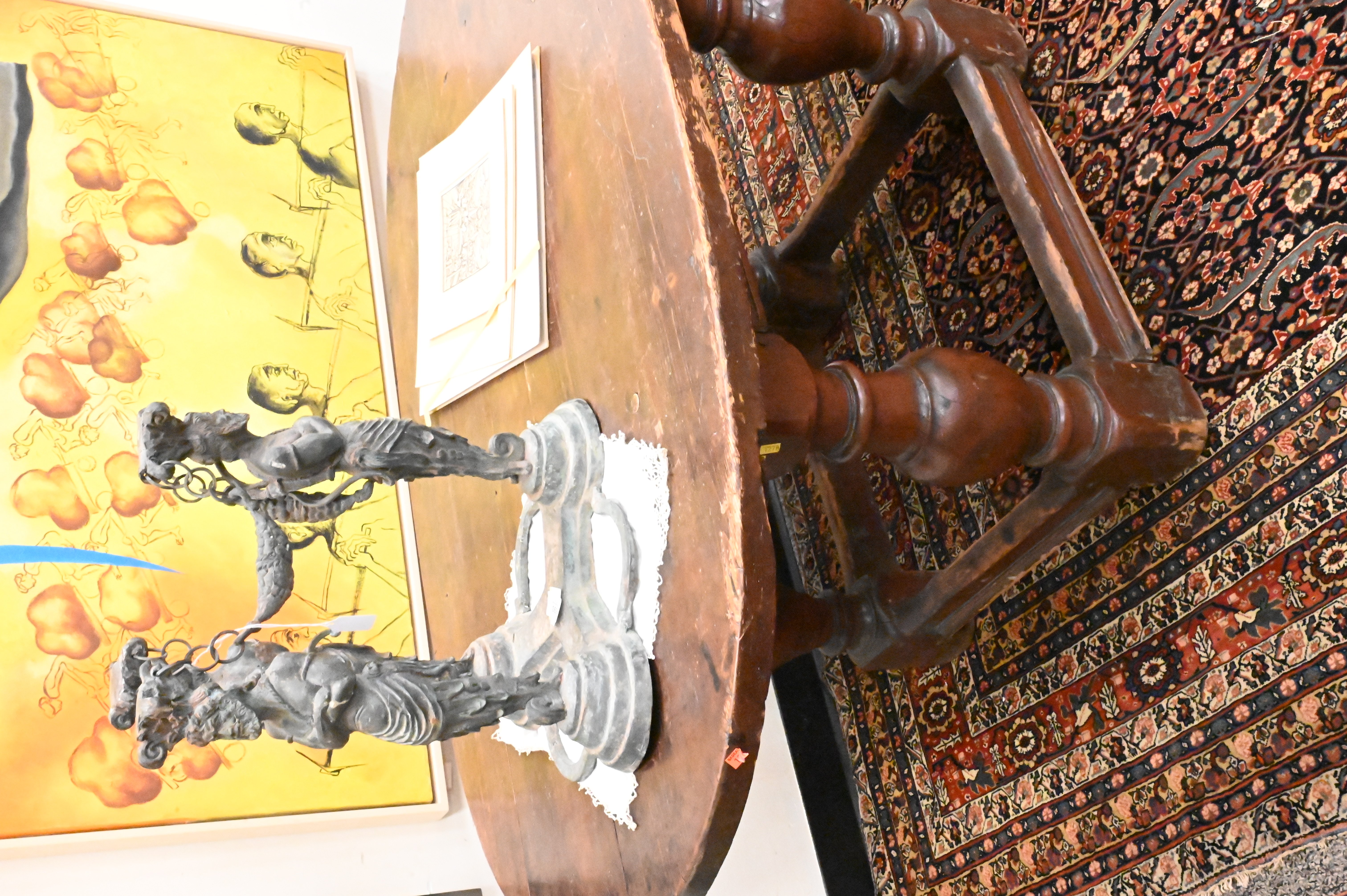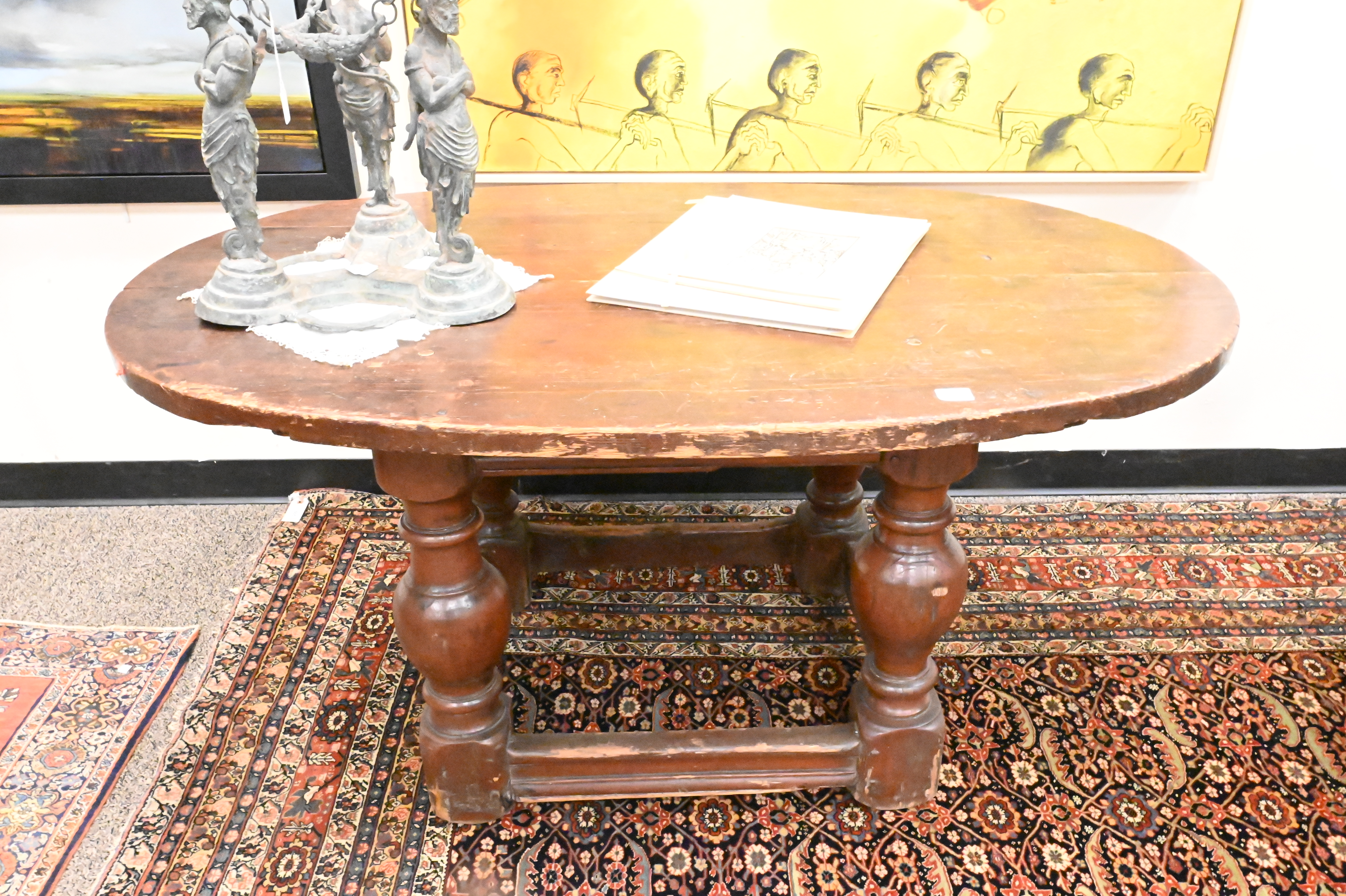 Continental Center Table the oval top on large turned legs with box stretcher height 27 1/2 inches, top 36 1/2″ x 58 1/2″ Provenance: Estate of Peter Tillou, Litchfield, Connecticut