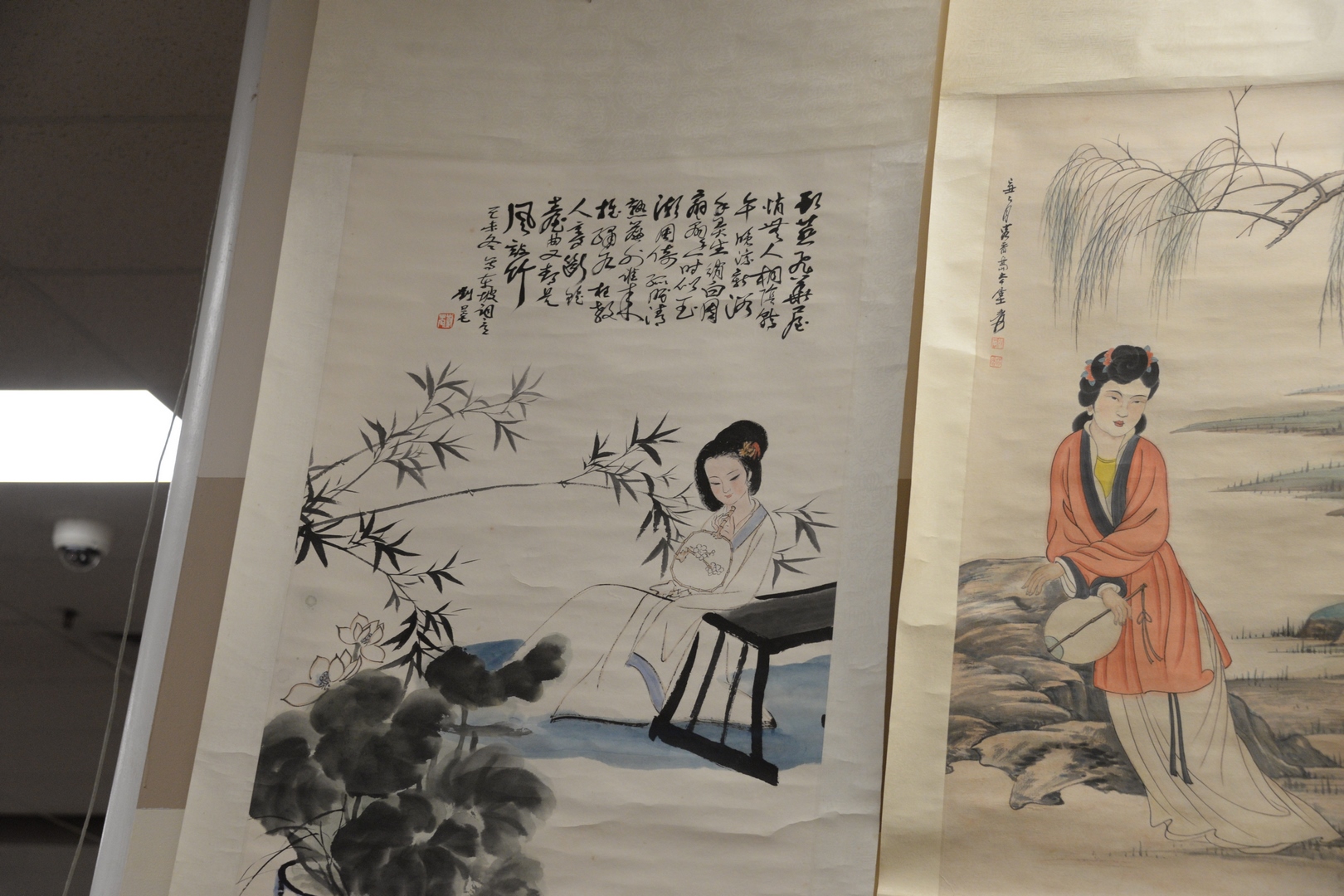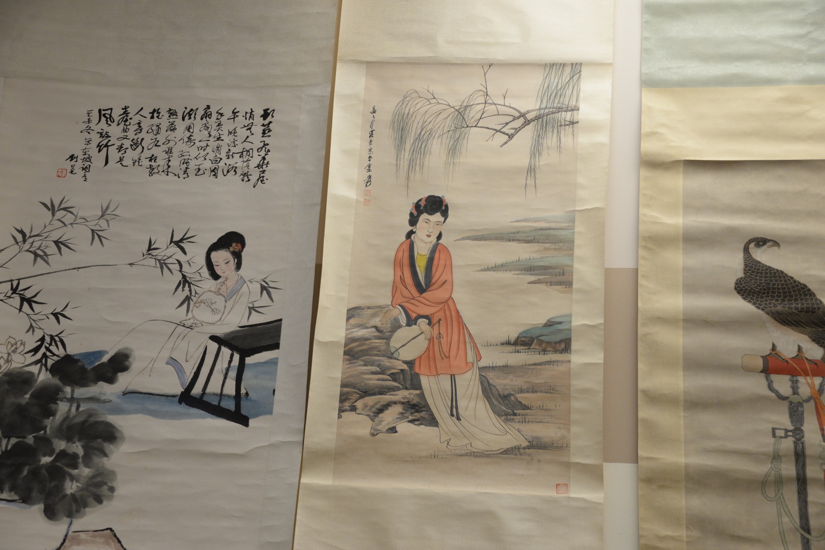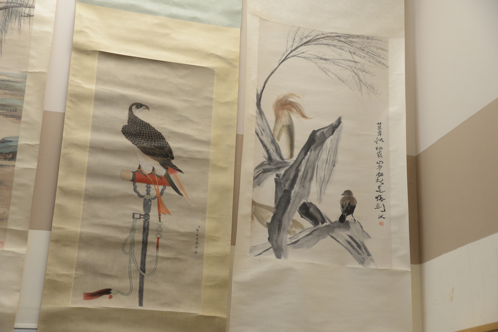 Lot 574: Four Oriental Scrolls to include watercolor bird on branch 35 x 26 and watercolor of falcon on stand 35 x 16 along with watercolor seated Guanyin 49 x 26 and watercolor Guanyin standing by trees 37 x 18.