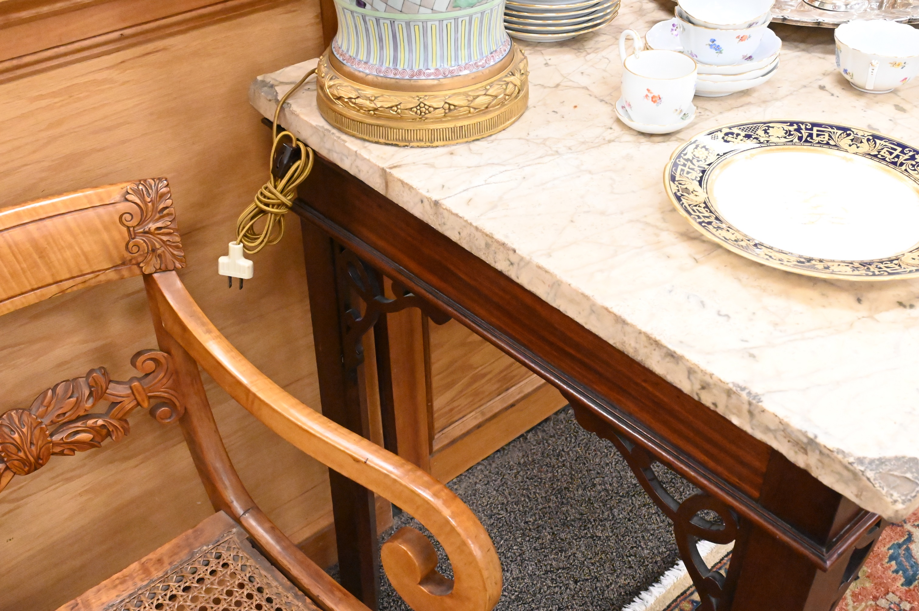 Lot 574: Large Mahogany Pier Table having Marble Top Set on Squared Legs