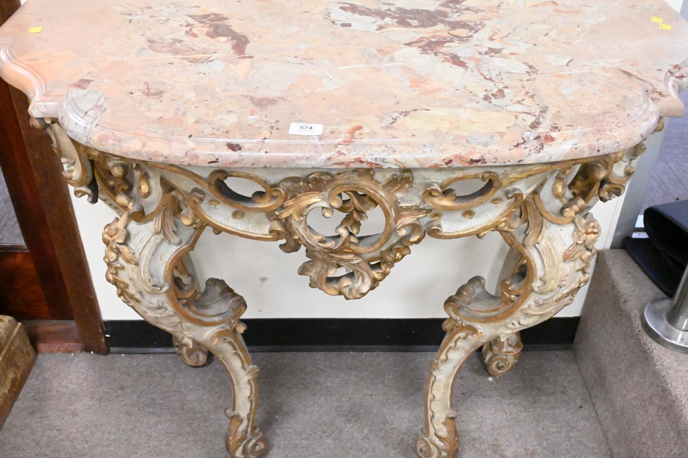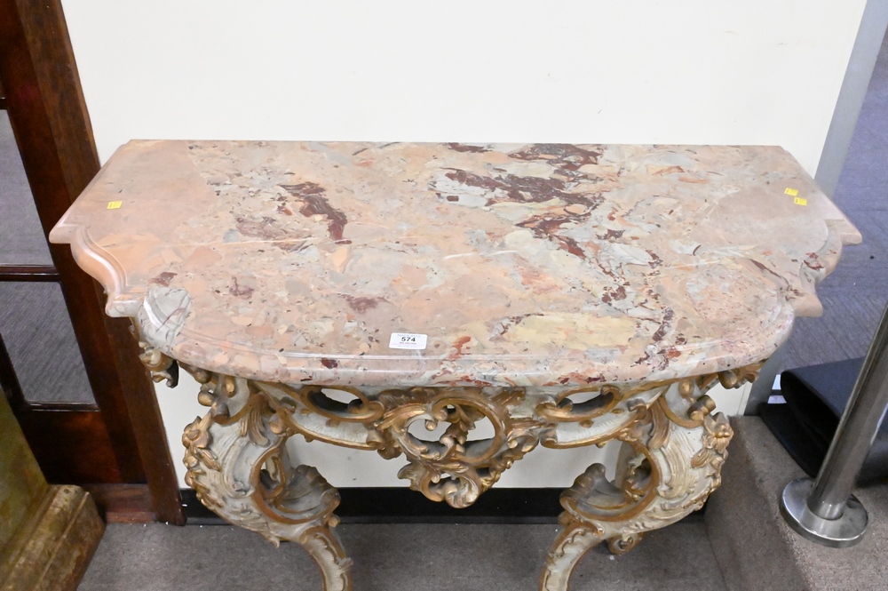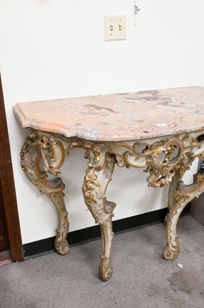 Lot 574: Louis XV Pier Table, having shaped marble top with parcel gilt and light green paint, pierce carved skirt, and carved legs, 18th century, height 35 inches, top 22″ x 43″. Provenance: Estate of Wallace Bradway, New Haven, CT.