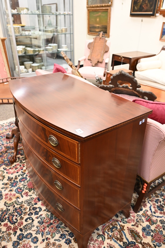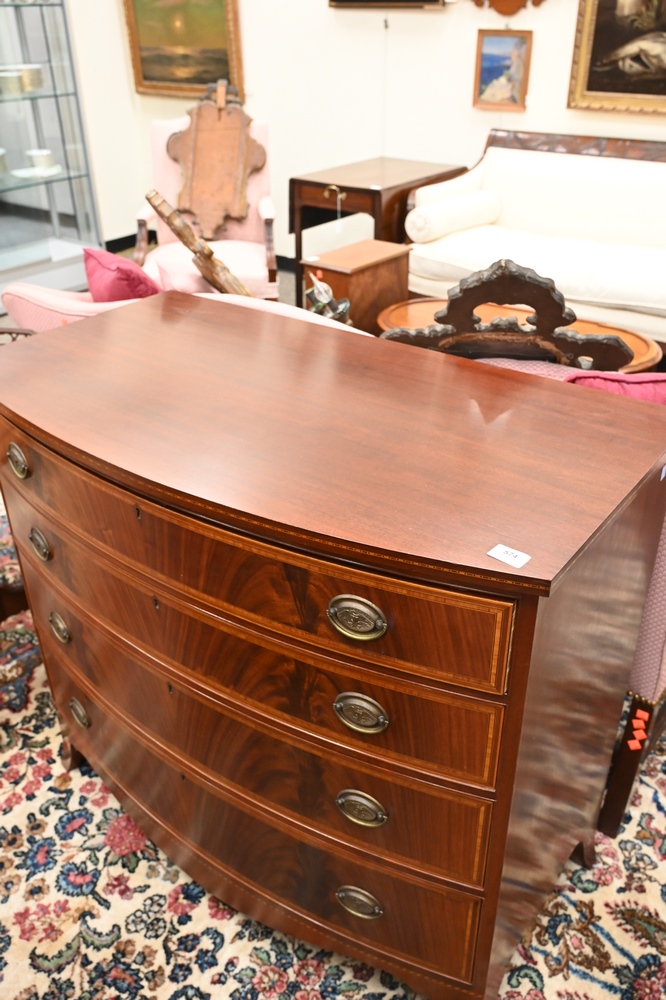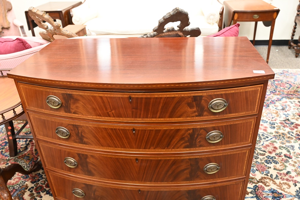 Lot 574: Margolis Custom Mahogany Chest, having bowed front with crotch mahogany drawers framed in light wood inlay, all set on French feet,…