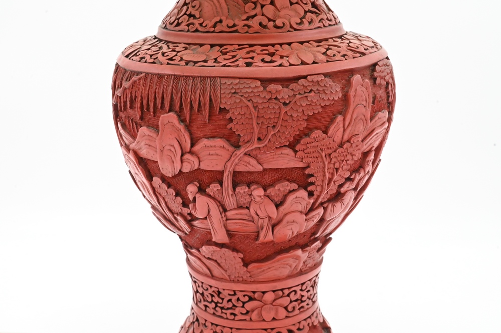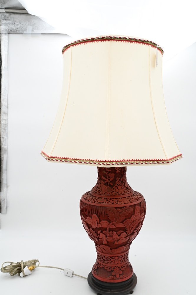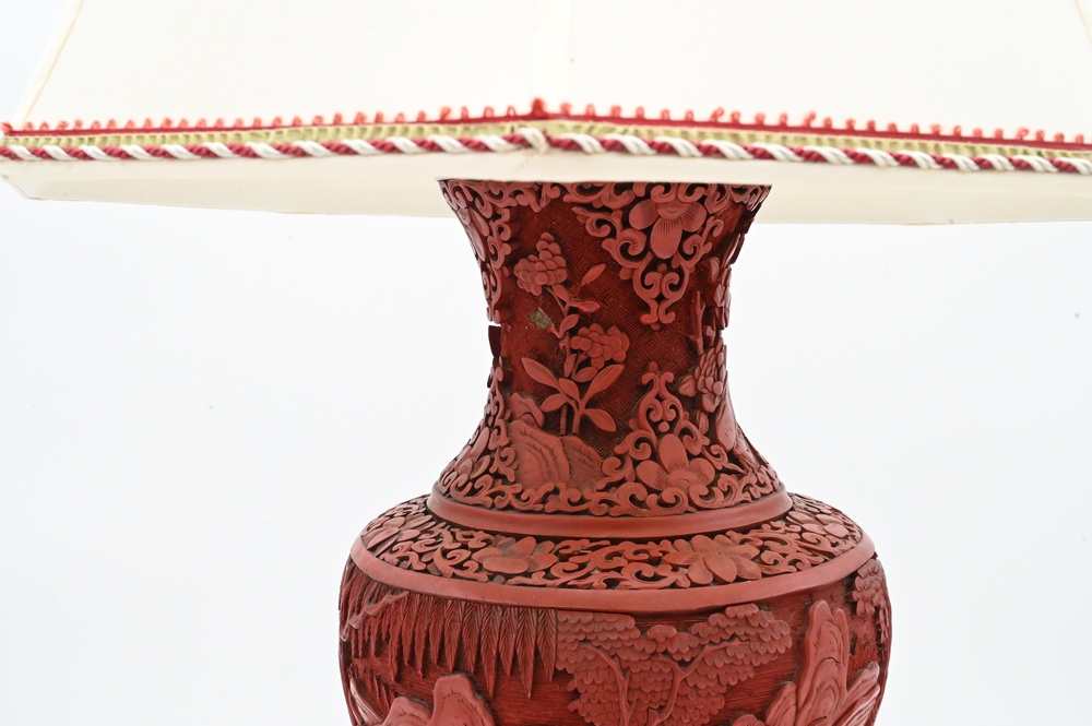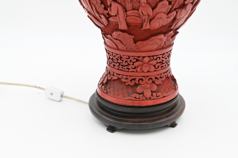 Lot 575: Cinnabar Lacquered Vase, made into a table lamp, mountainous scene, vase height 17 inches, total height 29 inches.
