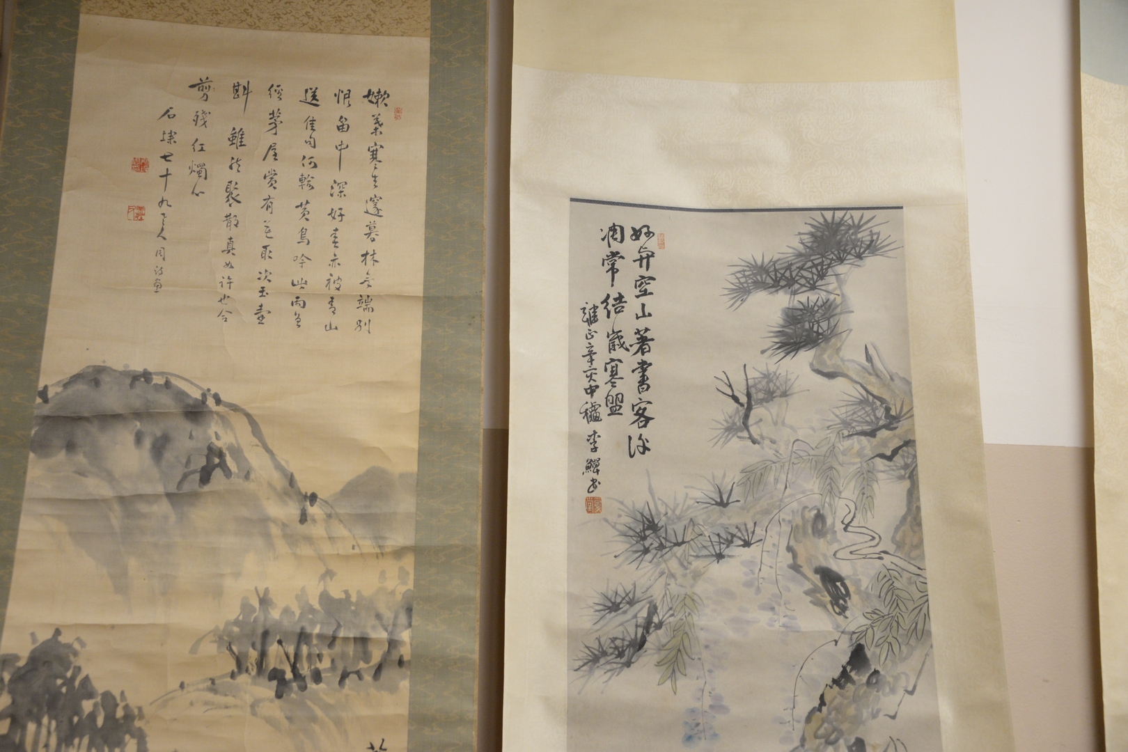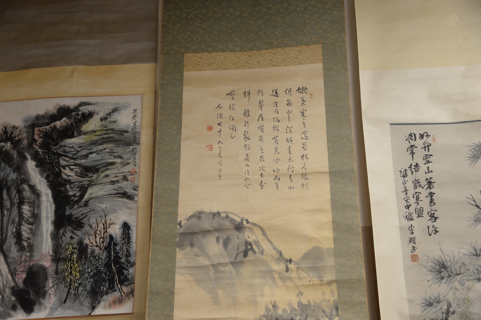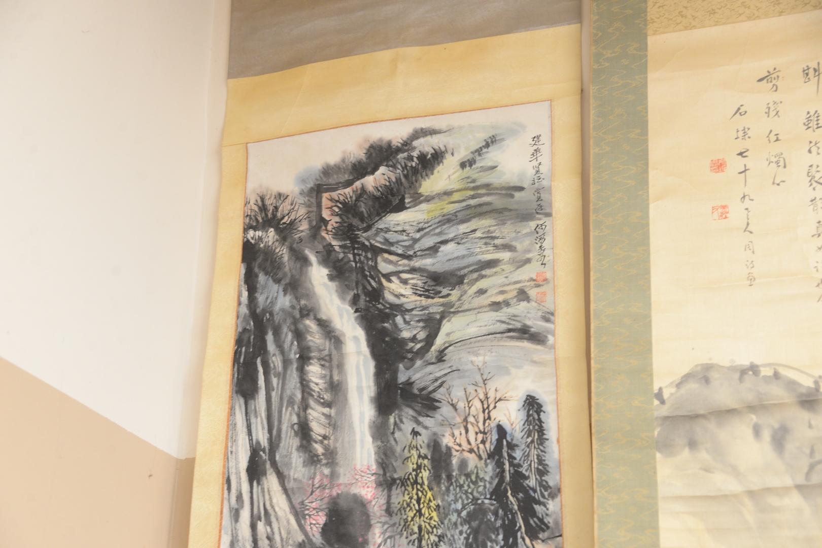 Lot 575: Group of four Oriental scrolls watercolor on paper of scholar with bat 30 x 17, watercolor on paper mountains with waterfall 26 x 18, watercolor mountainous landscape 68 x 17, and watercolor of scrolling pine 38 x 17.