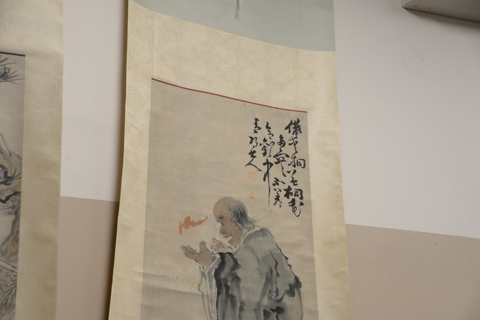 Group of four Oriental scrolls watercolor on paper of scholar with bat 30 x 17, watercolor on paper mountains with waterfall 26 x 18, watercolor mountainous landscape 68 x 17, and watercolor of scrolling pine 38 x 17.