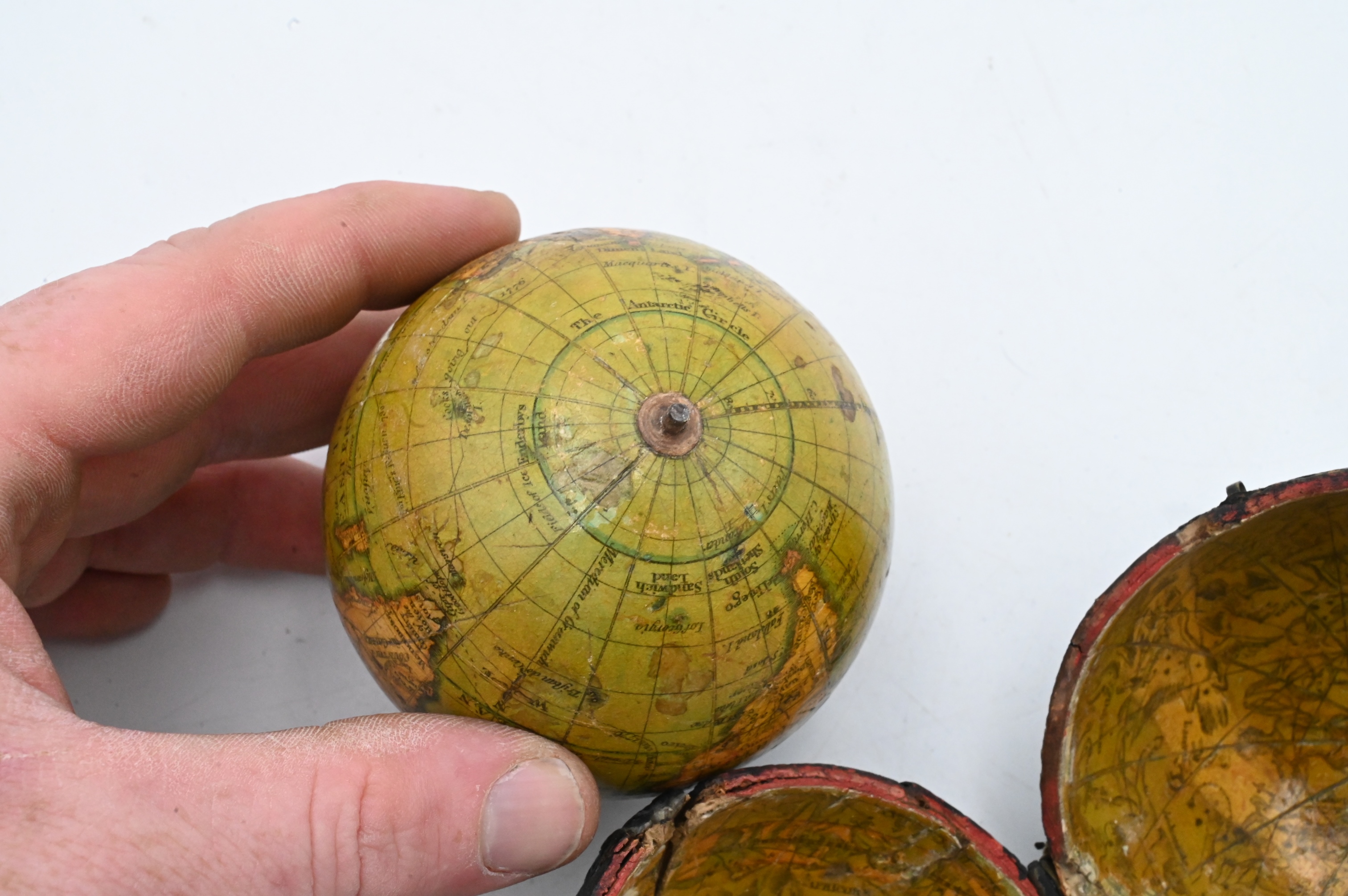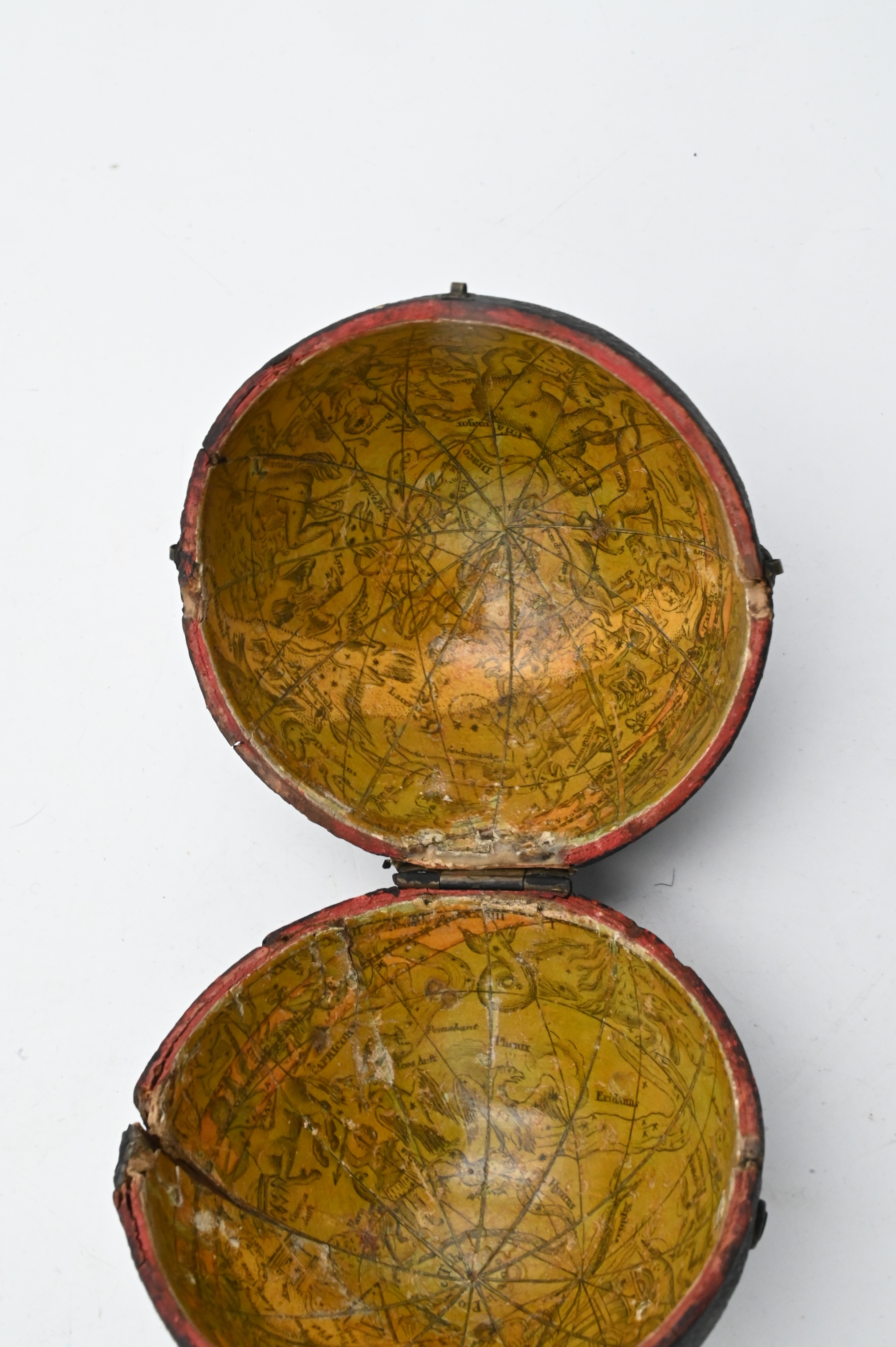 Lane’s Pocket Terrestrial Globe with Shagreen Case, titled “Lane’s Improved Globe London”, having shagreen case with celestial gores depicting constellations, diameter of globe 3 inches, diameter of case 3 1/2 inches. Condition: presents well, minor finish loss to globe, case with 1 1/2 inch crack and minor loss.