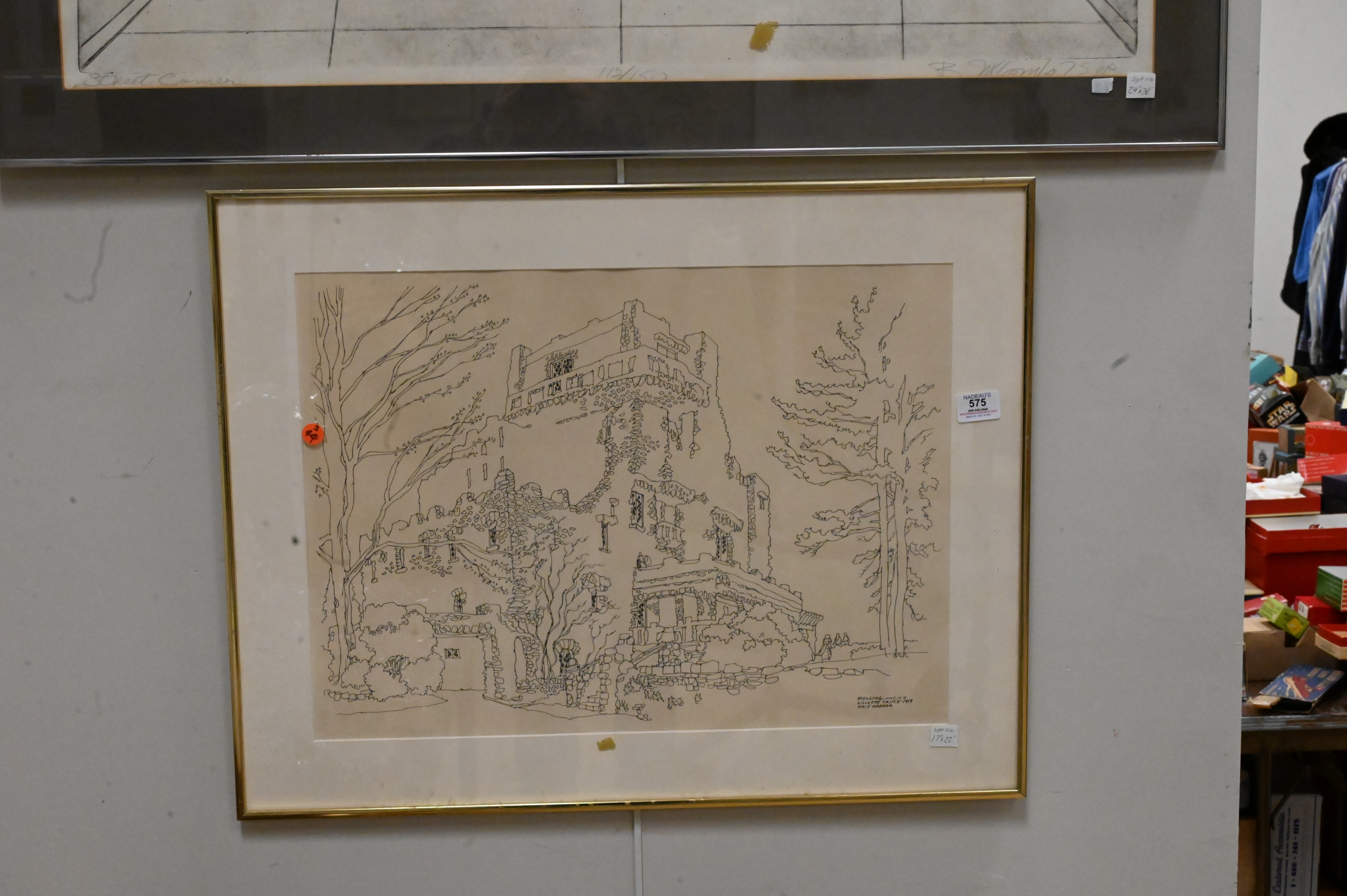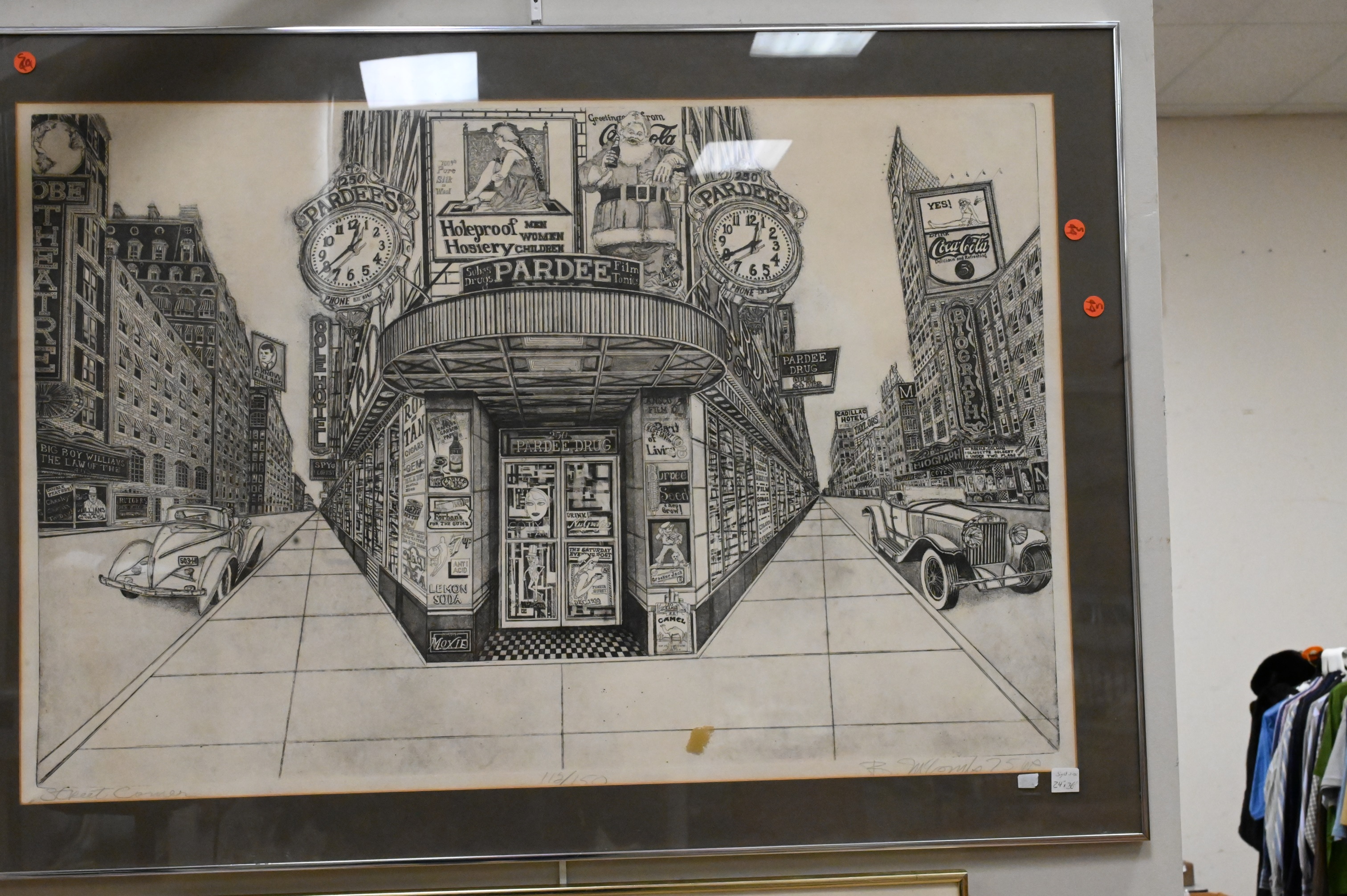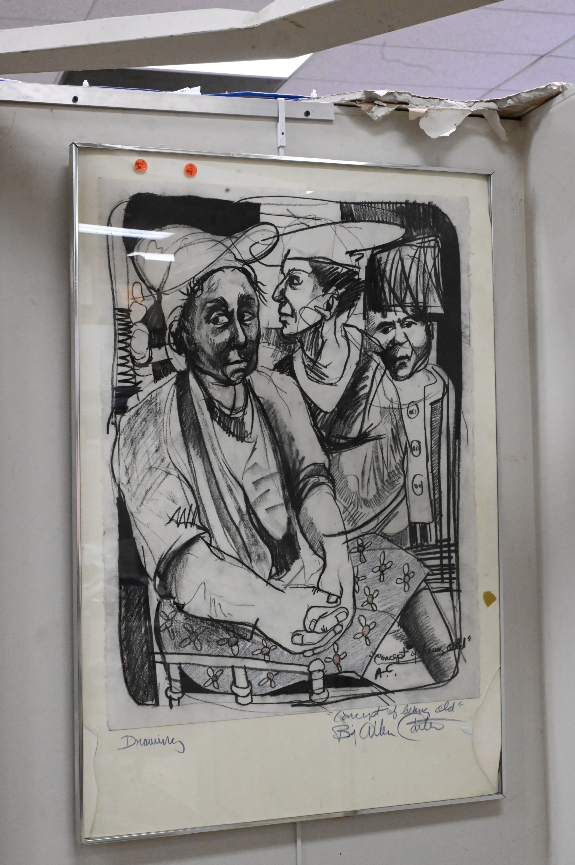 Three Piece Framed Lot, to include a charcoal on paper, drawing titled “Concept of Being Old” signed and titled twice lower right A.C. and ___ Carle, 30 1/4″ x 23″; Richard Welling a pen and ink on paper of Gillette Castle, East Haddam, CT 1919, signed “Welling, May 1924″, 17″ x 22”; along with Bruce McCombs (b.1943), etching, titled “Street Corner”, edition 112/150, signed B. McCombs lower right, 24″ x 36″.