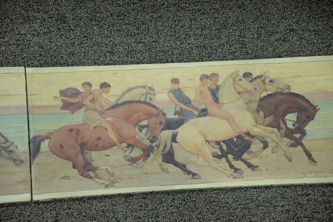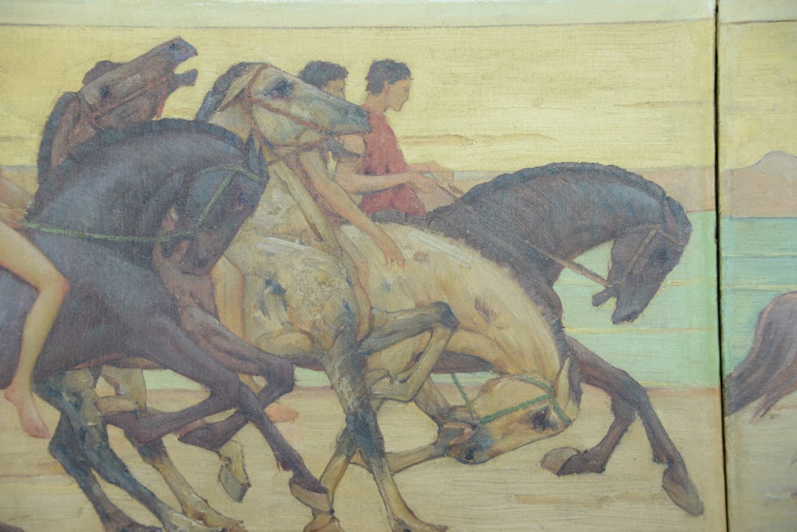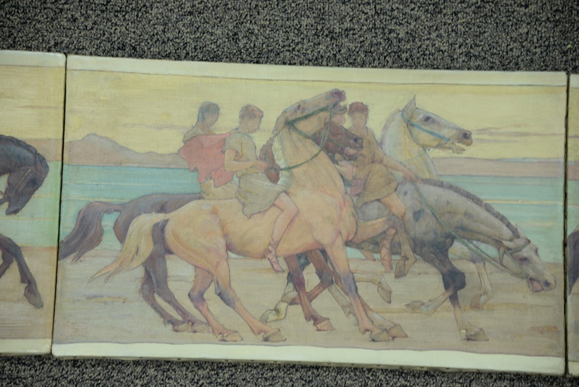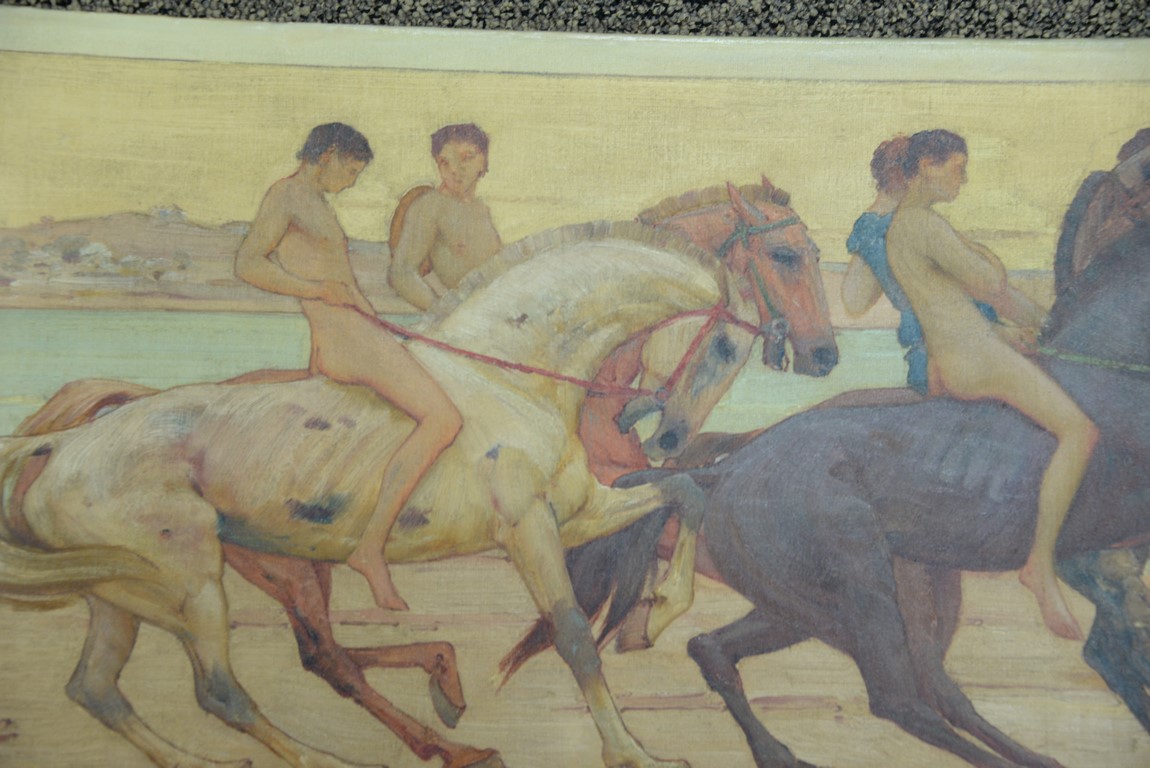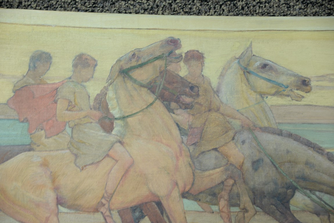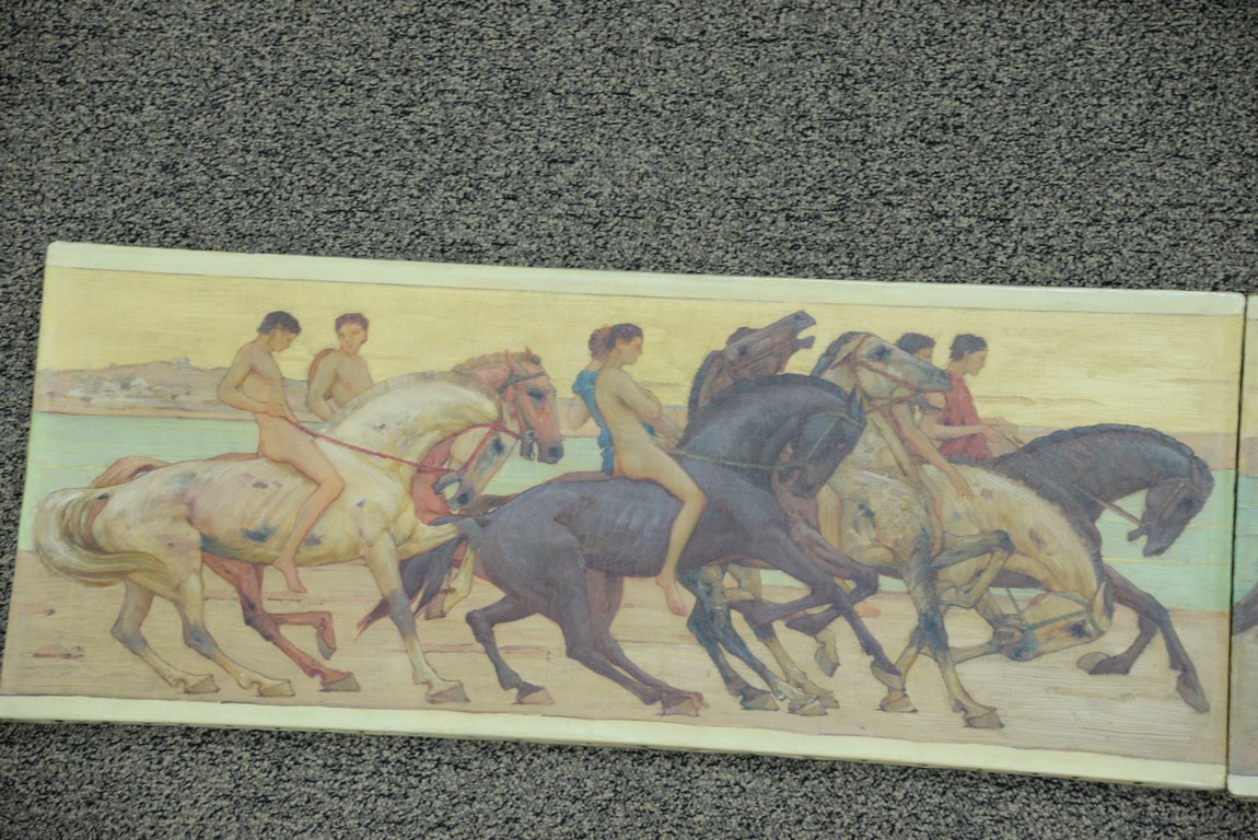 Robert Van Vorst Sewell 1860-1924 oil on canvas Triptych oil on canvas Men on Horses signed lower right RVV Sewell 1908, 15 x 99 total