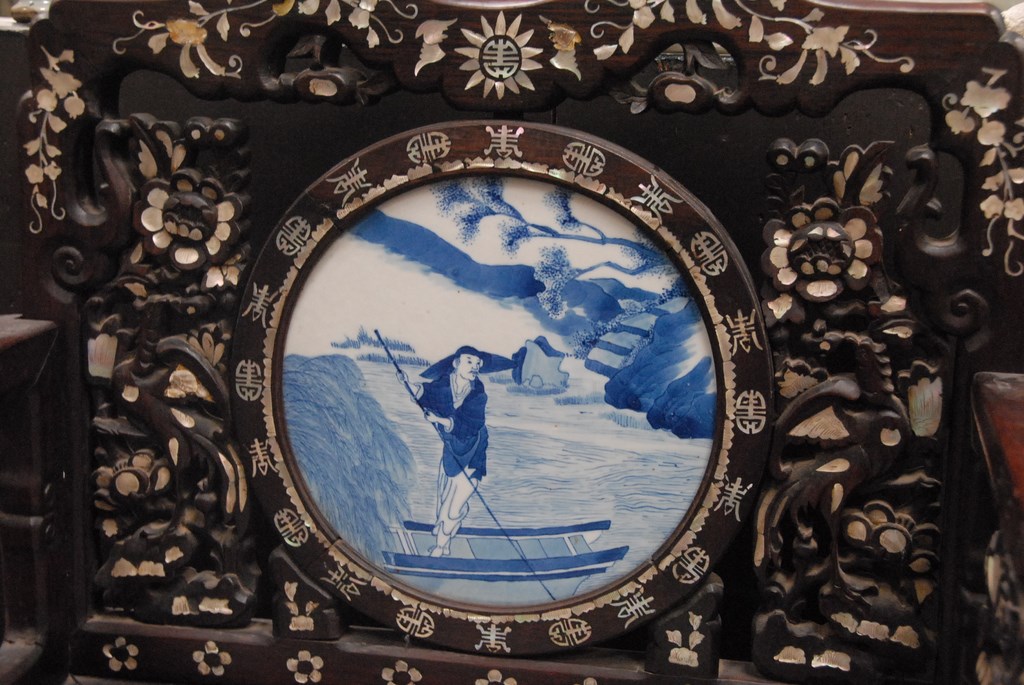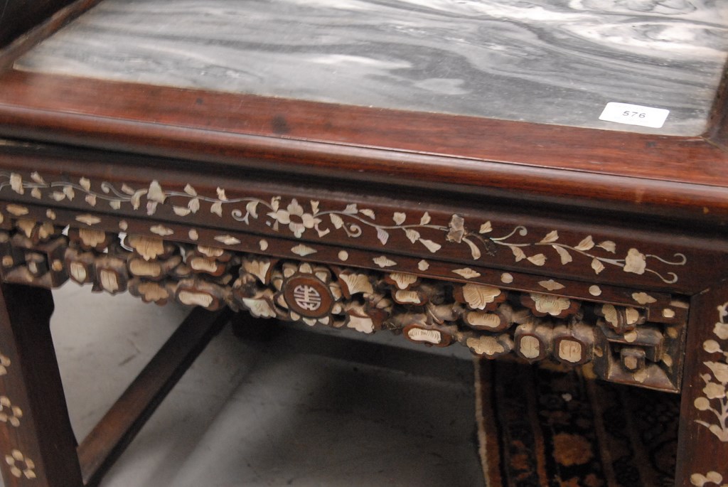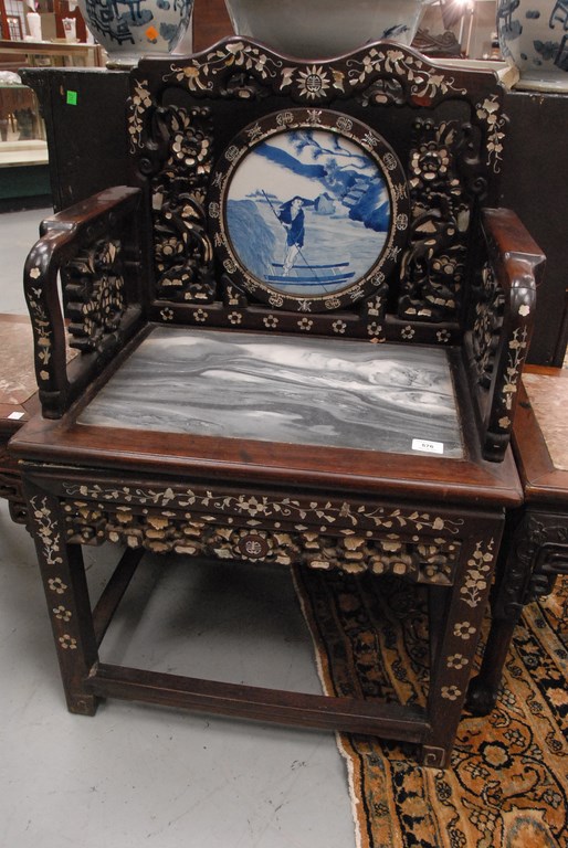 Lot 576: Chinese carved armchair, inlaid with mother of pearl back set with round porcelain blue and white plaque and inset marble seat set o…