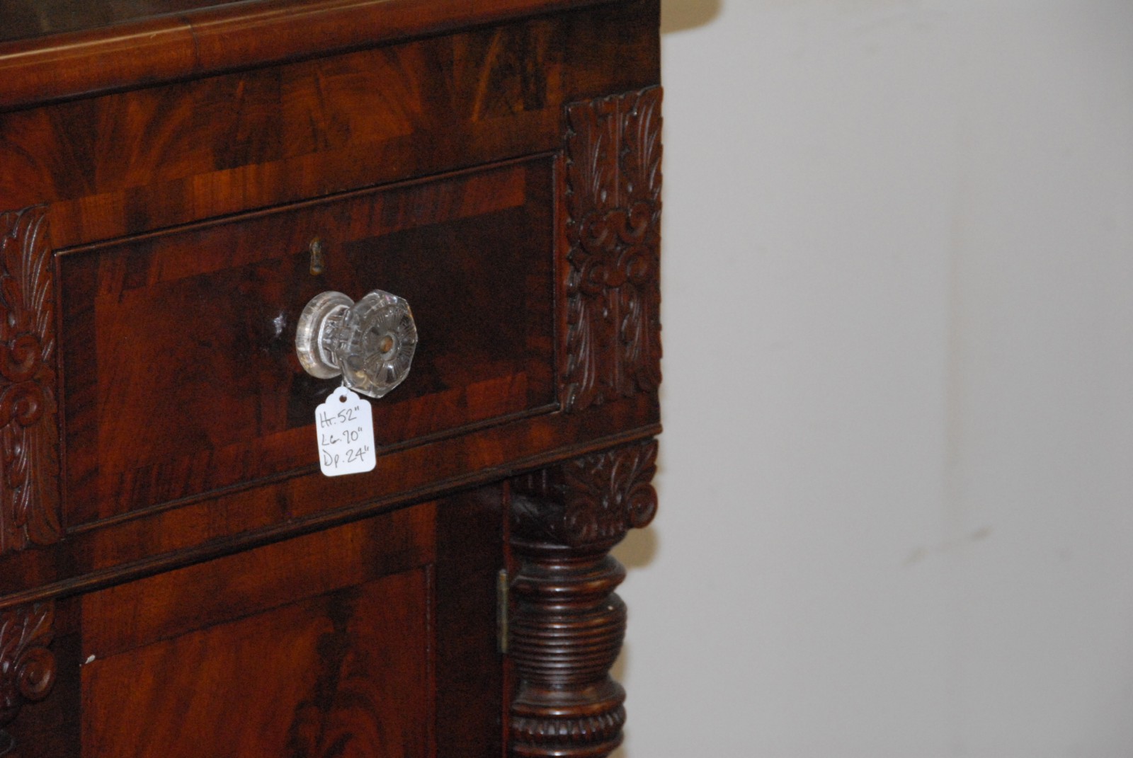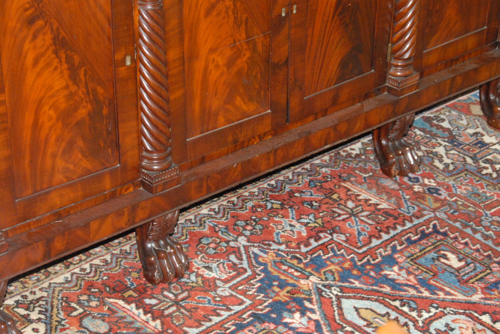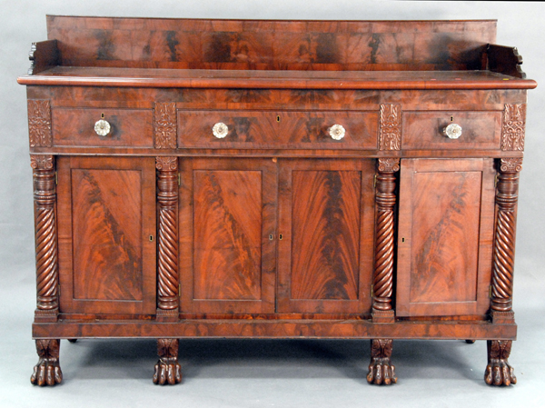 Empire mahogany sideboard with inlaid mahogany gallery, carved panels and columns three drawers and four doors all set on carved paw feet.