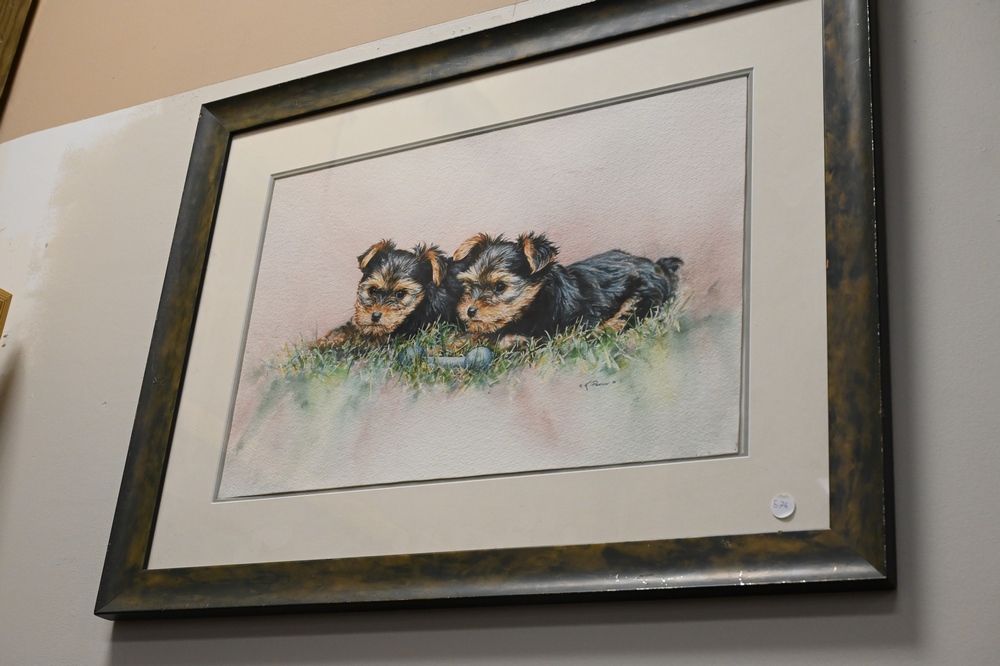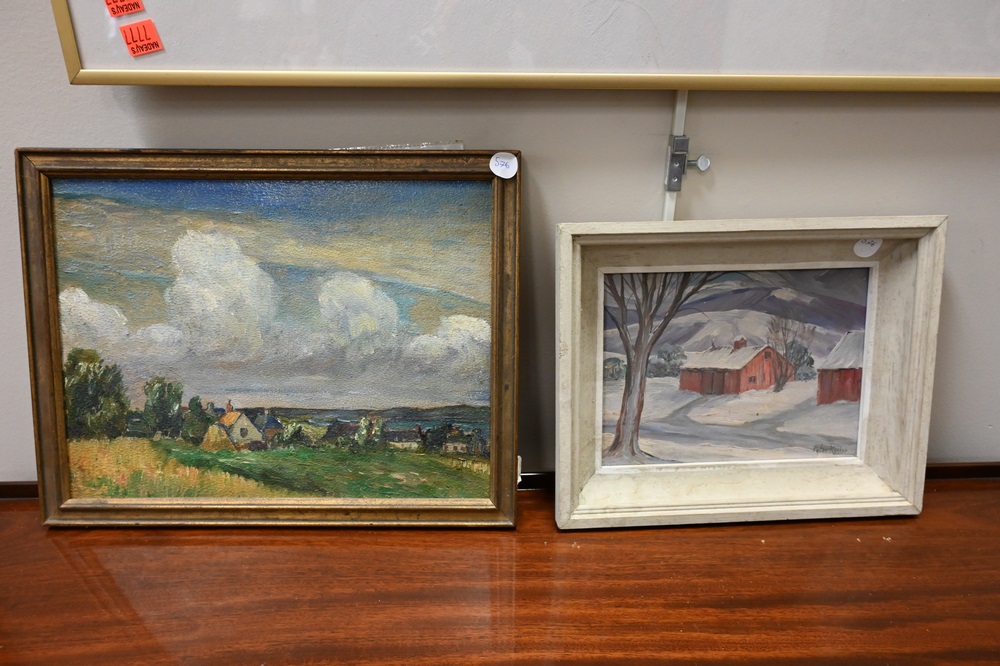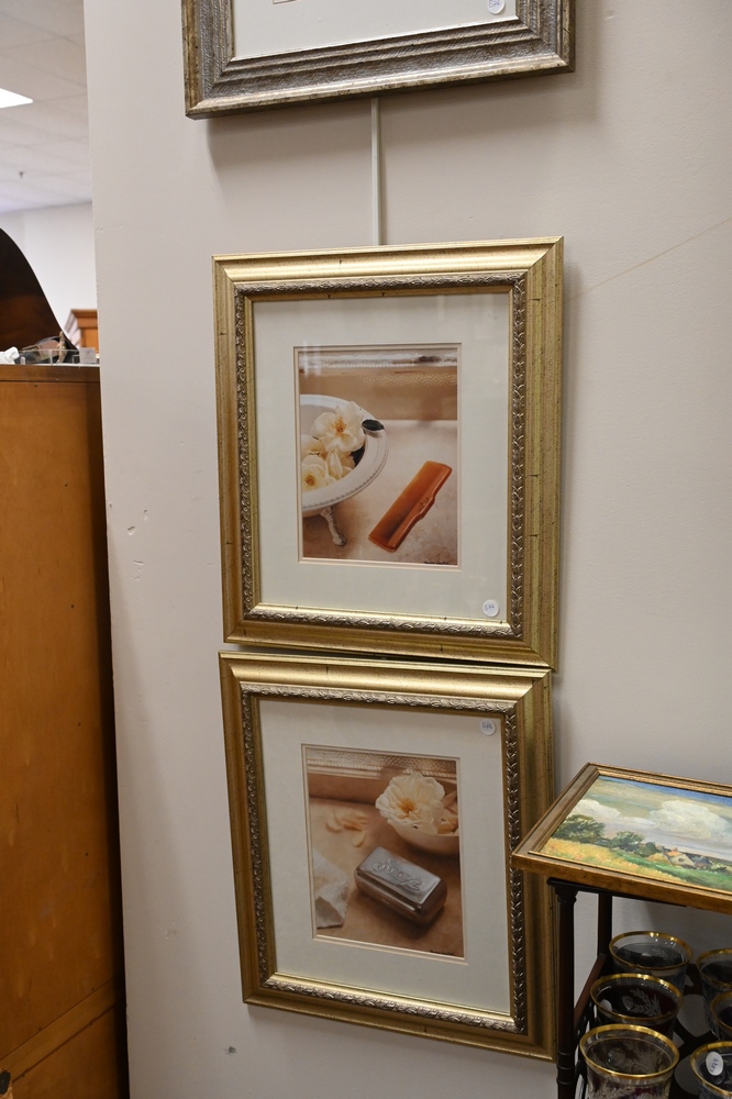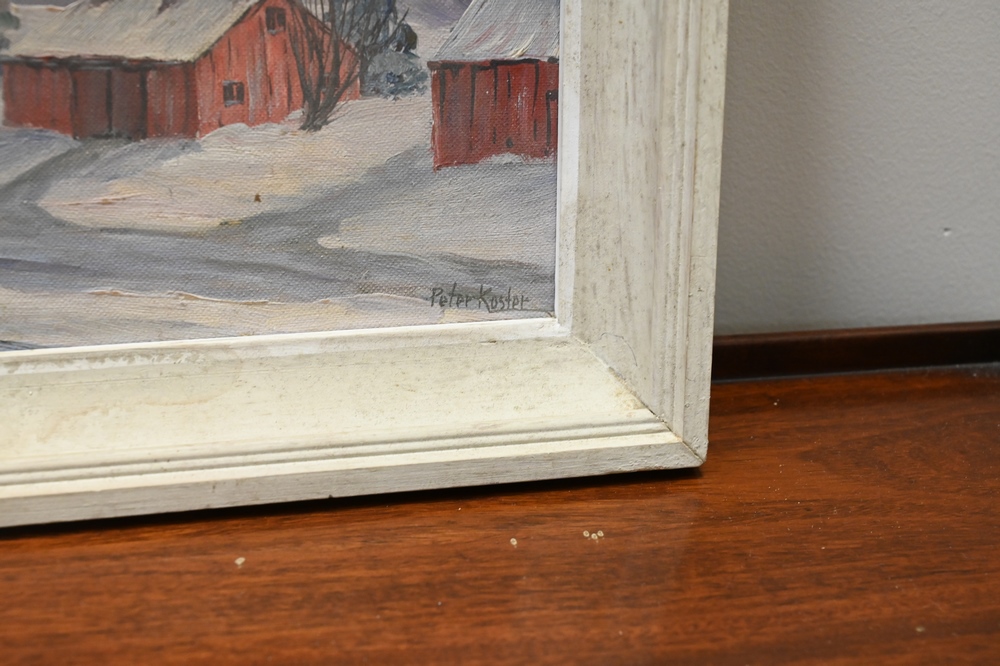 Group of 13 Framed Pieces, to include Frank Mancuso (20th century), cat looking out window, signed and dated lower right FM 90′, unframed, 36″ x 38″; Frank Mancuso (20th century), cat in garden, unsigned, unframed, 29″ x 38″; Frank Mancuso (20th century), still life flowers at window, unsigned, unframed, 38″ x 28″; Walt Disney cell, serigraph, “Sunday Drive”, in gilt frame, 9.5″ x 13.5″; oil on board, landscape, early 20th century, in gilt frame, 8.5″ x 11.5″; Peter Koster (1891-1978), oil on board, winter landscape with red bard, signed lower right, in wood frame, 5.5″ x 7.5″; Berry McLenon (20th century), watercolor, still life of pink flowers, matted in metal frame, 29.5″ x 21.5″; etc.