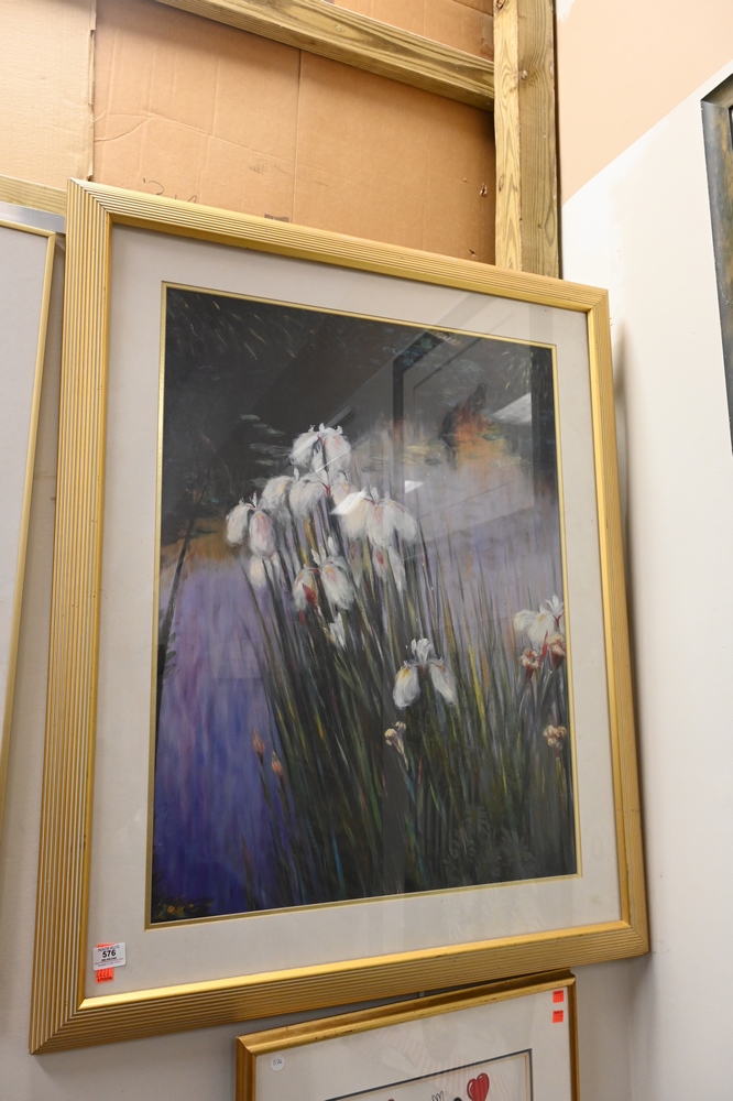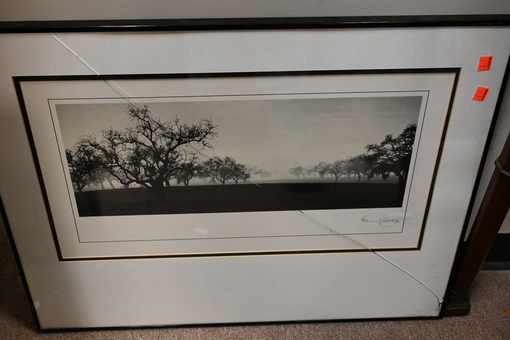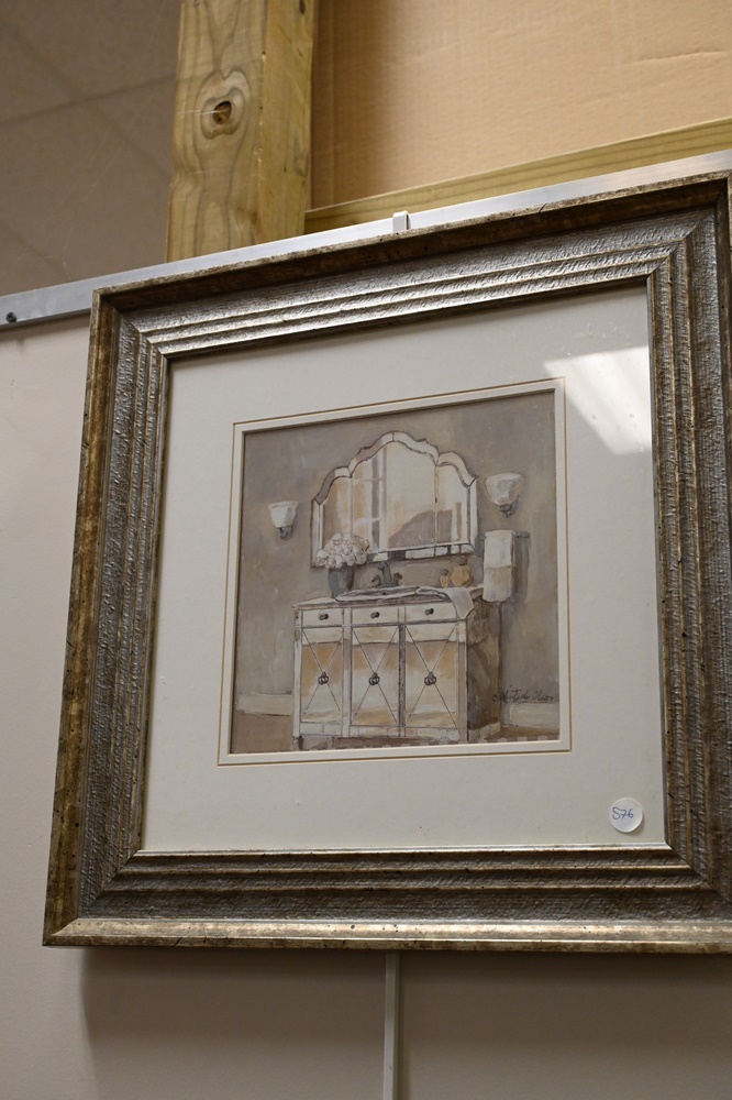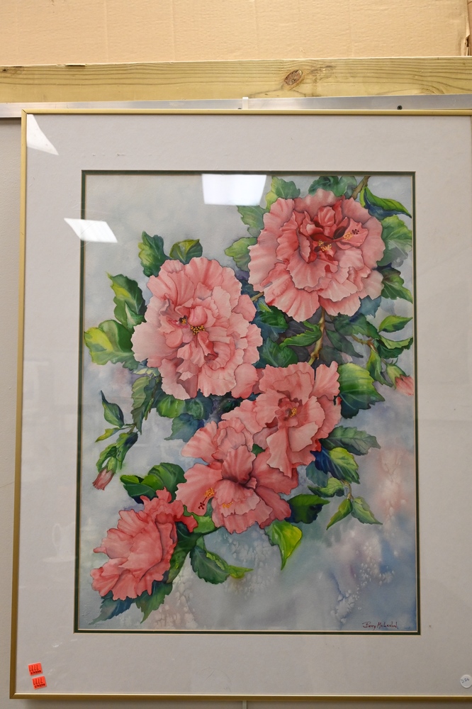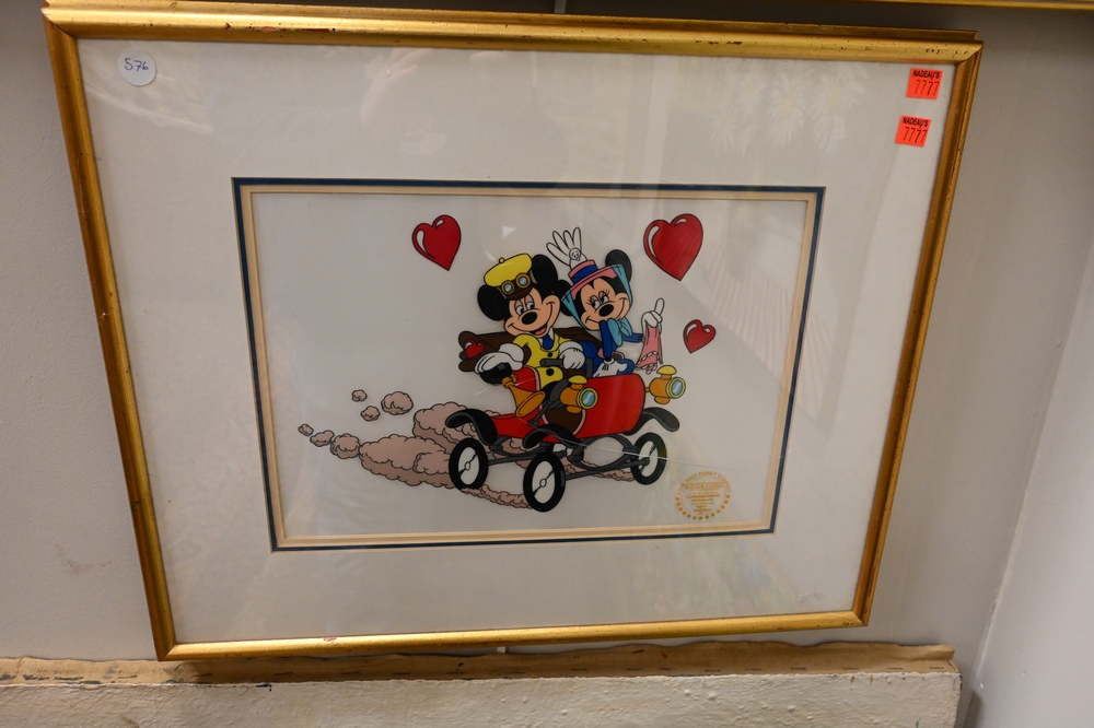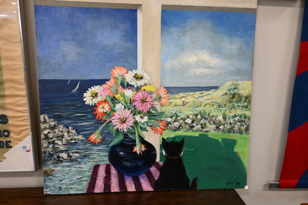 Lot 576: Group of 13 Framed Pieces, to include Frank Mancuso (20th century), cat looking out window, signed and dated lower right FM 90′, unframed, 36″ x 38″; Frank Mancuso (20th century), cat in garden, unsigned, unframed, 29″ x 38″; Frank Mancuso (20th century), still life flowers at window, unsigned, unframed, 38″ x 28″; Walt Disney cell, serigraph, “Sunday Drive”, in gilt frame, 9.5″ x 13.5″; oil on board, landscape, early 20th century, in gilt frame, 8.5″ x 11.5″; Peter Koster (1891-1978), oil on board, winter landscape with red bard, signed lower right, in wood frame, 5.5″ x 7.5″; Berry McLenon (20th century), watercolor, still life of pink flowers, matted in metal frame, 29.5″ x 21.5″; etc.