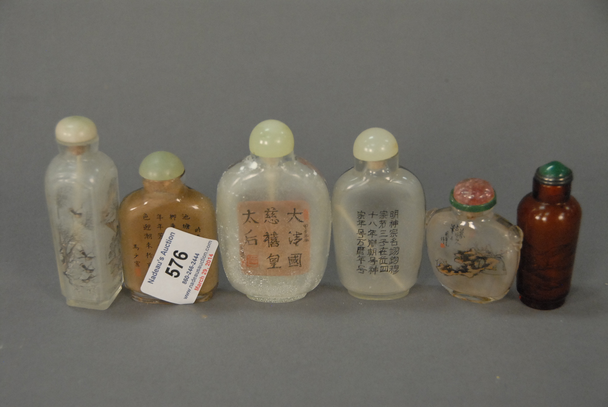 Lot 576: Group of six crystal snuff bottles to include one with guanyin, one of a scholar, two with landscapes, one with a fan, and one amber glass with landscape.