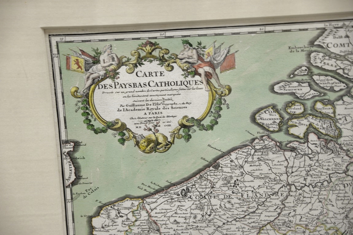 Two hand colored engravings of maps Le Duche De Stirie Suivant les dernieres observations A Paris Par et Chez le sr le Rouge Ingenieur Geographe du Roy Rue des Augustins Avec Privilege du Roy 1742 sight size: 19 x 21 1/2 and Carte Des Paysbas Catholiques, Par Guillaume de’ L’Isle Geographe du Roy De’ La cademie Royale des Sciences A Paris sight size: 19 x 24 3/4 Provenance: Property from Credit Suisse’s Americana Collection